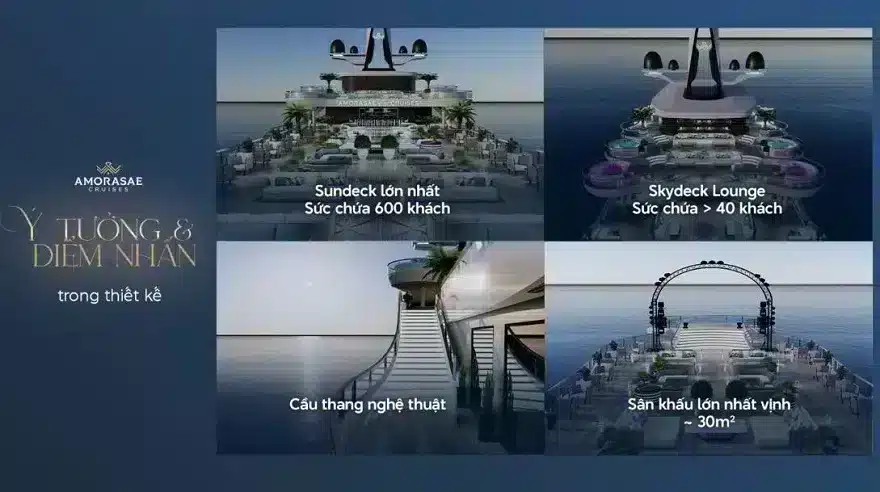 Không chỉ gây ấn tượng bởi quy mô, du thuyền Amorasae còn chinh phục du khách bằng những điểm nhấn thiết kế tinh tế. Hệ thống cầu thang nghệ thuật uốn lượn mềm mại không chỉ là lối đi mà còn là một background hoàn hảo cho những bức ảnh check-in đẳng cấp. Bên cạnh đó, sundeck khổng lồ với khả năng phục vụ cùng lúc 600 khách là không gian sự kiện ngoài trời lý tưởng cho các sự kiện trọng đại như tiệc cưới trong mơ, gala dinner hoành tráng hay các hoạt động team building của công ty.