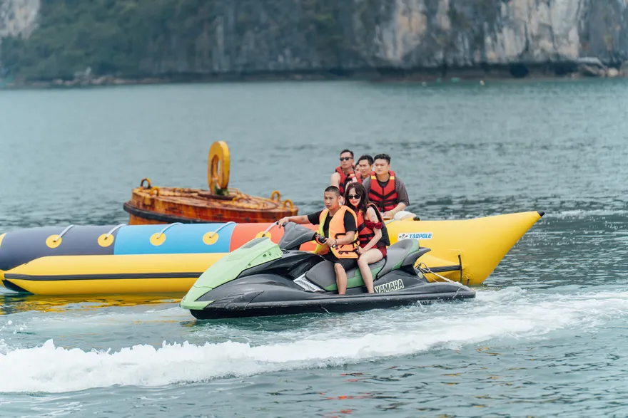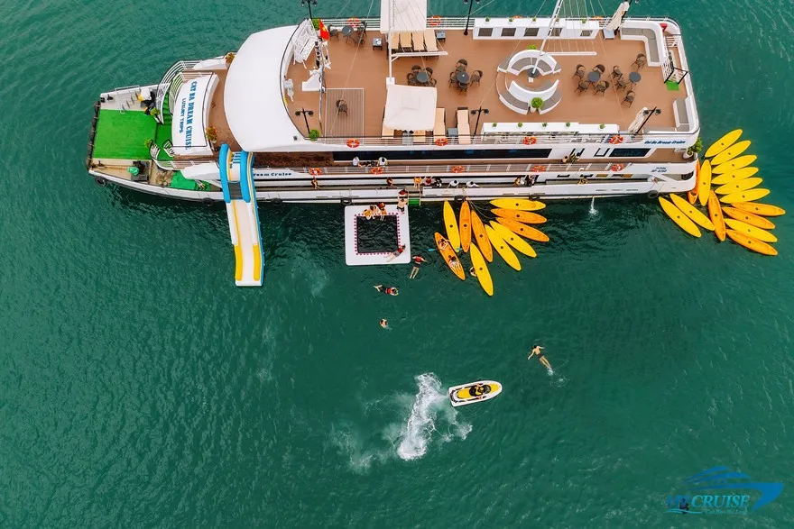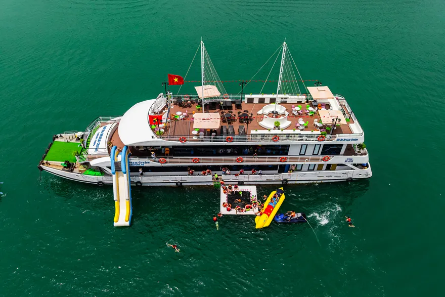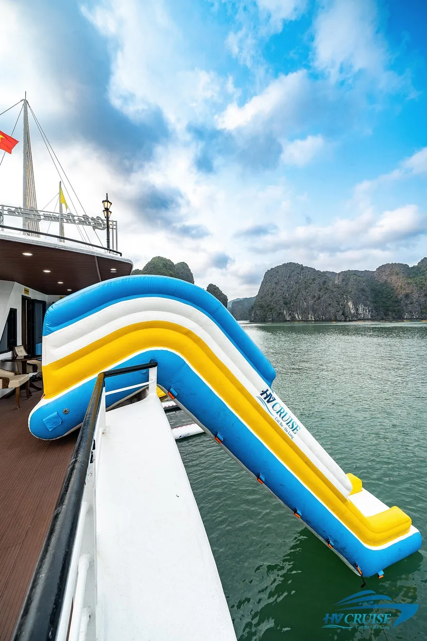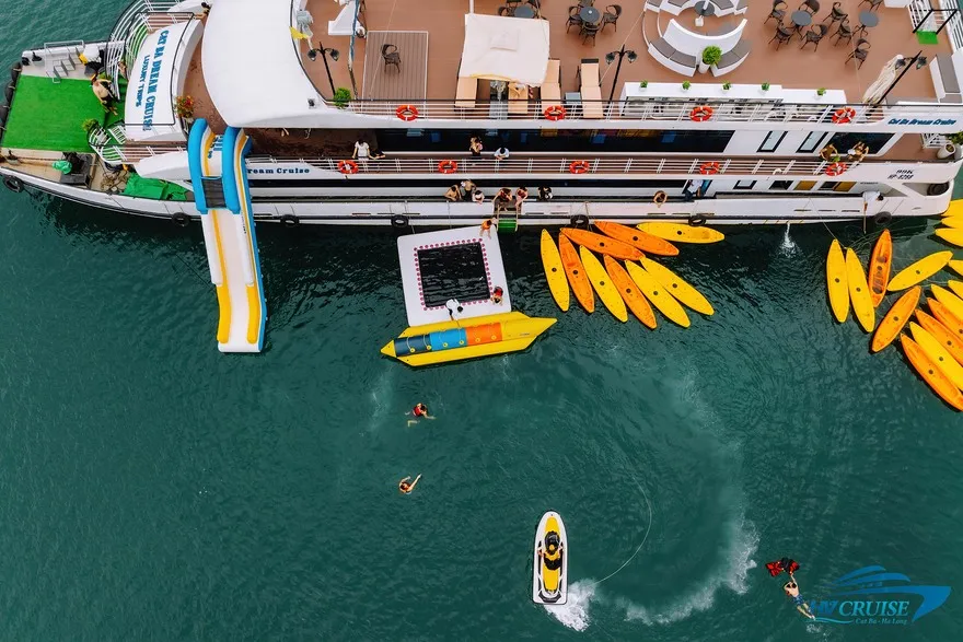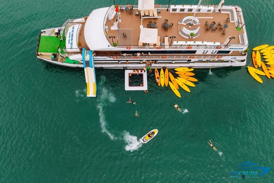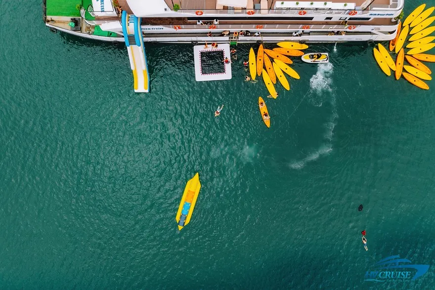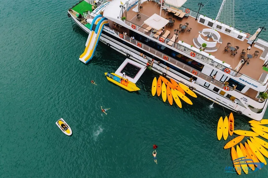 Trong hành trình, thuyền trưởng sẽ lựa chọn những điểm thả neo lý tưởng nhất để hành khách trải nghiệm các dịch vụ giải trí mặt nước. Du khách có thể tự tay chèo thuyền Kayak xuyên qua các đảo đá vôi, đắm mình trong làn nước biển trong xanh hoặc tận hưởng các tiện ích đặc trưng của du thuyền như cầu trượt phao cảm giác mạnh và bể bơi lưới dưới nước. Đối với các nhóm khách gia đình, khu vực nhà bóng dành riêng cho trẻ nhỏ là không gian vui chơi an toàn và hấp dẫn.