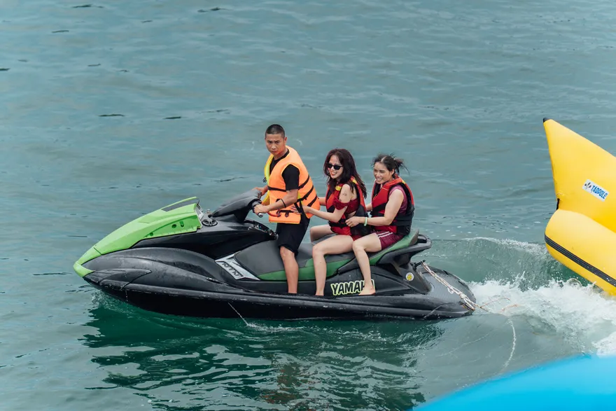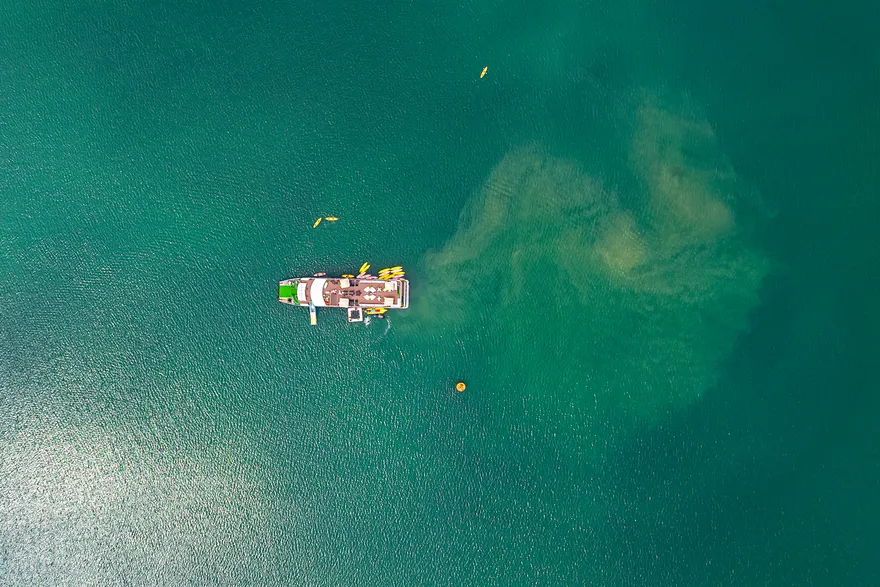 Thuyền trưởng chọn điểm thả neo để khách trải nghiệm các tiện ích: check-in, chèo thuyền Kayak, tắm biển, chơi cầu trượt cảm giác mạnh, bể bơi lưới và nhà bóng cho trẻ em.