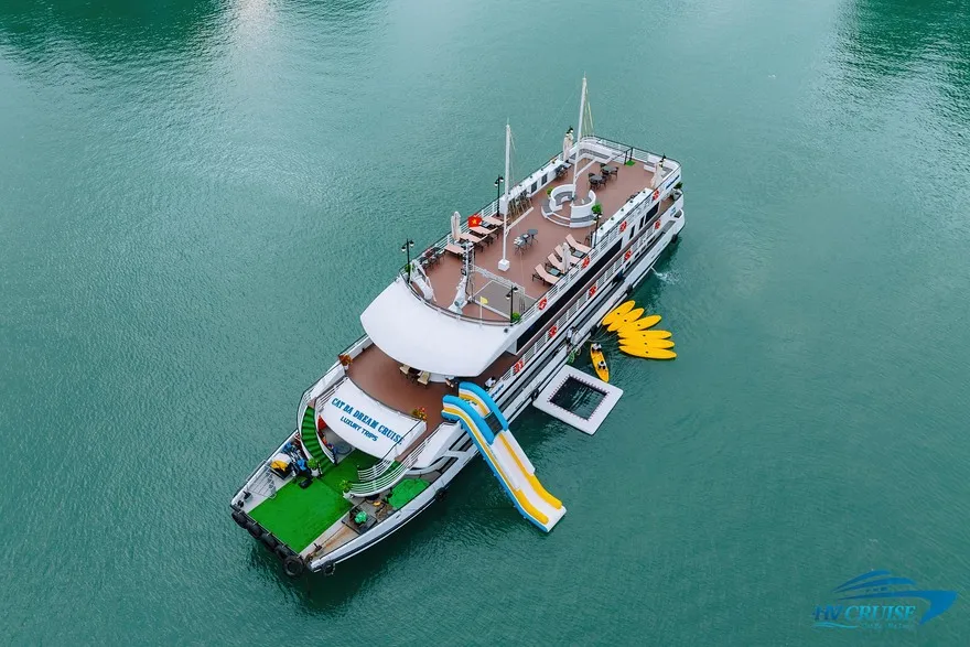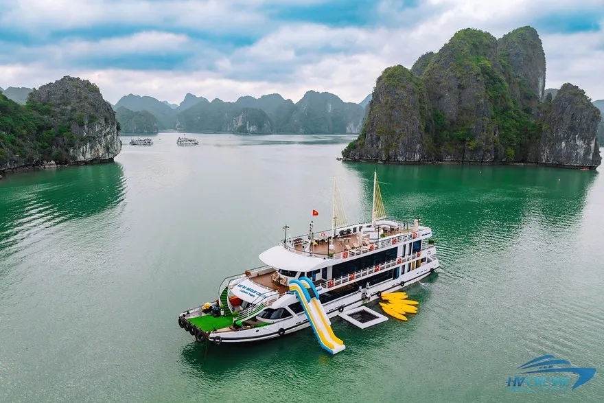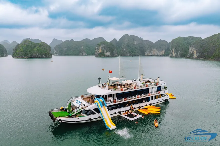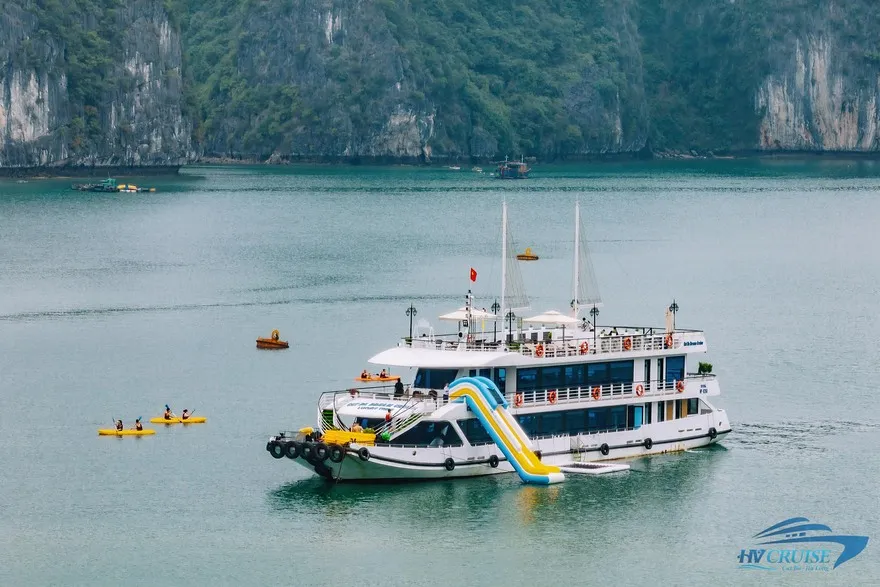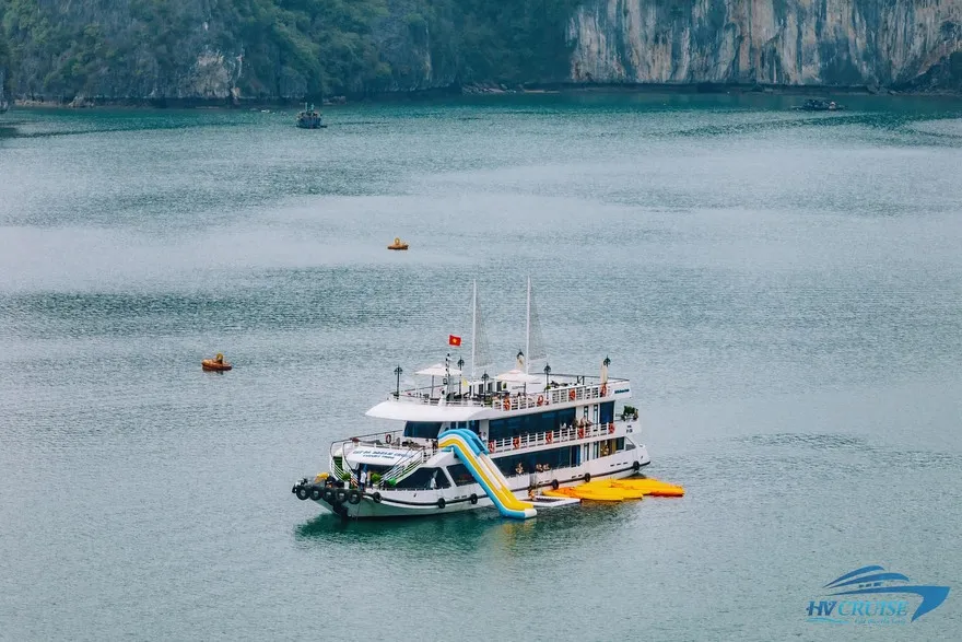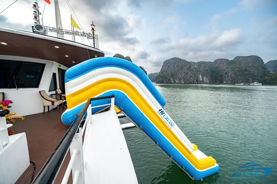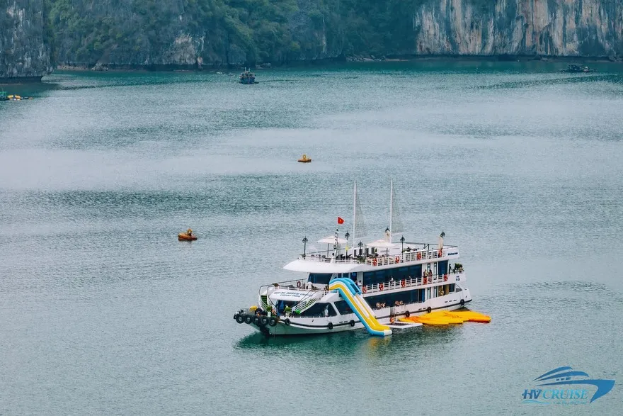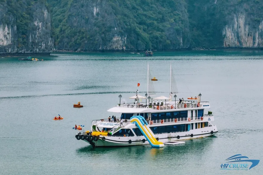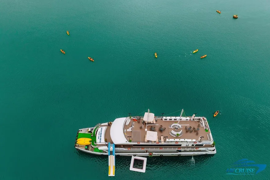 Tiếp nối lộ trình, du thuyền di chuyển vào vùng lõi của vịnh Lan Hạ, đi qua khu vực Hòn Rùa – địa danh mang tính biểu tượng để du khách chiêm ngưỡng và ghi lại những khoảnh khắc đẹp giữa không gian di sản. Tại đây, hành khách có thể tham gia các hoạt động vận động ngoài trời như chèo thuyền Kayak, tắm biển trực tiếp giữa làn nước trong xanh, hoặc thử thách với cầu trượt cảm giác mạnh và bể bơi lưới dưới nước. Đối với những hành khách nhỏ tuổi, khu vực nhà bóng chuyên dụng trên tàu là không gian vui chơi an toàn và lý tưởng.