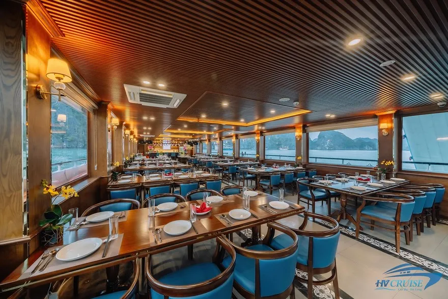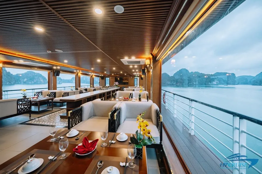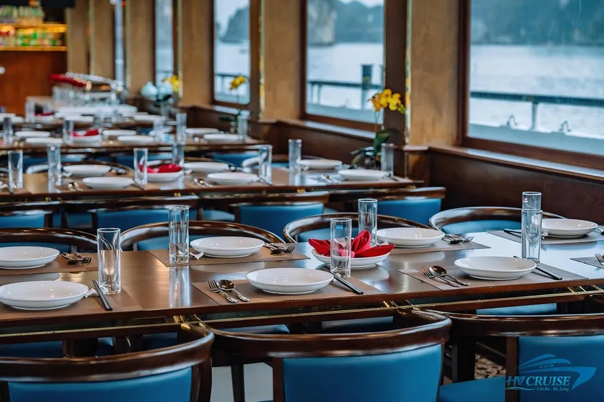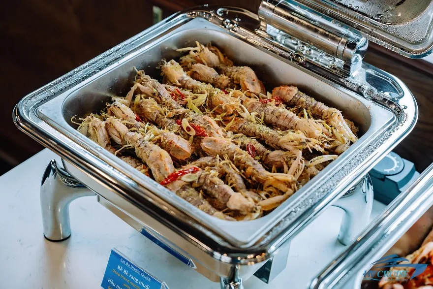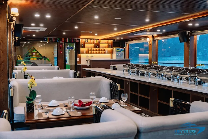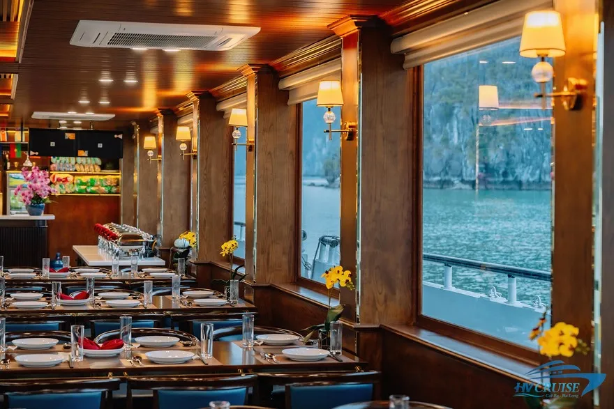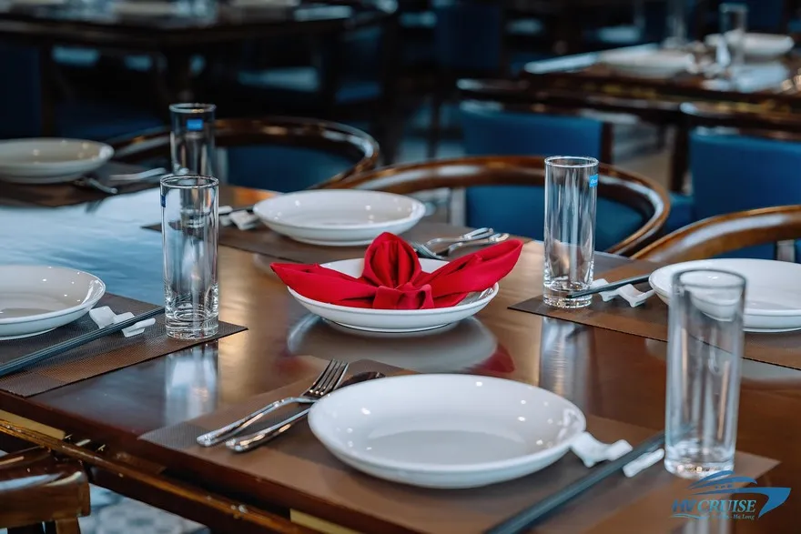 Không chỉ dừng lại ở cảnh sắc thiên nhiên hùng vĩ, linh hồn của Cat Ba Dream Cruise còn nằm ở trải nghiệm ẩm thực tinh tế và chất lượng dịch vụ chuẩn mực. Du khách sẽ được thưởng thức những bữa ăn Set menu hải sản đa dạng, phong phú được chế biến bởi đội ngũ đầu bếp tài hoa ngay tại khu vực bếp hiện đại của tàu. Mỗi món ăn đều là sự kết tinh của nguyên liệu tươi ngon địa phương hòa quyện cùng bản sắc vùng miền đặc trưng, hứa hẹn mang đến một hành trình vị giác đầy cảm xúc giữa lòng vịnh di sản. Dù là bữa trưa thư thái hay bữa tối lãng mạn, không gian nhà hàng tại tầng 1 và tầng 2 luôn đảm bảo sự sang trọng và ấm cúng cho mọi thực khách.