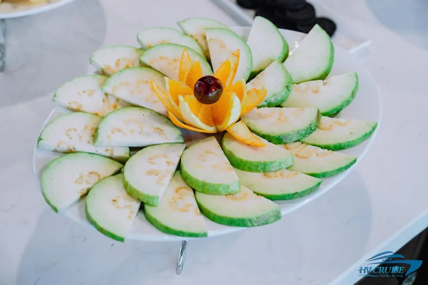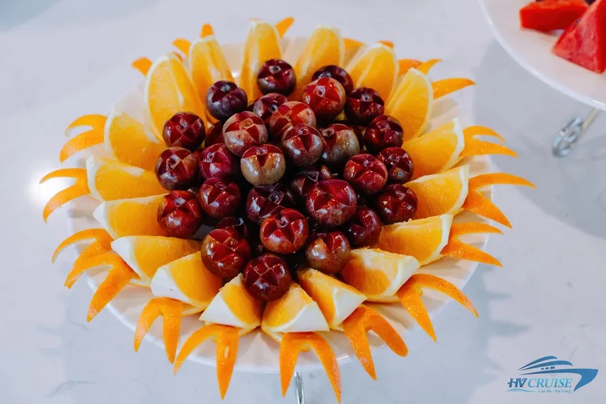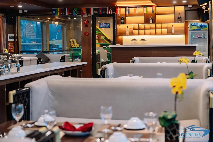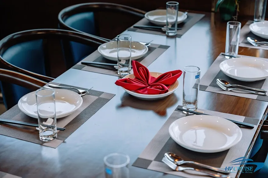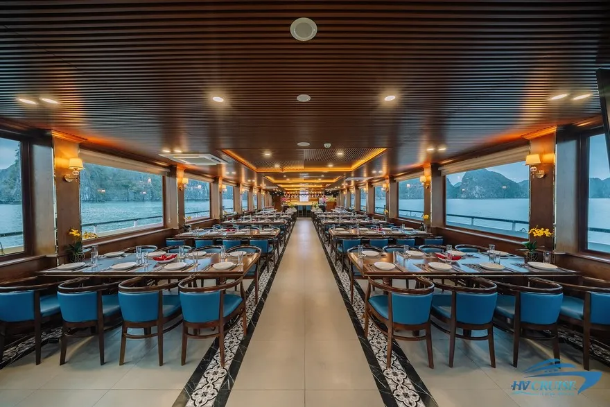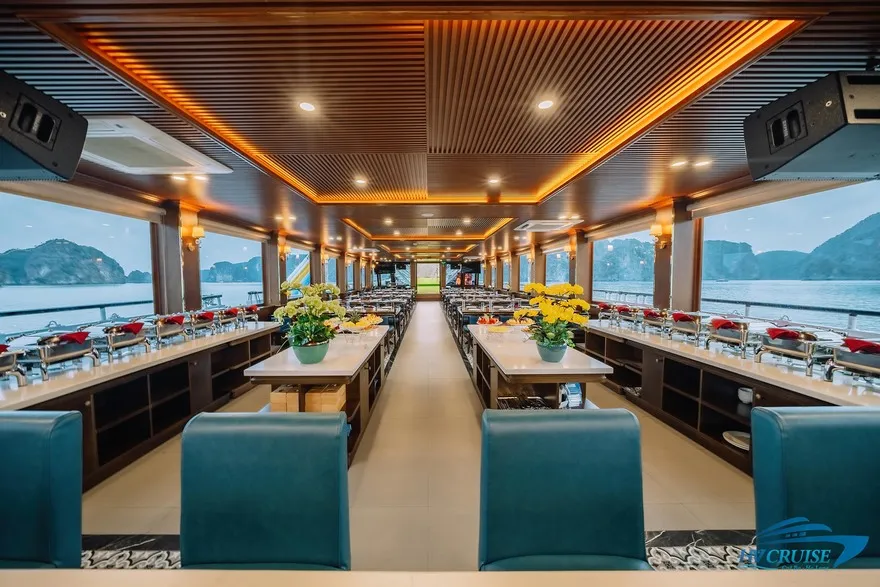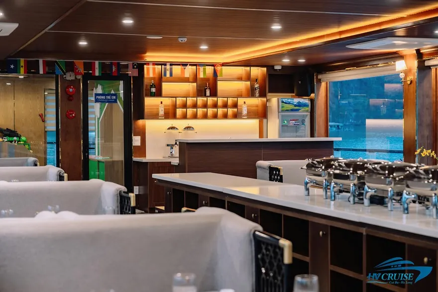 Không chỉ dừng lại ở cảnh sắc thiên nhiên hùng vĩ, linh hồn của Cat Ba Dream Cruise còn nằm ở trải nghiệm ẩm thực tinh tế và chất lượng dịch vụ chuẩn mực. Du khách sẽ được thưởng thức những bữa ăn Set menu hải sản đa dạng, phong phú được chế biến bởi đội ngũ đầu bếp tài hoa ngay tại khu vực bếp hiện đại của tàu. Mỗi món ăn đều là sự kết tinh của nguyên liệu tươi ngon địa phương hòa quyện cùng bản sắc vùng miền đặc trưng, hứa hẹn mang đến một hành trình vị giác đầy cảm xúc giữa lòng vịnh di sản. Dù là bữa trưa thư thái hay bữa tối lãng mạn, không gian nhà hàng tại tầng 1 và tầng 2 luôn đảm bảo sự sang trọng và ấm cúng cho mọi thực khách.