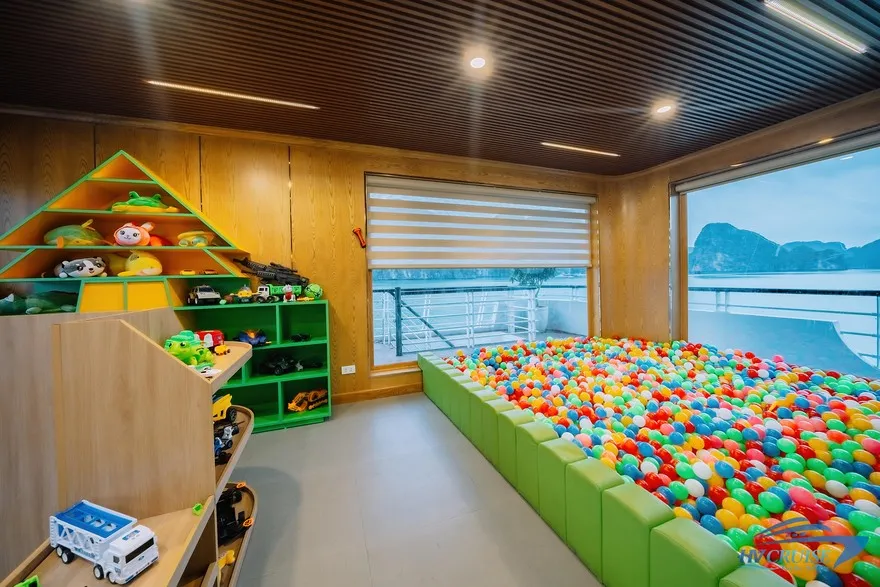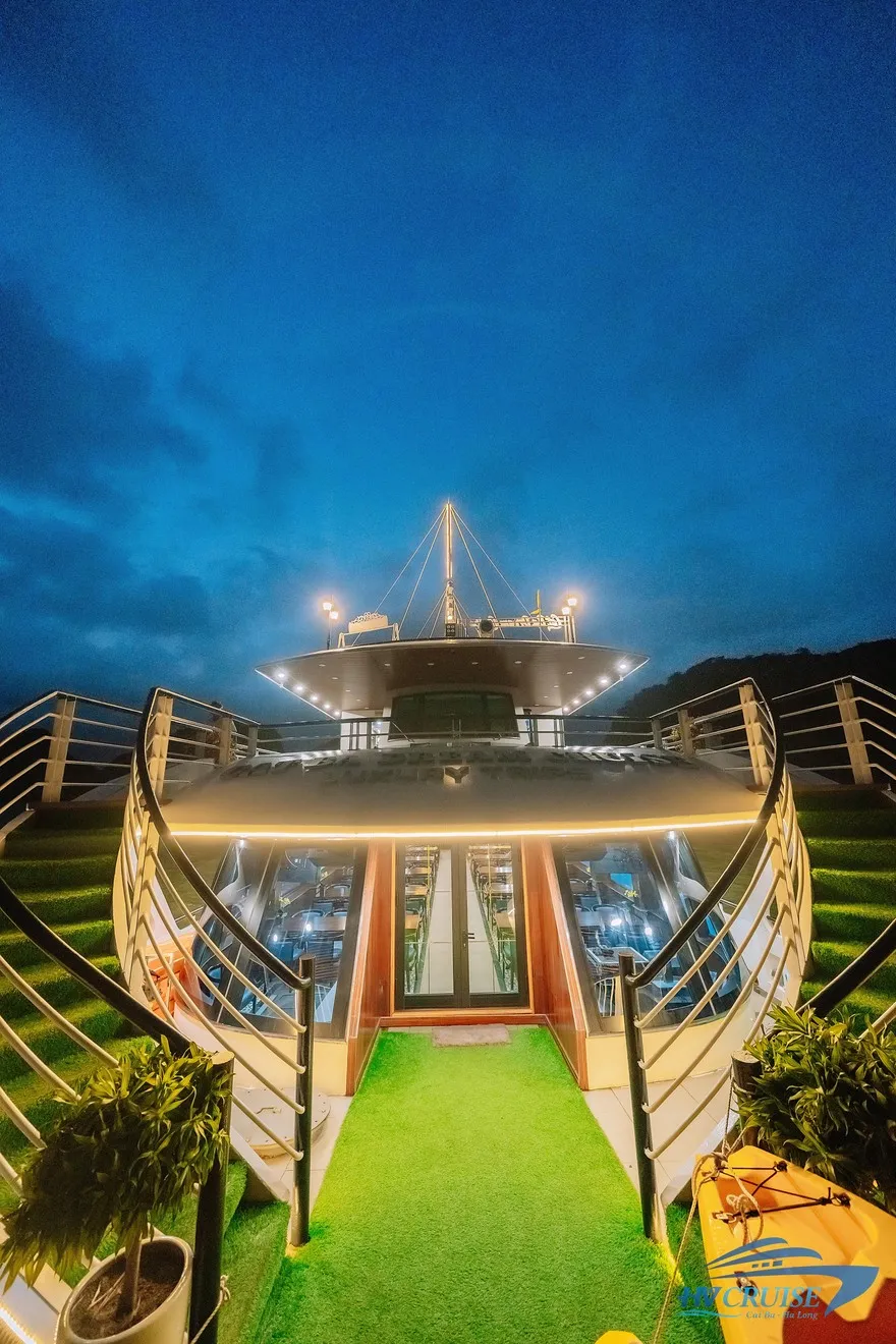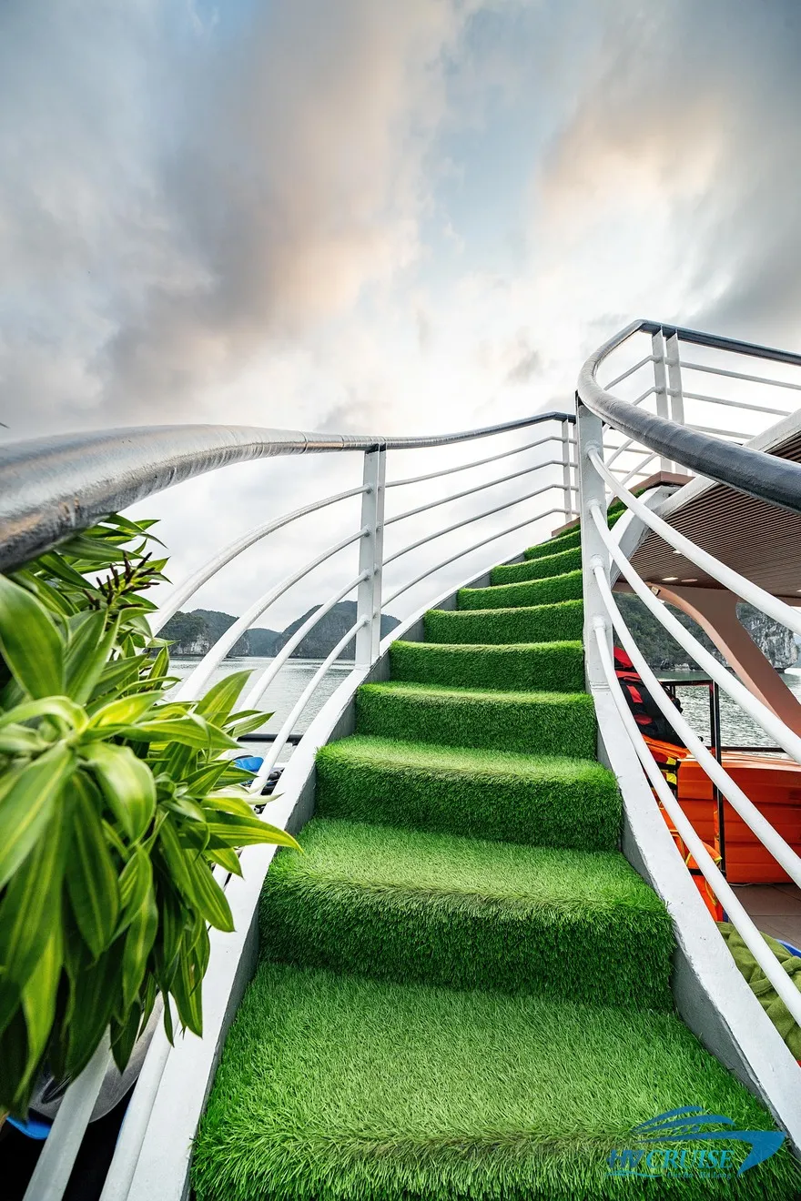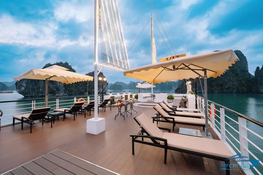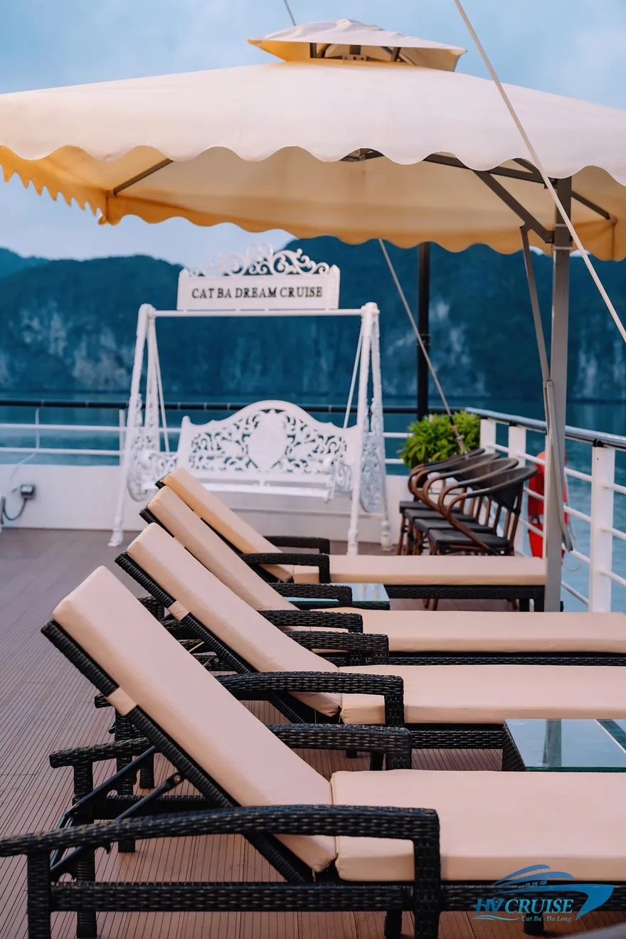 Khu vực tầng 3 (Sundeck) được thiết kế mở hoàn toàn, phục vụ nhu cầu ngắm cảnh toàn cảnh và thư giãn với hệ thống ghế tắm nắng chuyên dụng. Tại đây, một khung treo Backdrop chuyên dụng với kích thước rộng 3m và cao 2,5m được lắp đặt sẵn, đáp ứng tiêu chuẩn cho các hoạt động ghi hình chuyên nghiệp hoặc sự kiện đoàn thể. Để đa dạng hóa trải nghiệm vận động, du thuyền còn tích hợp các tiện ích giải trí ngoài trời như cầu trượt phao cảm giác mạnh và hệ thống bể bơi lưới dưới nước, cho phép hành khách tiếp cận trực tiếp với mặt biển trong môi trường được kiểm soát an toàn.