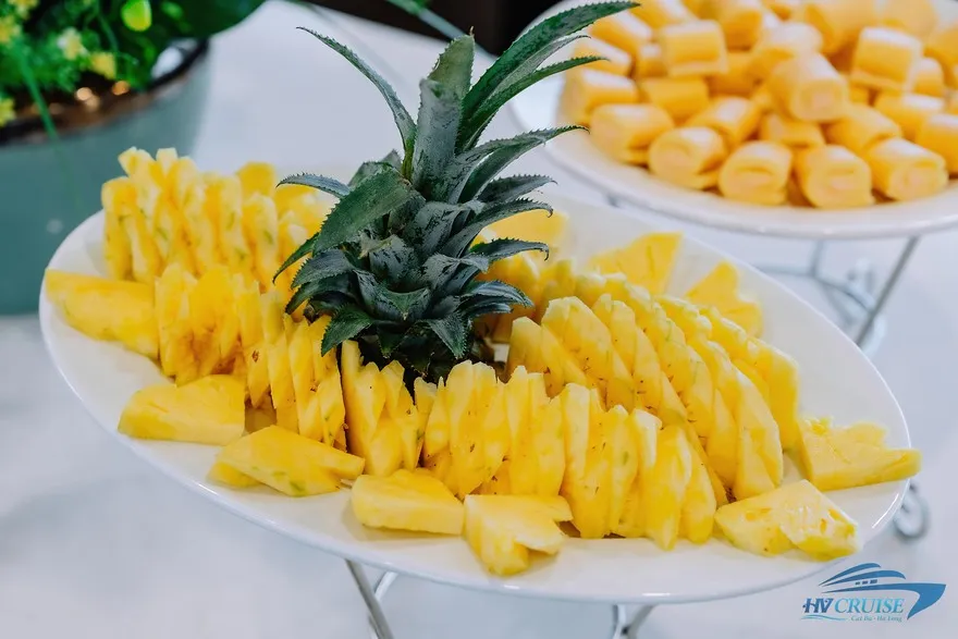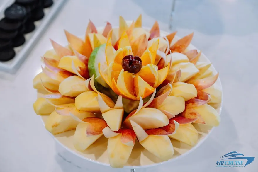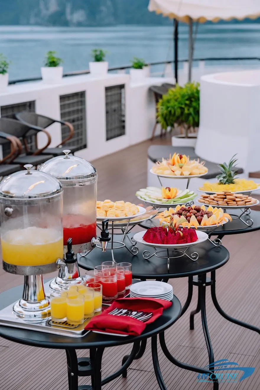 Vào thời điểm mặt trời lặn, một bữa tiệc trà chiều (Sunset Party) được chuẩn bị chu đáo tại không gian tầng 2 hoặc tầng 3 của tàu. Trong không khí lãng mạn của hoàng hôn trên vịnh, du khách sẽ thưởng thức hoa quả tươi, bánh ngọt và nước mát hòa cùng những bản nhạc chill nhẹ nhàng. Đây là khoảng thời gian thư giãn cần thiết để chuẩn bị cho trải nghiệm ẩm thực chính vào buổi tối.