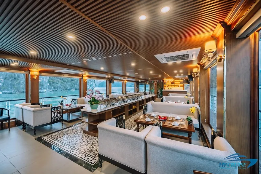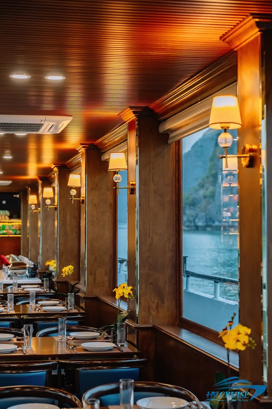 Bữa trưa với thực đơn Set menu hải sản phong phú được phục vụ tại hệ thống nhà hàng sang trọng trên tầng 1 và tầng 2 của du thuyền. Các món ăn được chế biến trực tiếp bởi đội ngũ đầu bếp chuyên nghiệp, đảm bảo sự đa dạng và hương vị tươi ngon cho thực khách.
