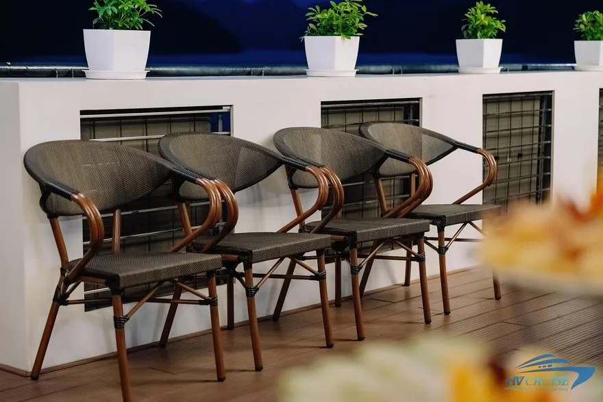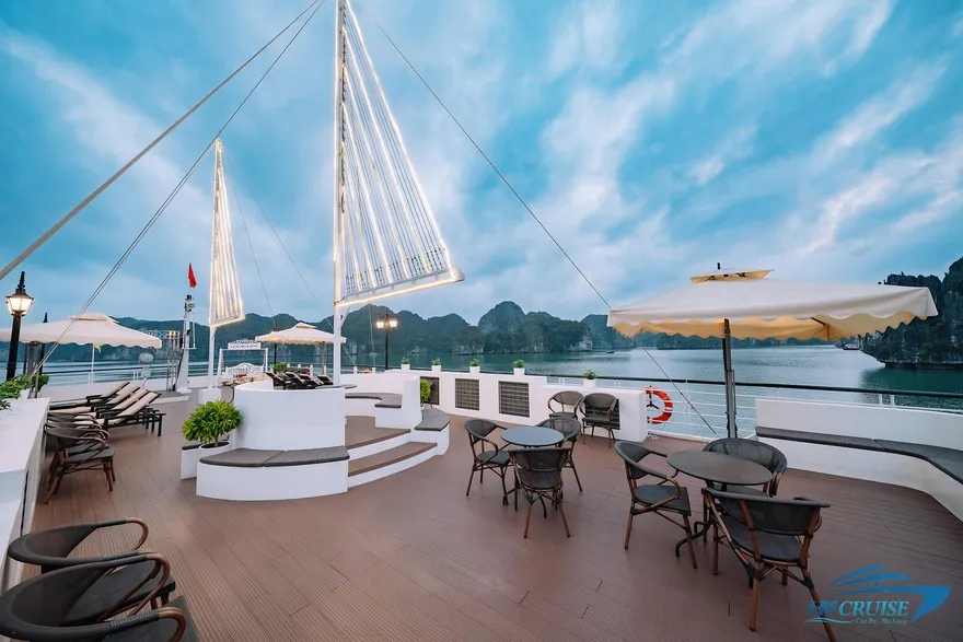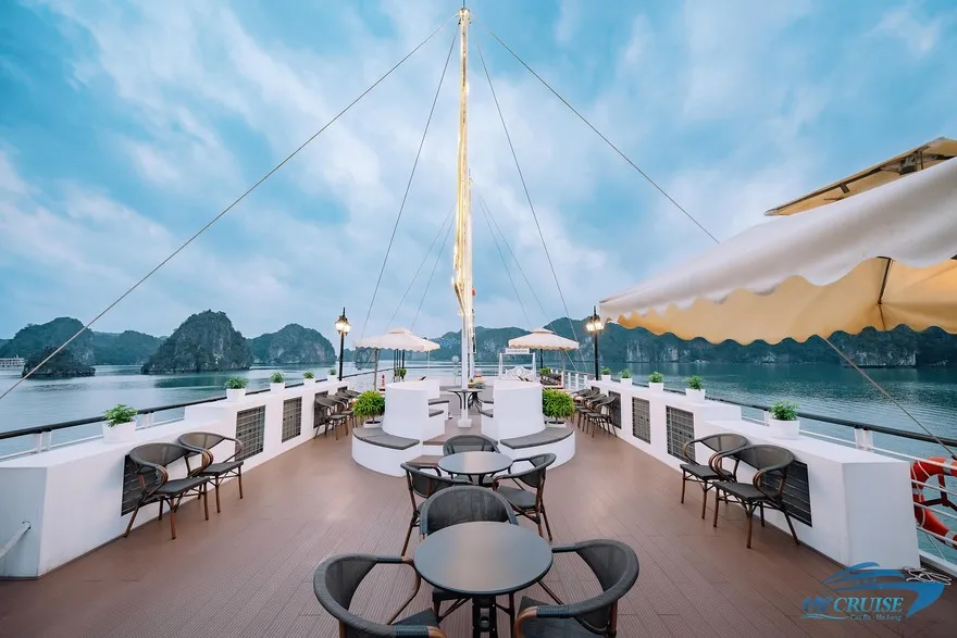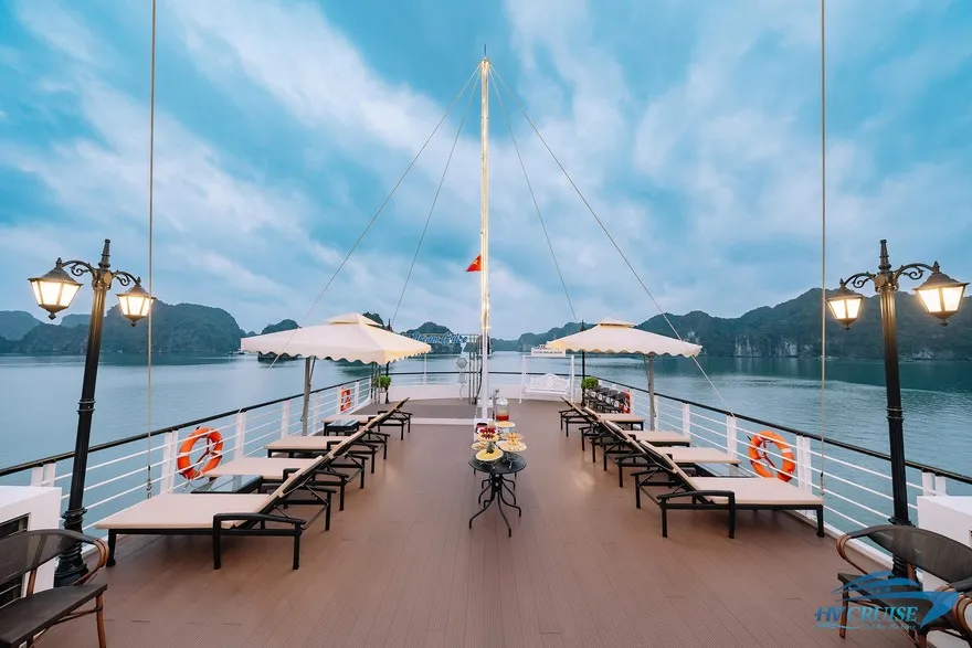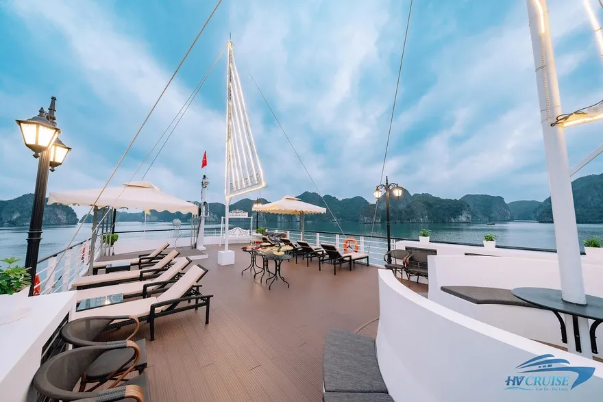 Ngắm hoàng hôn trên boong tàu và thưởng thức tiệc trà chiều cùng thư giãn và ngắm lại toàn cảnh Vịnh Lan Hạ.