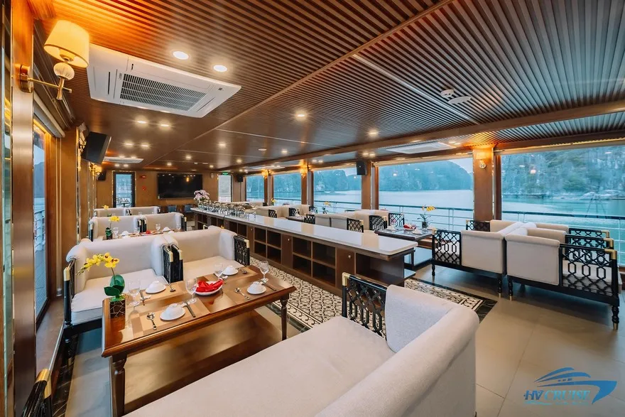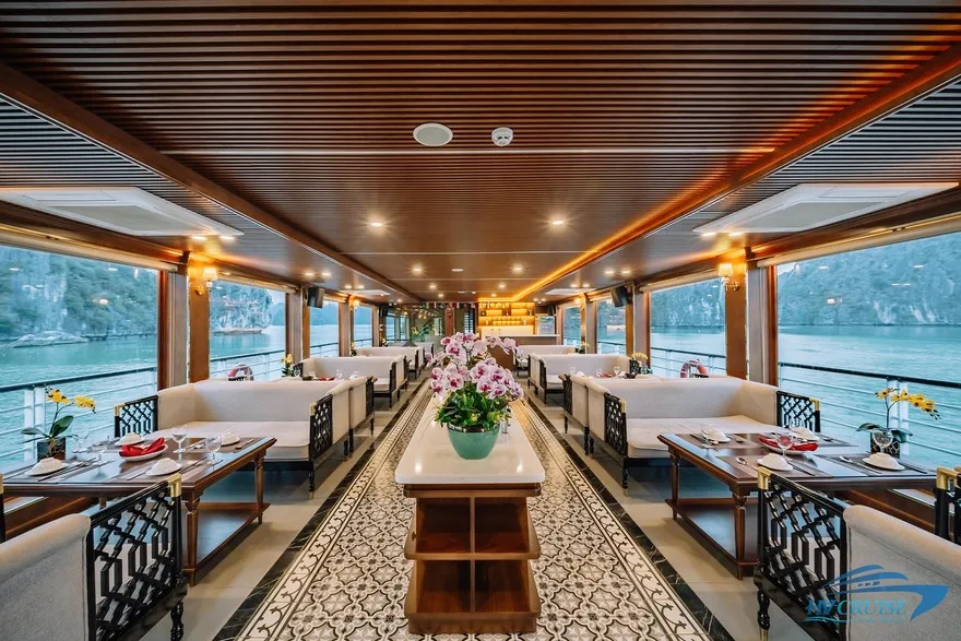 Hệ thống hạ tầng của du thuyền được phân bổ khoa học trên ba tầng chức năng nhằm tối đa hóa diện tích sử dụng và trải nghiệm cho hành khách. Tại tầng 1, không gian được ưu tiên cho khu vực đón tiếp và nhà hàng chính với sức chứa 80 khách. Khu vực này tích hợp đầy đủ các trang thiết bị phục vụ sự kiện và giải trí như dàn âm thanh karaoke, màn hình hiện đại, wifi tốc độ cao cùng hệ thống điều hòa âm trần vận hành xuyên suốt hải trình.