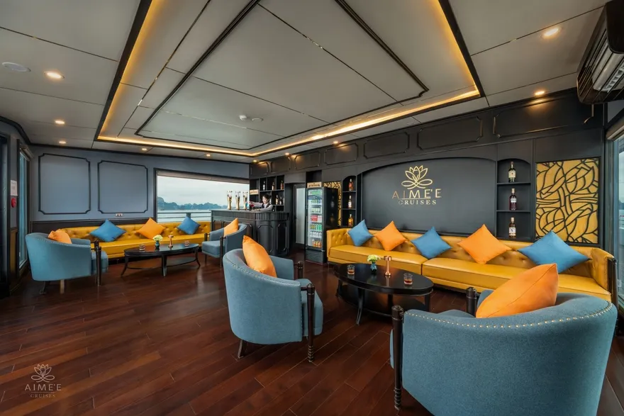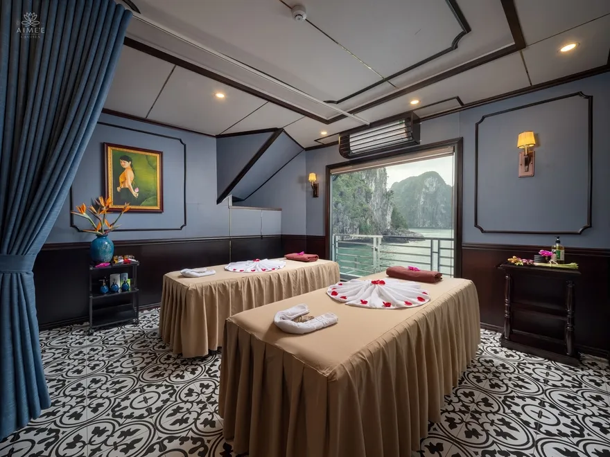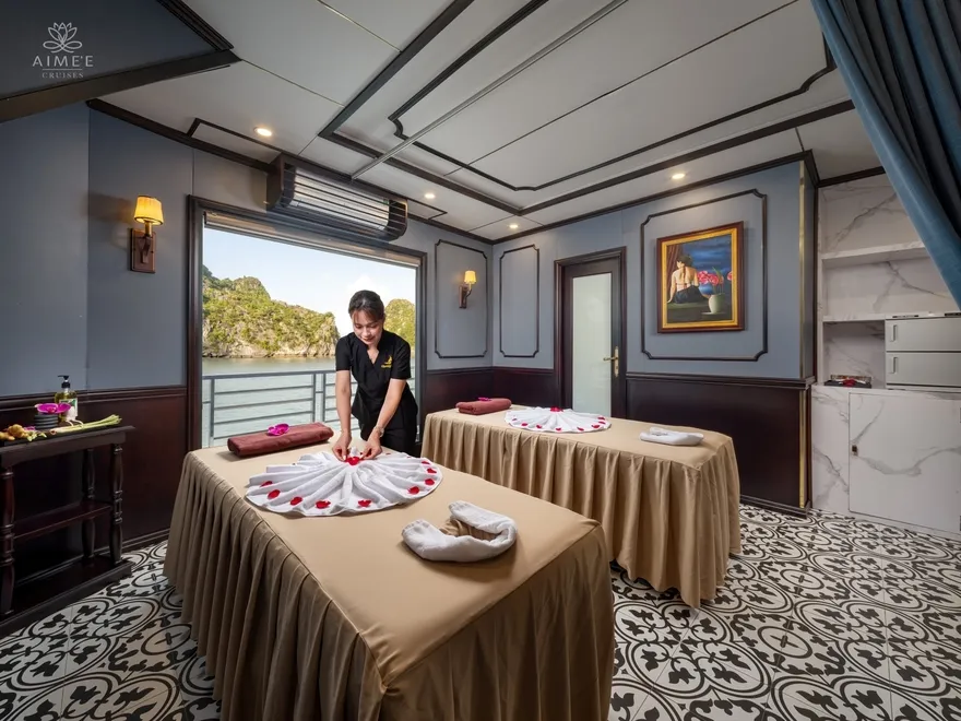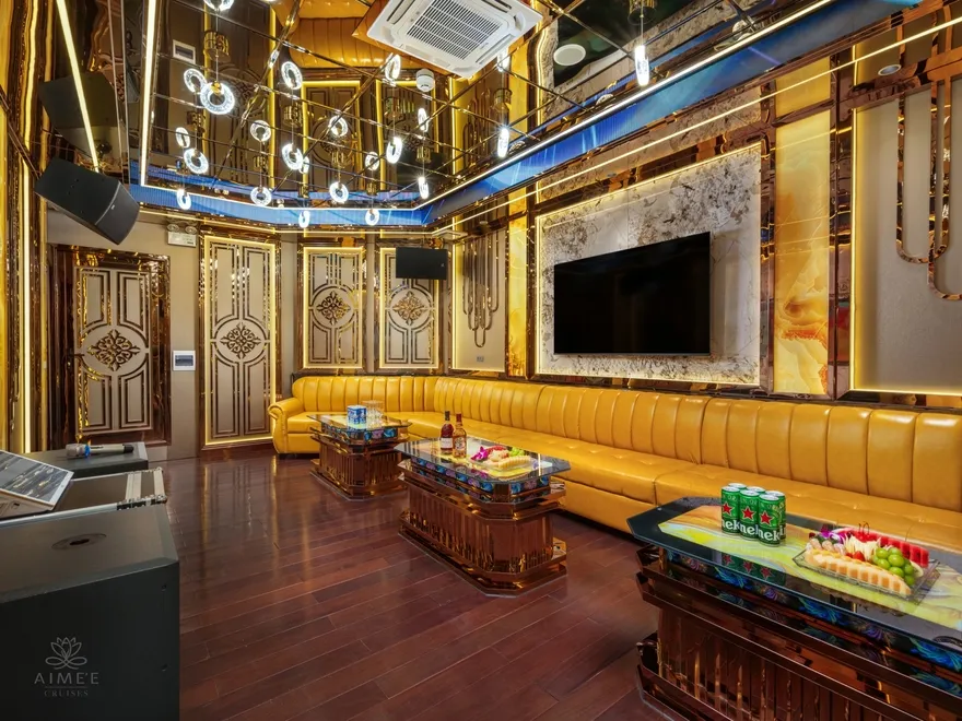 Không dừng lại ở đó, Aime’e Cruises còn mang đến những tiện ích giải trí và sức khỏe hiện đại thường chỉ thấy tại các resort cao cấp trên đất liền. Du khách có thể duy trì thói quen tập luyện tại phòng Gym hiện đại với tầm nhìn hướng ra những đảo đá vôi hùng vĩ, hoặc bùng nổ cảm xúc cùng người thân trong không gian riêng tư của phòng Karaoke sang trọng trên tầng Sun Deck. Sự kết hợp hoàn hảo giữa các khu vực chăm sóc sức khỏe, ẩm thực và giải trí đã biến Aime’e thành một hệ sinh thái nghỉ dưỡng khép kín, nơi mỗi yêu cầu của khách hàng đều được đáp ứng bằng sự chuyên nghiệp và tận tâm nhất.