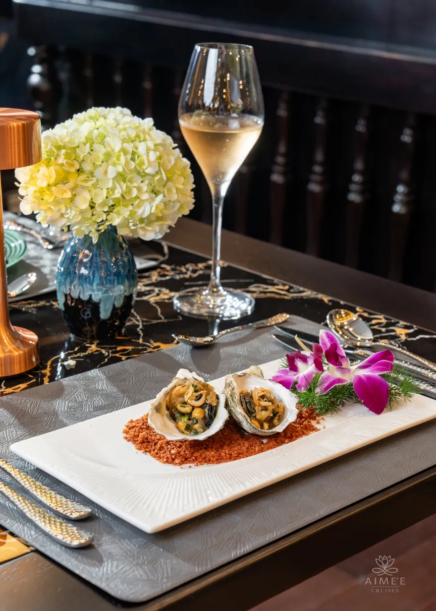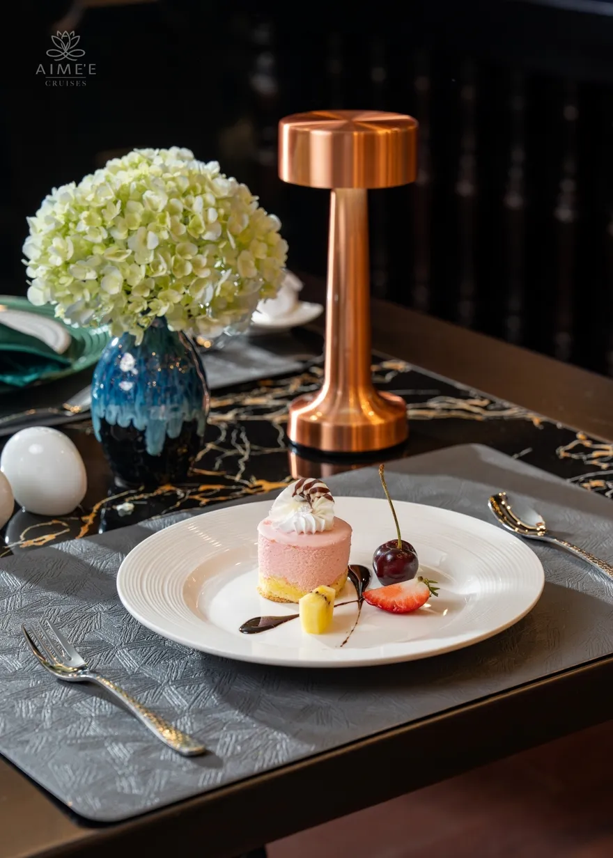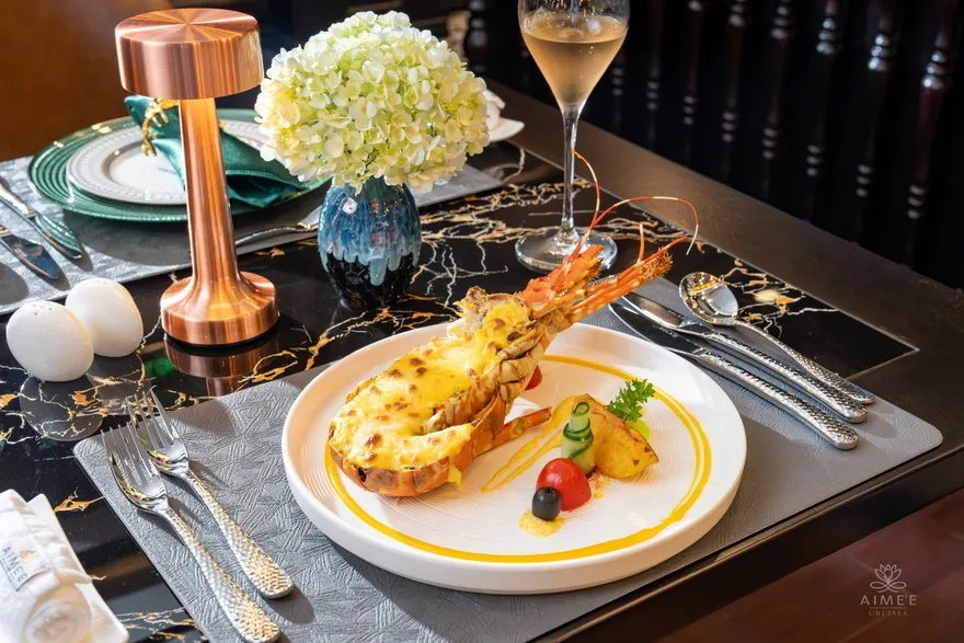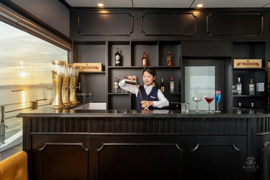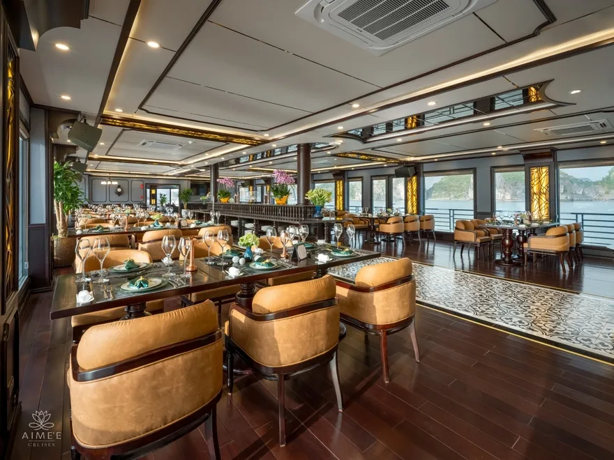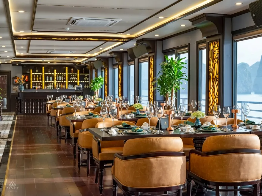 Aime’e Cruises không chỉ đơn thuần là một phương tiện vận chuyển, mà còn là một “resort nổi” thực thụ với hệ thống tiện ích đẳng cấp 6 sao được thiết kế để nuông chiều mọi giác quan của du khách. Tâm điểm của những trải nghiệm tinh tế chính là nhà hàng Elysian tọa lạc tại tầng 3, nơi sở hữu thiết kế kính bao quanh tạo nên tầm nhìn 360 độ không góc chết ra toàn cảnh kỳ quan. Tại đây, những bữa tiệc Fine Dining được phục vụ trong một không gian nghệ thuật, nơi mỗi bữa ăn không chỉ là sự thưởng thức vị giác mà còn là cuộc dạo chơi của thị giác giữa lòng di sản. Sau những giờ phút dùng bữa, Amber Sky Bar trên tầng thượng và Amethyst Lounge mang đến không gian kết nối đỉnh cao, nơi du khách có thể nhâm nhi những ly cocktail nghệ thuật và tận hưởng làn gió biển trong lành dưới bầu trời sao.