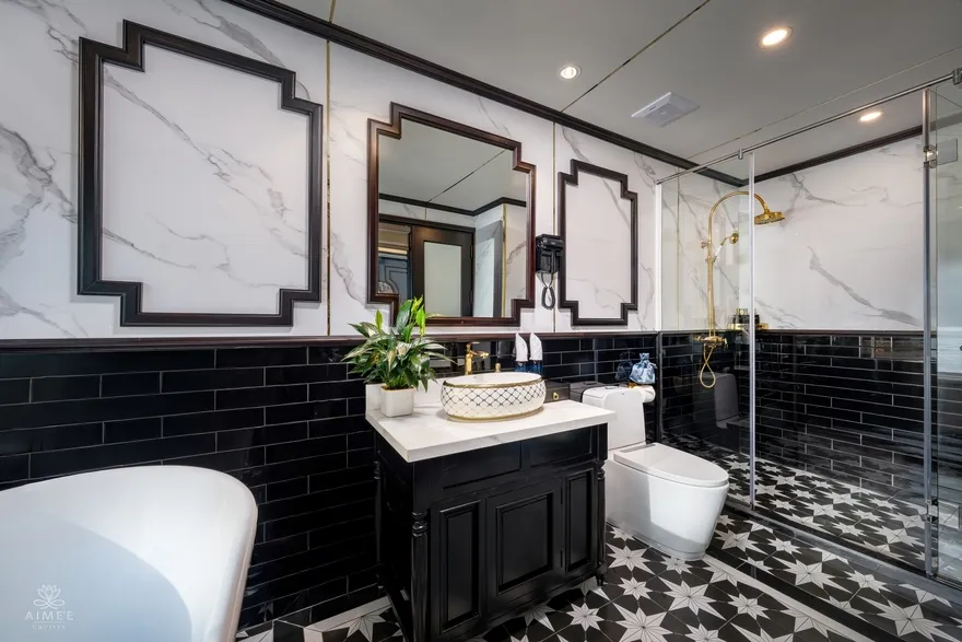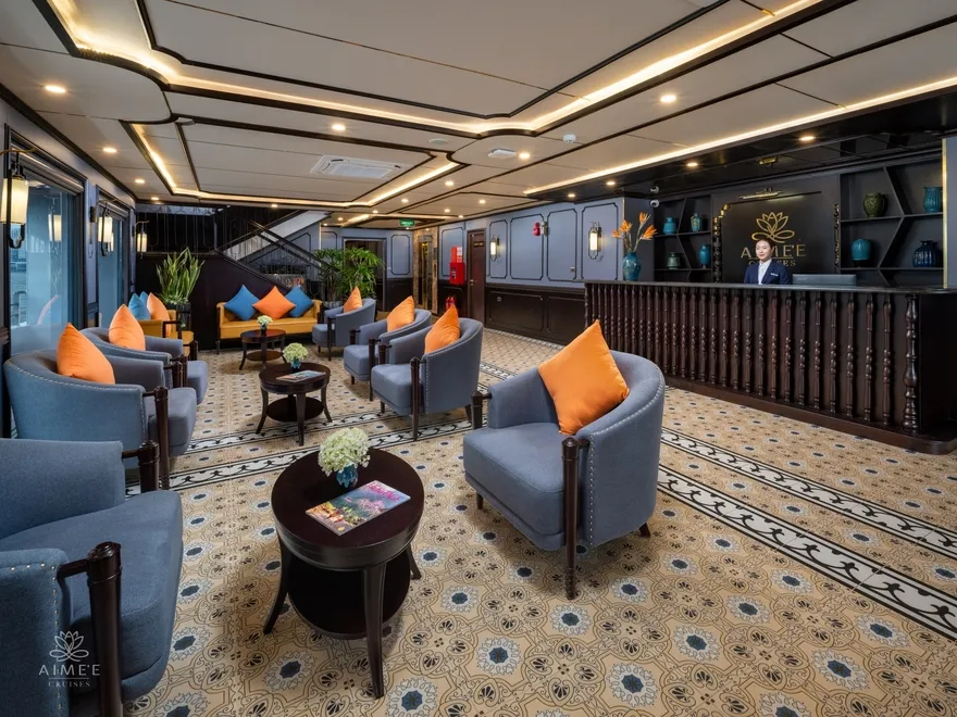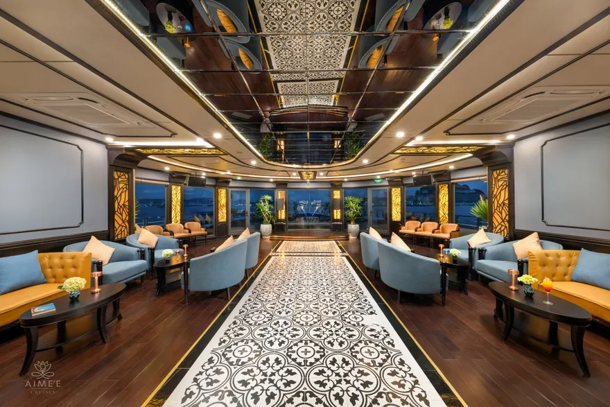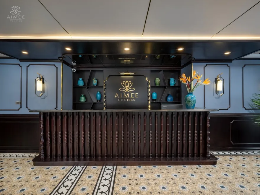 Aime’e Cruises mang đến một ngôn ngữ thiết kế độc bản qua phong cách Modern Indochine, nơi sự thanh lịch vượt thời gian của kiến trúc Pháp hòa quyện tinh tế với nét ấm nồng, gần gũi của văn hóa Việt Nam. Mỗi không gian trên tàu là một sự sắp đặt đầy nghệ thuật, sử dụng những chất liệu truyền thống như gỗ tự nhiên tông trầm, gạch bông hoa văn cổ điển phối hợp cùng những đường nét kim loại mạ vàng sang trọng. Triết lý thiết kế này không chỉ tạo nên một không gian nghỉ dưỡng thẩm mỹ mà còn khơi gợi lại ký ức về một thời kỳ hoàng kim của nghệ thuật Đông Dương, mang đến cảm giác vừa xa hoa, vừa thân thuộc cho du khách.