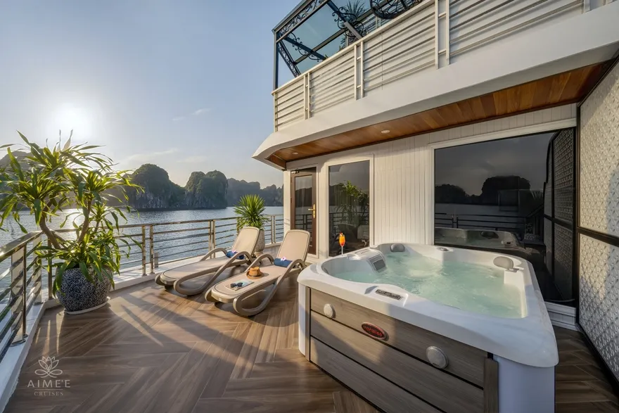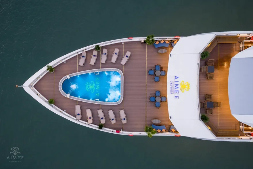 Trở lại du thuyền lớn Aime’e Cruises, thư giãn bên hồ bơi Jacuzzi hoặc sundeck.