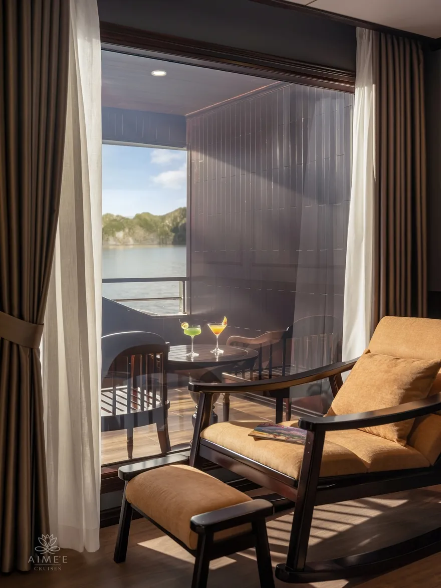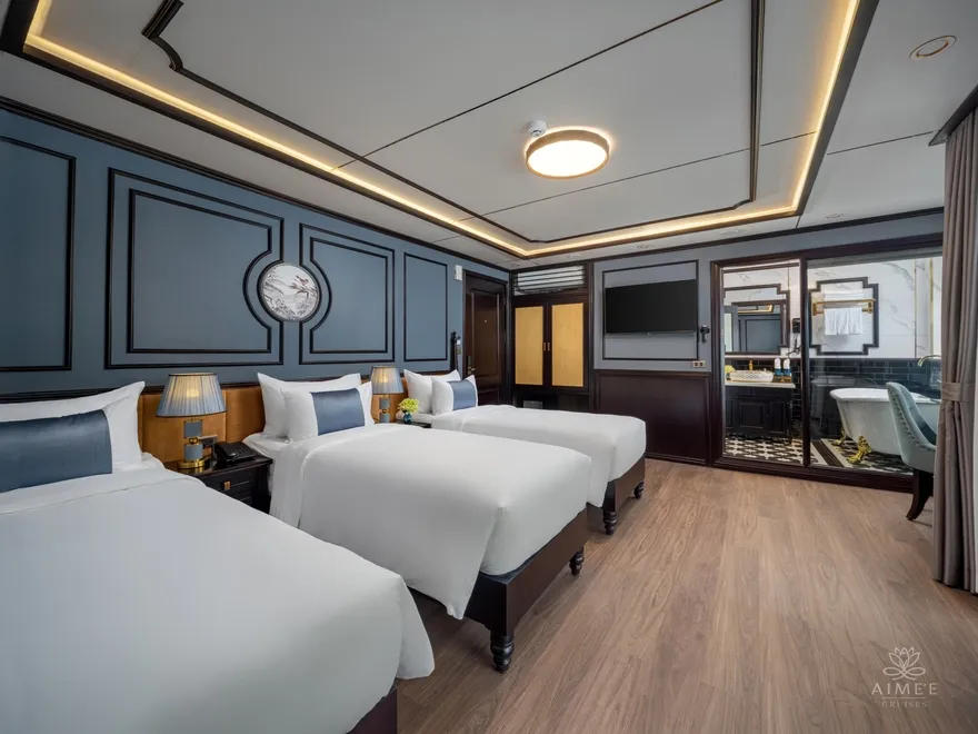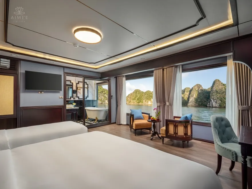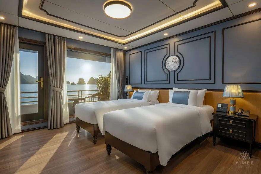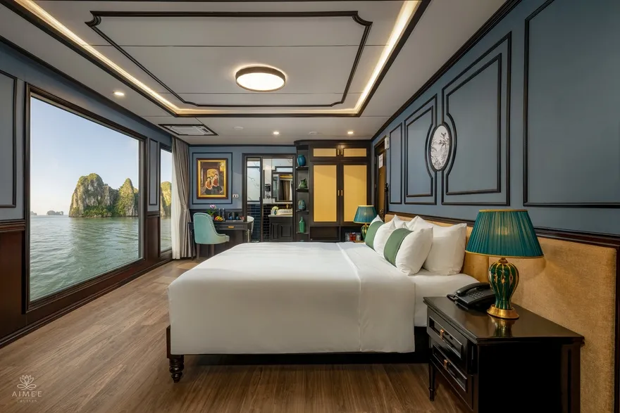 Với triết lý lấy sự riêng tư làm chuẩn mực của sự xa hoa, Aime’e Cruises chỉ bố trí vỏn vẹn 29 phòng suite trên một không gian rộng lớn, phục vụ tối đa 89 vị khách. Việc giới hạn số lượng phòng giúp mỗi cá nhân khi bước chân lên tàu đều cảm nhận được sự tĩnh lặng và tính cá nhân hóa cao nhất, biến mỗi căn phòng thành một ốc đảo nghỉ dưỡng tách biệt giữa lòng kỳ quan. Mỗi hạng phòng đều được thiết kế tỉ mỉ để tối ưu hóa ánh sáng tự nhiên và tầm nhìn hướng vịnh, xóa nhòa ranh giới giữa nội thất sang trọng và thiên nhiên hùng vĩ bên ngoài qua phong cách thiết kế Đông Dương đầy tinh tế.
