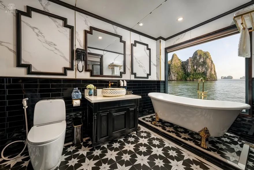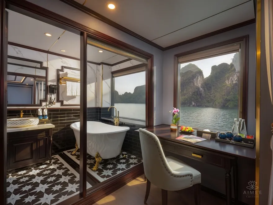 Đỉnh cao của sự xa xỉ trên du thuyền chính là những không gian “độc bản” nằm tại các vị trí chiến lược trên boong tàu. Hạng phòng Essence Terrace Suite tọa lạc phía tầng 2 gây choáng ngợp với sân hiên riêng biệt tích hợp bể sục Jacuzzi cá nhân, mang lại trải nghiệm nghỉ dưỡng như tại một căn villa nổi giữa biển trời. Trong khi đó, Aime’e Suite nằm kiêu hãnh tại vị trí mũi tàu lại sở hữu tầm nhìn 180 độ không giới hạn, là lựa chọn hoàn hảo cho những ai khao khát được thu trọn vẻ đẹp bao la của Vịnh Hạ Long vào trong tầm mắt từ một góc nhìn độc quyền và kín đáo nhất.