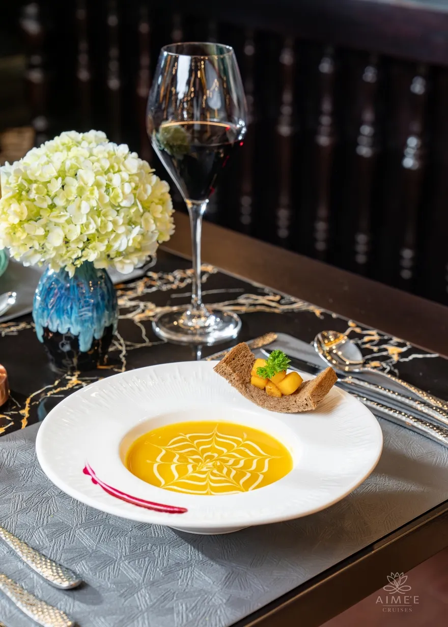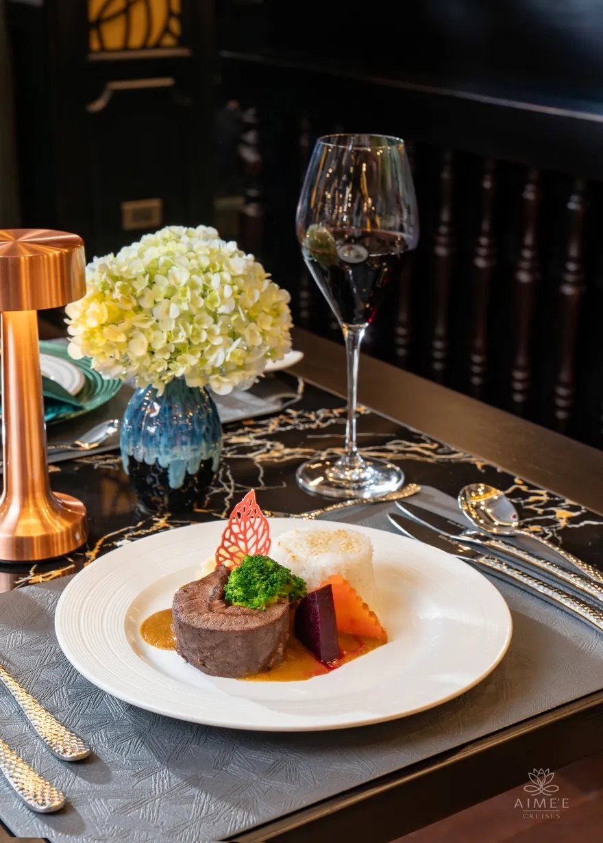 Trải nghiệm ẩm thực trên Aime’e Cruises được ví như một hành trình vị giác không biên giới, nơi thực khách có thể cảm nhận trọn vẹn sự tinh tế trong từng món ăn được thiết kế riêng biệt. Hiểu rằng mỗi vị khách là một cá thể duy nhất với những sở thích và nhu cầu ăn kiêng khác nhau, du thuyền mang đến hệ thống thực đơn vô cùng phong phú, từ thực đơn Tiêu chuẩn (Standard) đầy mời gọi đến các tùy chọn chuyên biệt như thực đơn Không thịt (Meat-free), Không hải sản (Non-seafood) hay thực đơn Chay Ấn Độ (Indian Vegetarian). Sự linh hoạt này đảm bảo rằng dù bạn là người yêu thích sự truyền thống hay có những yêu cầu khắt khe về tôn giáo và sức khỏe, hành trình trên biển vẫn luôn ngập tràn những hương vị tuyệt vời.