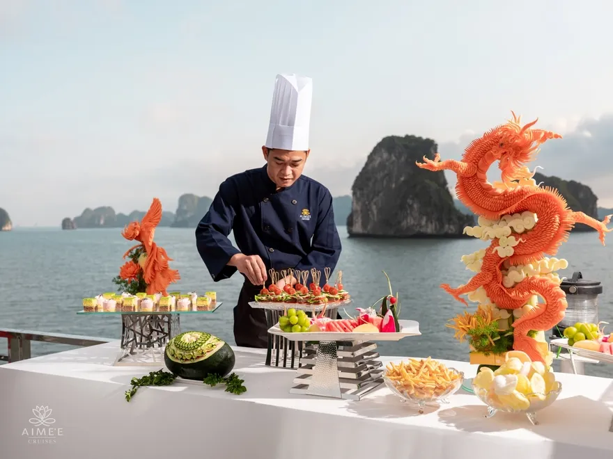 “Linh hồn” của các bữa tiệc trên tàu chính là sự kết hợp nhuần nhuyễn giữa tinh túy sản vật địa phương và nghệ thuật chế biến quốc tế. Những nguyên liệu tươi ngon nhất của vùng vịnh như Mực Vân Đồn xào ngũ sắc, Nem hải sản Hạ Long danh tiếng hay Hàu nướng phô mai béo ngậy được các đầu bếp tài hoa biến tấu một cách sáng tạo. Thực khách có thể bắt gặp hương vị đậm đà của Chả cá Lã Vọng Hà Nội hay Phở cuốn Tây Hồ bên cạnh món Bò lúc lắc cháy tỏi và Tôm hùm bỏ lò sốt phô mai thượng hạng. Đối với các thực khách Ấn Độ, những món ăn đặc trưng như Cà ri rau củ, Đậu xào sốt Masala hay Đậu gà hầm sẽ được chế biến đúng điệu với các loại gia vị đặc trưng, mang lại cảm giác thân thuộc ngay giữa lòng kỳ quan.