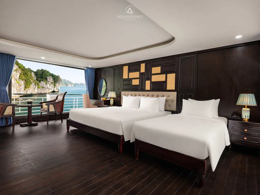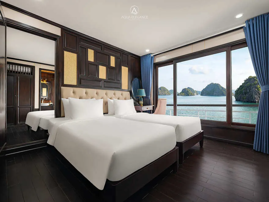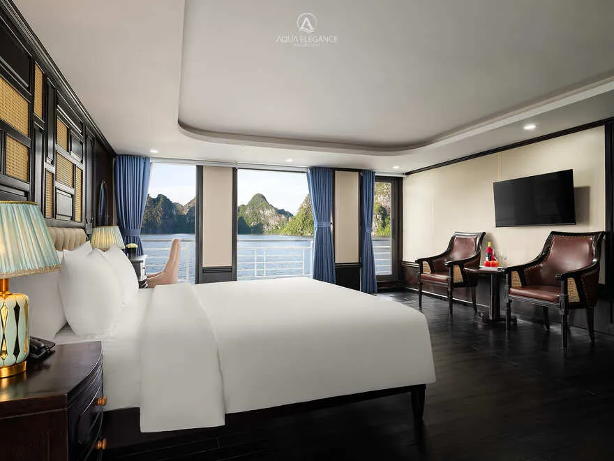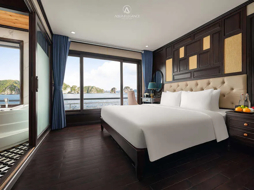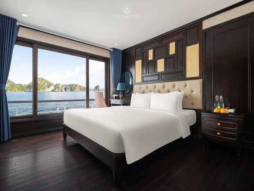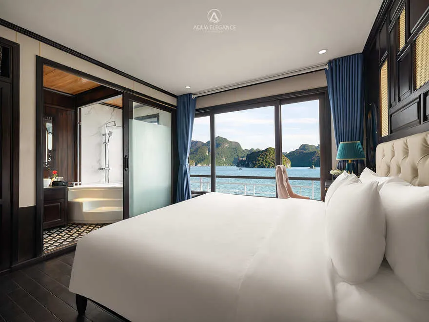 Bước vào không gian nghỉ dưỡng, bạn sẽ choáng ngợp trước hệ thống 21 cabin suite đẳng cấp, nơi 100% các phòng đều sở hữu tầm nhìn hướng biển toàn cảnh và bồn tắm riêng biệt. Tùy theo nhu cầu, bạn có thể lựa chọn từ Junior Suite (28 $m^2$ tại tầng 1) ấm cúng đến Senior Suite (30 $m^2$ tại tầng 2) với góc nhìn rộng mở hơn. Đối với các cặp đôi, Honeymoon Suite Balcony rộng 45 $m^2$ với ban công riêng và bể sục Jacuzzi sát cửa sổ lớn là một lựa chọn không thể lãng mạn hơn. Đỉnh cao nhất phải kể đến hạng phòng King/Queen Suite VIP rộng tới 80 $m^2$, nổi bật với thiết kế cửa sổ “không viền” (borderless windows), giúp xóa nhòa mọi khoảng cách giữa không gian sống và kỳ quan vịnh di sản ngay trước mắt.