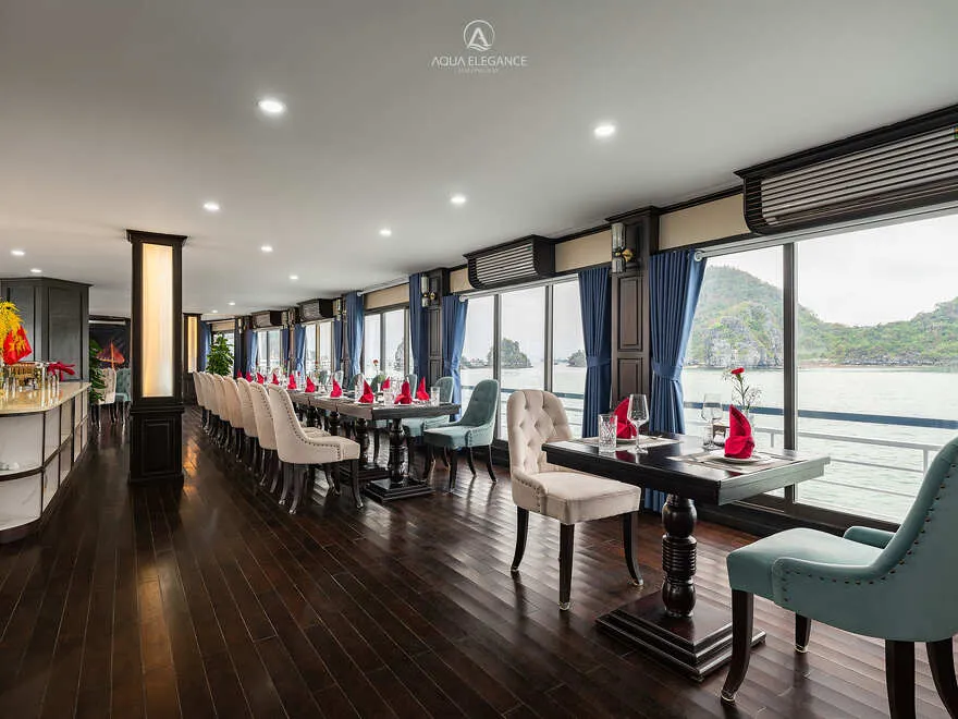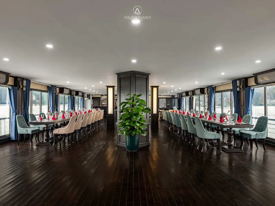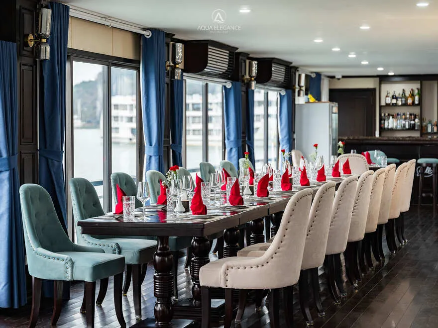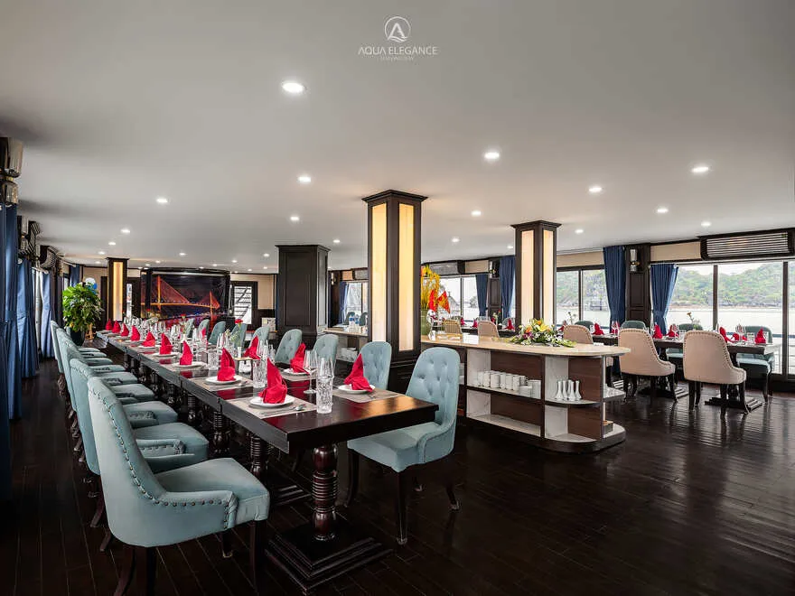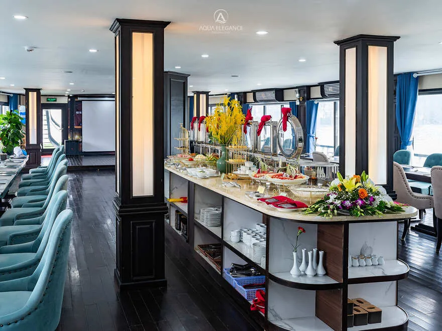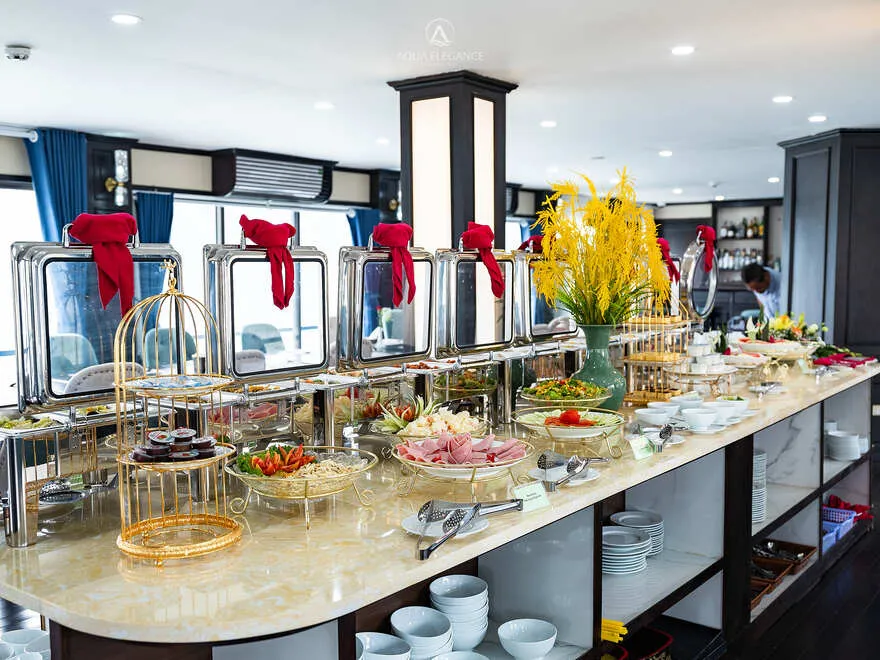 Hành trình vị giác trên Aqua Elegance cũng là một điểm nhấn khó quên với triết lý “Fusion & Freshness” tại nhà hàng sang trọng tầng 2. Các món ăn là sự giao thoa tinh tế giữa kỹ thuật chế biến phương Tây và hương vị đặc sản địa phương được tuyển chọn kỹ lưỡng từ Hạ Long và Vân Đồn. Bạn sẽ được thưởng thức nộm sứa Vân Đồn giòn sần sật, nem Hạ Long chiên hay cá biển hấp Hồng Kông trong các bữa buffet trưa thịnh soạn. Bữa tối lại mang đến sự cầu kỳ với súp bí đỏ kem tươi và cá biển bỏ lò sốt me rừng. Đặc biệt, du thuyền rất chú trọng đến nhu cầu cá nhân khi sẵn sàng phục vụ các chế độ ăn kiêng, ăn chay hay thực đơn dành cho khách Ấn Độ (Jain) một cách chu đáo nhất.