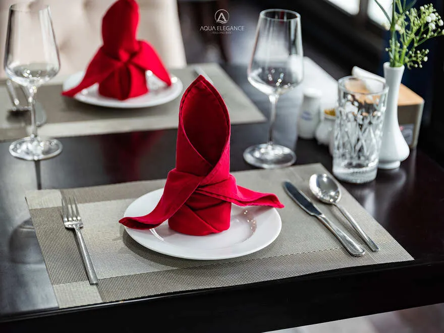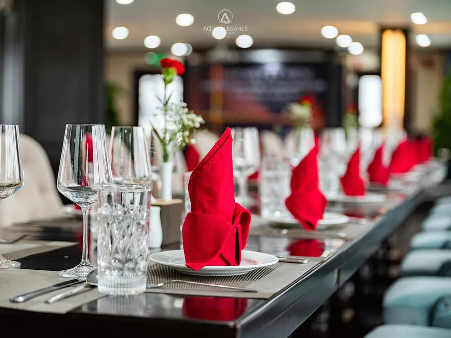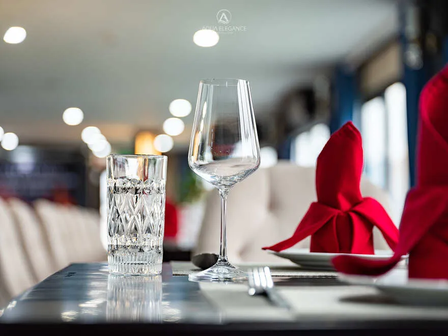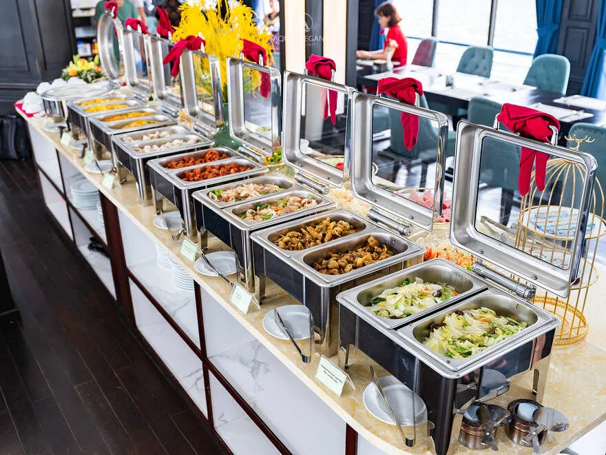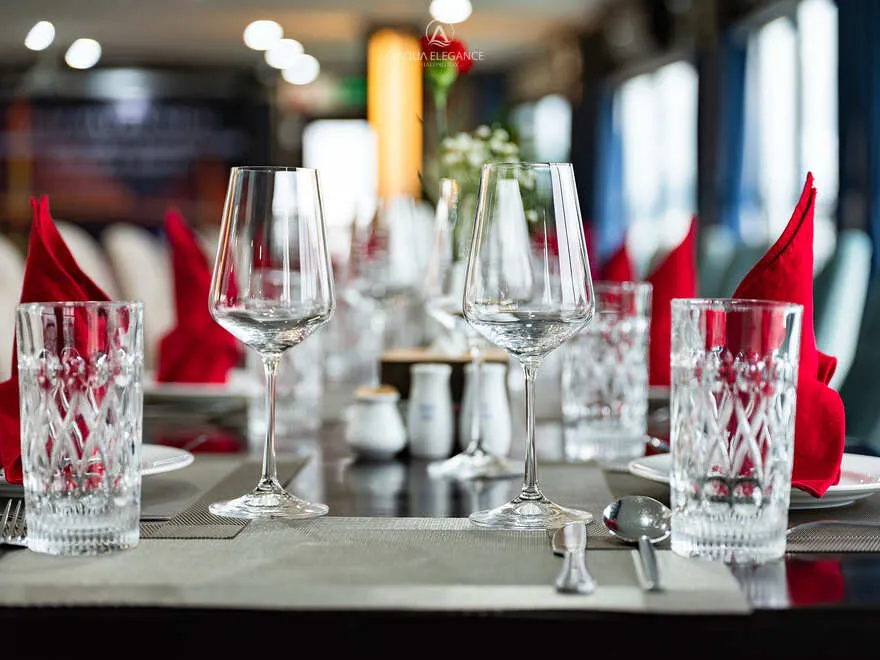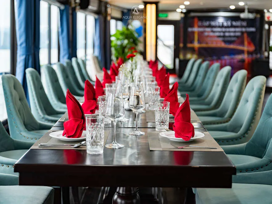 Hành trình vị giác trên Aqua Elegance cũng là một điểm nhấn khó quên với triết lý “Fusion & Freshness” tại nhà hàng sang trọng tầng 2. Các món ăn là sự giao thoa tinh tế giữa kỹ thuật chế biến phương Tây và hương vị đặc sản địa phương được tuyển chọn kỹ lưỡng từ Hạ Long và Vân Đồn. Bạn sẽ được thưởng thức nộm sứa Vân Đồn giòn sần sật, nem Hạ Long chiên hay cá biển hấp Hồng Kông trong các bữa buffet trưa thịnh soạn. Bữa tối lại mang đến sự cầu kỳ với súp bí đỏ kem tươi và cá biển bỏ lò sốt me rừng. Đặc biệt, du thuyền rất chú trọng đến nhu cầu cá nhân khi sẵn sàng phục vụ các chế độ ăn kiêng, ăn chay hay thực đơn dành cho khách Ấn Độ (Jain) một cách chu đáo nhất.