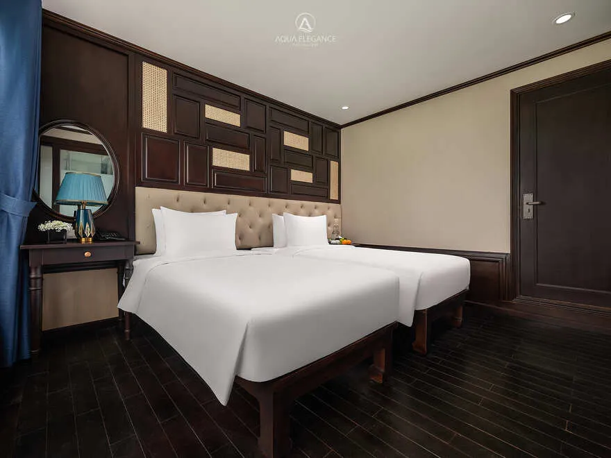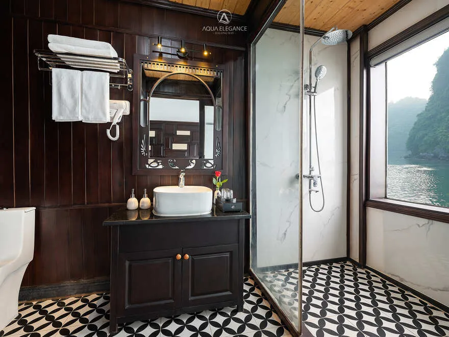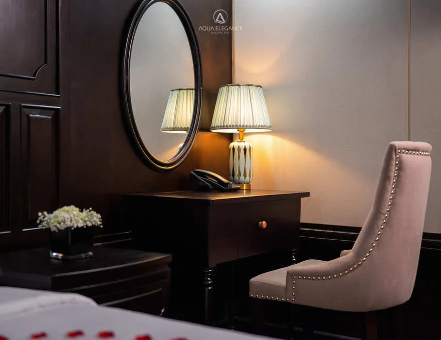 Về mặt kỹ thuật, Aqua Elegance là minh chứng cho sự kết hợp giữa kỹ nghệ hàng hải hiện đại và thẩm mỹ kiến trúc. Con tàu được xây dựng với thân thép gia cường chắc chắn, có chiều dài 71 mét và chiều rộng 12 mét, đảm bảo sự vận hành êm ái và an toàn tuyệt đối theo tiêu chuẩn 5 sao quốc tế. Ít ai biết rằng, con tàu này vốn có lịch sử từ năm 2018 nhưng đã trải qua một cuộc đại tu toàn diện và hiện đại hóa với mức đầu tư lớn vào năm 2024 để chính thức tái xuất với diện mạo đạt chuẩn quốc tế. Kiến trúc 4 tầng của tàu được thiết kế theo phong cách “Contemporary Vietnamese”, pha trộn giữa những đường nét tối giản hiện đại và chất liệu gỗ tự nhiên ấm áp. Điểm cộng đắt giá nhất chính là hệ thống thang máy hiện đại xuyên suốt các tầng, một chi tiết tinh tế giúp việc di chuyển của du khách, đặc biệt là người cao tuổi và trẻ em, trở nên nhẹ nhàng và thuận tiện hơn bao giờ hết.