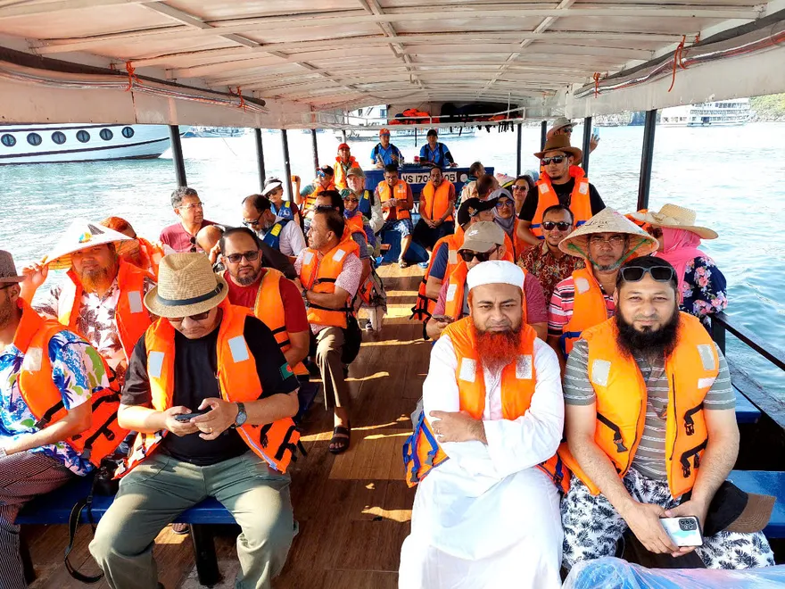 Quý khách lên du thuyền, thưởng thức đồ uống chào mừng và nghe phổ biến về an toàn.
