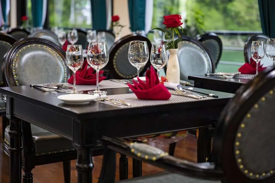 Thưởng thức bữa trưa buffet tại nhà hàng trong khi tàu bắt đầu di chuyển vào Vịnh Lan Hạ.