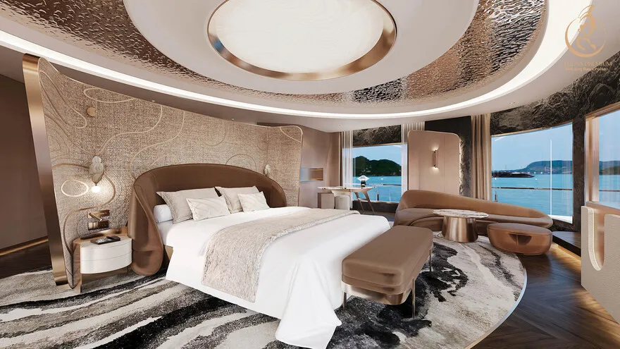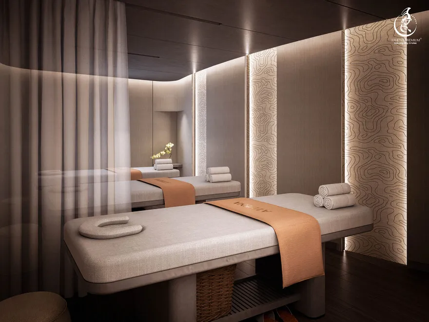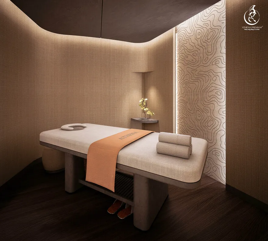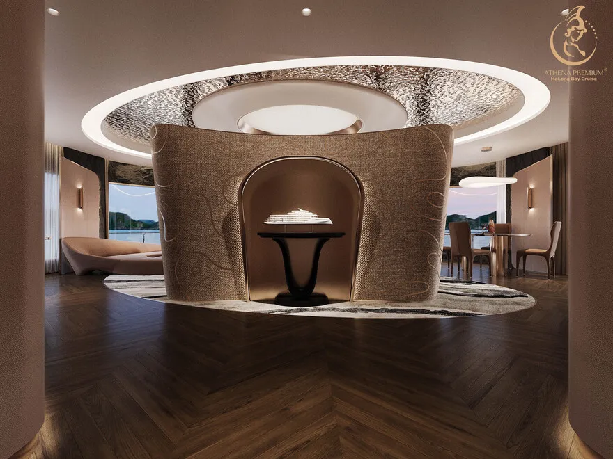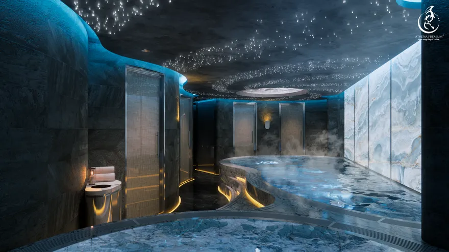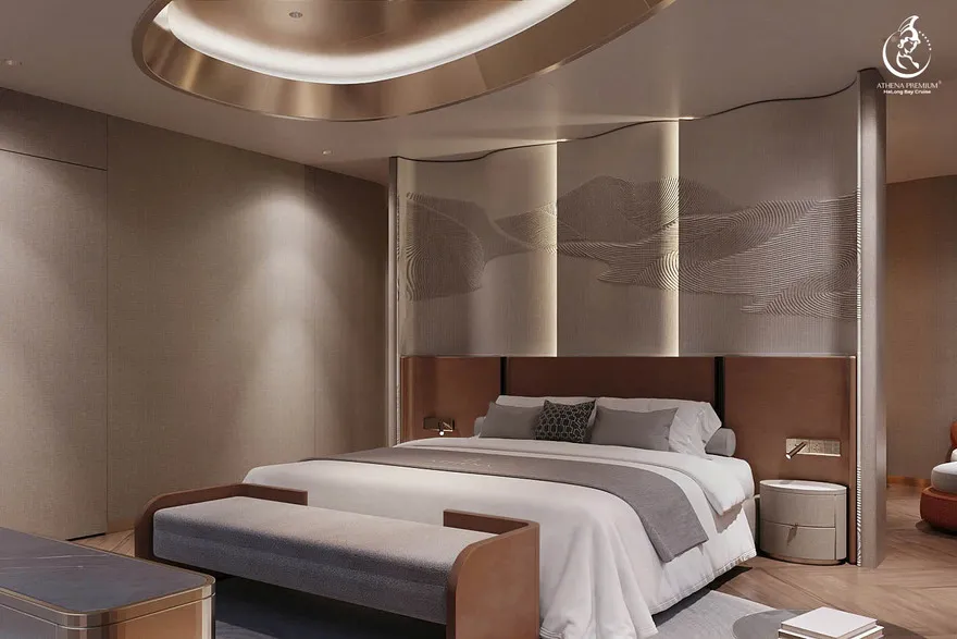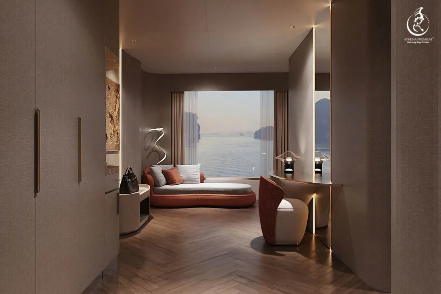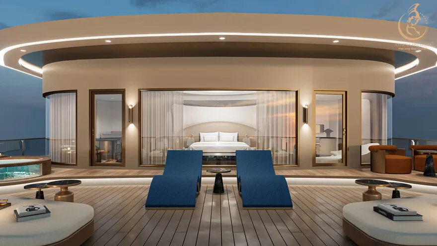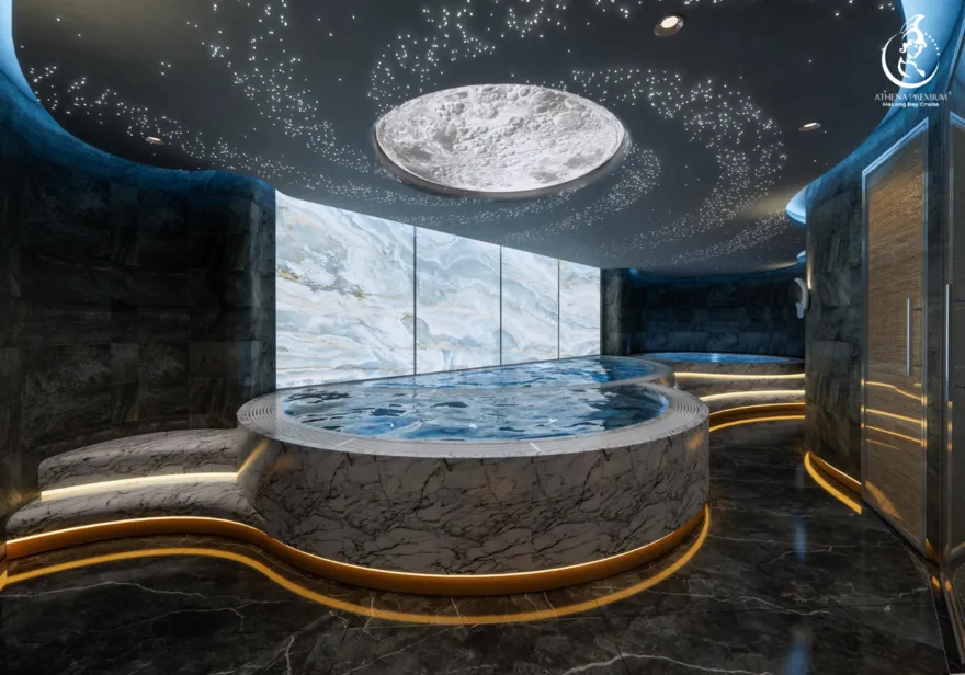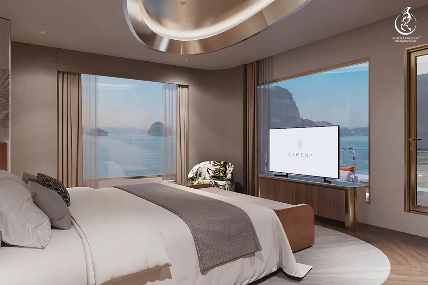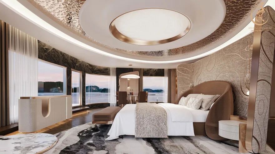 Tại đây, khái niệm nghỉ dưỡng được nâng tầm thành nghệ thuật với 41 cabin Suite đẳng cấp, nơi 100% các phòng đều sở hữu ban công riêng hướng vịnh và hệ thống điều hòa khí tươi. “Trái tim” của con tàu là phòng Tổng thống Imperial Athena Suite rộng tới $400m^2$ tại tầng 5, tích hợp sân hiên riêng $200m^2$, bể sục khoáng ngoài trời và dịch vụ quản gia riêng. Siêu du thuyền còn tiên phong đưa hệ thống tắm Onsen chuẩn Nhật và hệ thống khoáng tươi vào vận hành, kết hợp cùng bể bơi vô cực bốn mùa 360 độ tại mũi tàu. Những tiện ích độc bản như phòng tập Golf 3D, khu vực thiên văn học và nhà hàng Ambrosia tại tầng 3 tạo nên một hệ sinh thái giải trí khép kín, nơi du khách có thể tận hưởng mỹ vị Á – Âu thượng hạng và chăm sóc sức khỏe chuyên sâu (Wellness) giữa không gian kỳ vĩ.