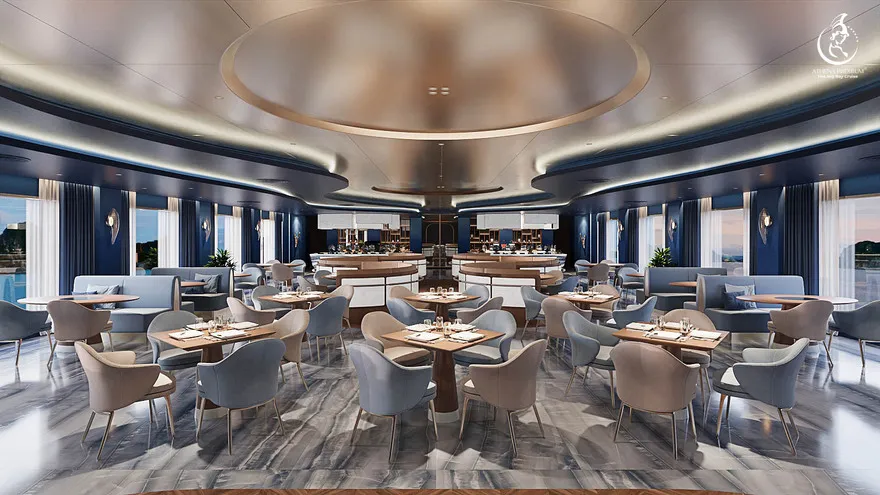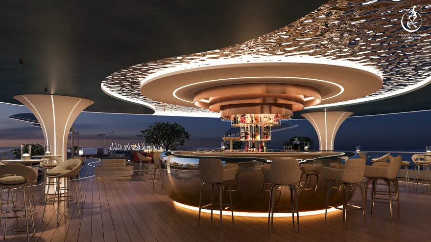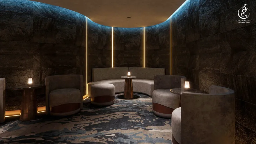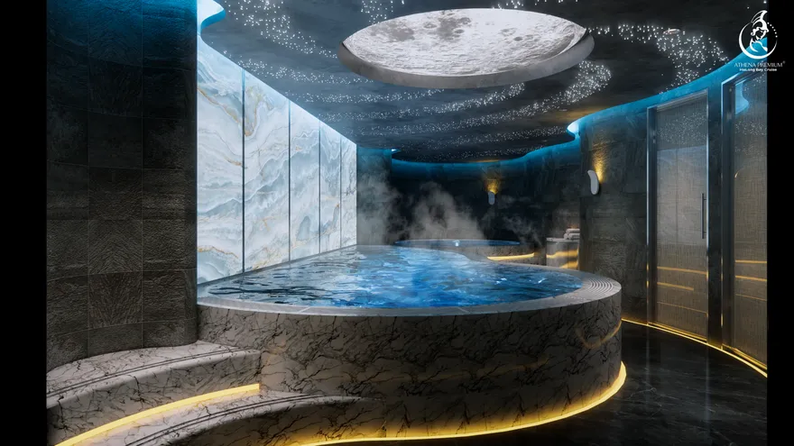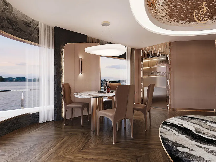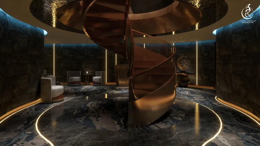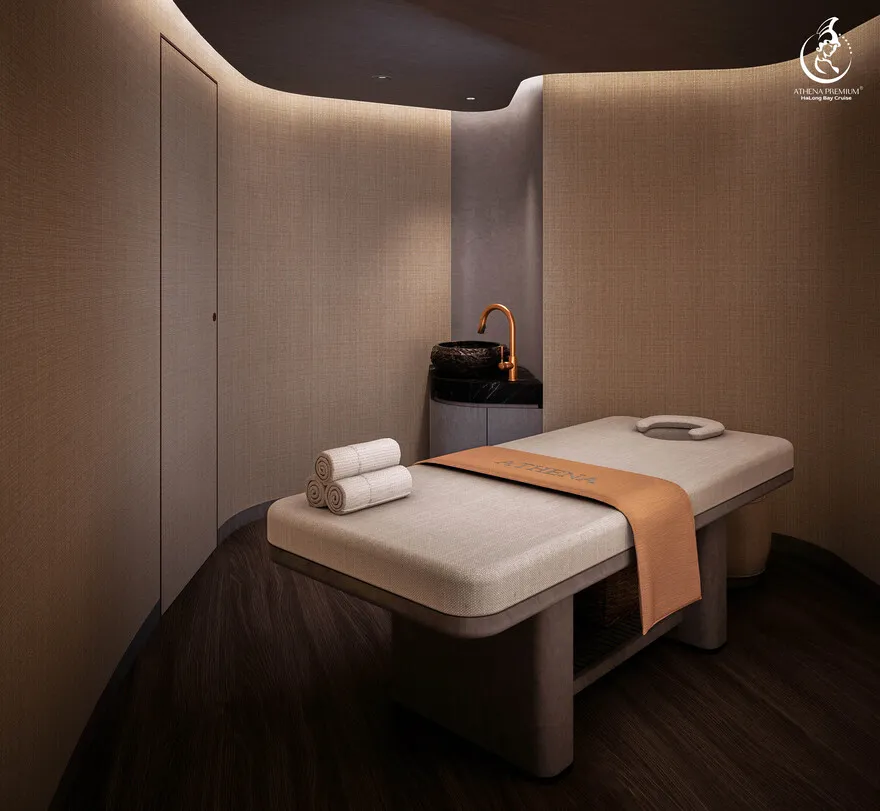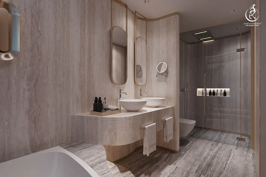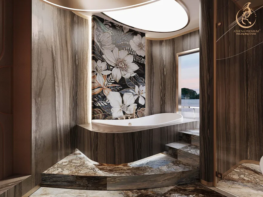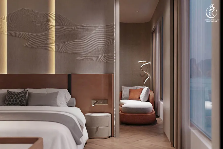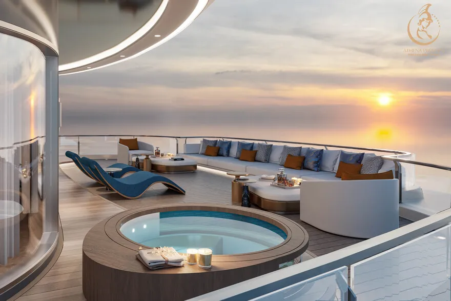 Tại đây, khái niệm nghỉ dưỡng được nâng tầm thành nghệ thuật với 41 cabin Suite đẳng cấp, nơi 100% các phòng đều sở hữu ban công riêng hướng vịnh và hệ thống điều hòa khí tươi. “Trái tim” của con tàu là phòng Tổng thống Imperial Athena Suite rộng tới $400m^2$ tại tầng 5, tích hợp sân hiên riêng $200m^2$, bể sục khoáng ngoài trời và dịch vụ quản gia riêng. Siêu du thuyền còn tiên phong đưa hệ thống tắm Onsen chuẩn Nhật và hệ thống khoáng tươi vào vận hành, kết hợp cùng bể bơi vô cực bốn mùa 360 độ tại mũi tàu. Những tiện ích độc bản như phòng tập Golf 3D, khu vực thiên văn học và nhà hàng Ambrosia tại tầng 3 tạo nên một hệ sinh thái giải trí khép kín, nơi du khách có thể tận hưởng mỹ vị Á – Âu thượng hạng và chăm sóc sức khỏe chuyên sâu (Wellness) giữa không gian kỳ vĩ.