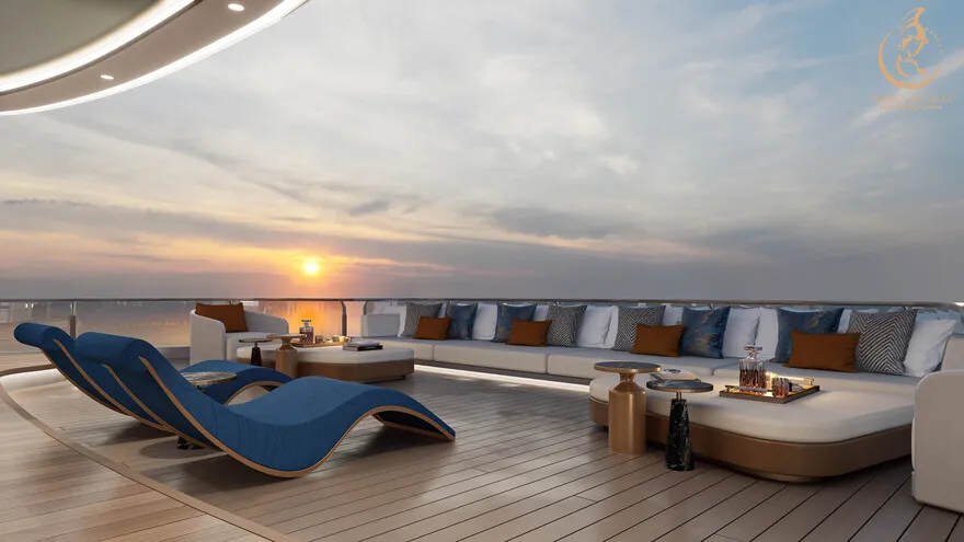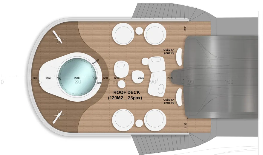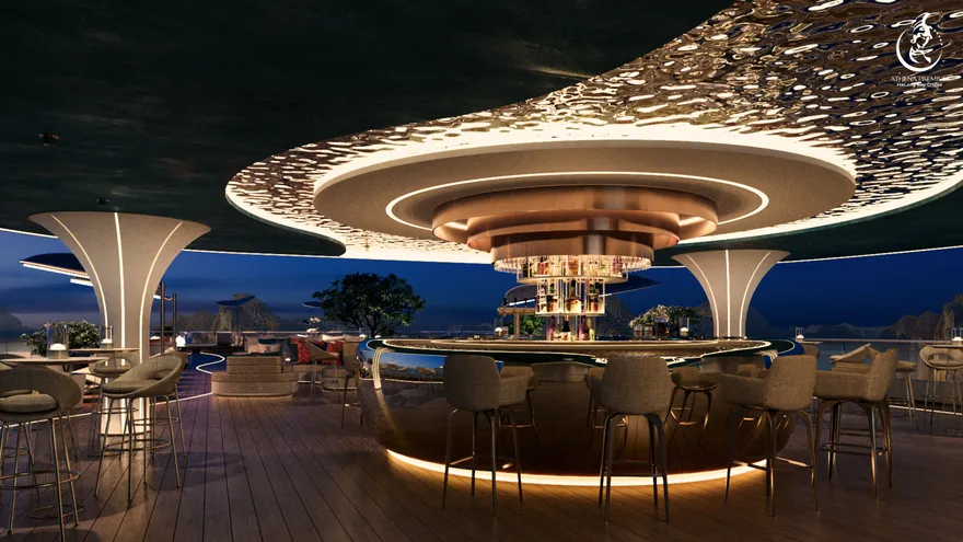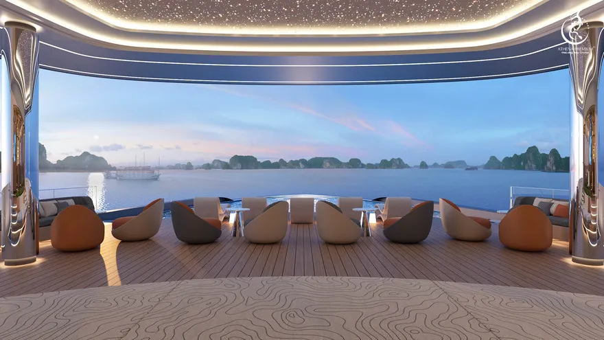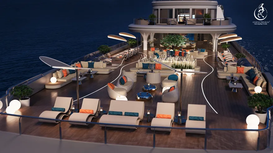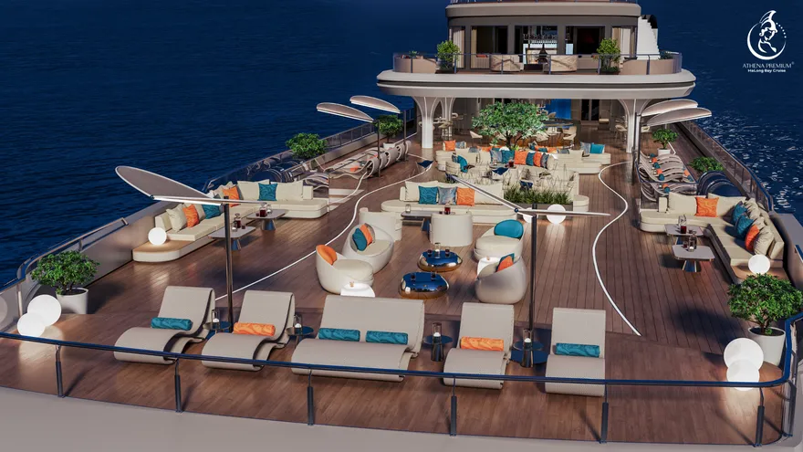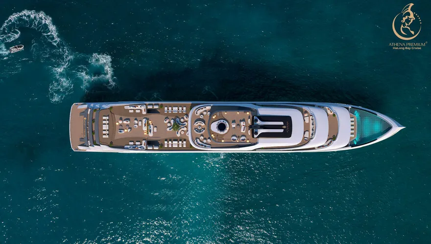 Siêu du thuyền Athena Premium là một kỳ quan kỹ thuật thực thụ với các thông số hàng hải dẫn đầu thị trường. Với chiều dài kỷ lục $109,9m$ và chiều rộng $16m$, con tàu sở hữu kết cấu đồ sộ gồm 6 tầng nổi và một boong hầm, cung cấp tổng diện tích sàn lên đến hơn $10.000m^2$. Mớn nước (draft) đạt $2,5m$ – một con số tối ưu giúp tàu vận hành cực kỳ êm ái, giảm thiểu tối đa sự rung lắc, mang lại cảm giác tĩnh lặng như một khách sạn hạng sang trên đất liền. Đặc biệt, khu vực Sundeck rộng tới $900m^2$ không chỉ là sân thượng lớn nhất trên vịnh hiện nay mà còn có sức chứa lên đến 500 khách, biến nơi đây thành địa điểm lý tưởng cho những sự kiện MICE tầm cỡ quốc tế hay những đám cưới di sản xa hoa.
