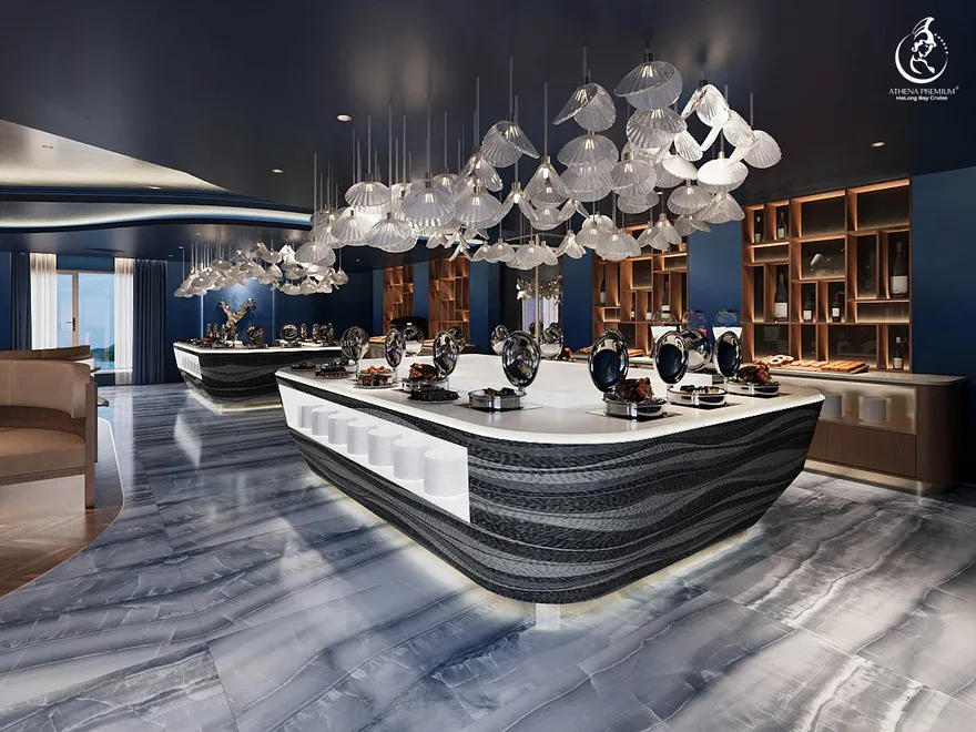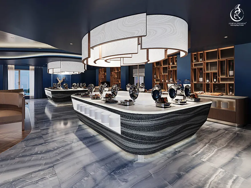 Thưởng thức bữa trưa Buffet tại nhà hàng Ambrosia (Tầng 3). Tàu bắt đầu lướt êm qua vùng lõi của vịnh di sản.