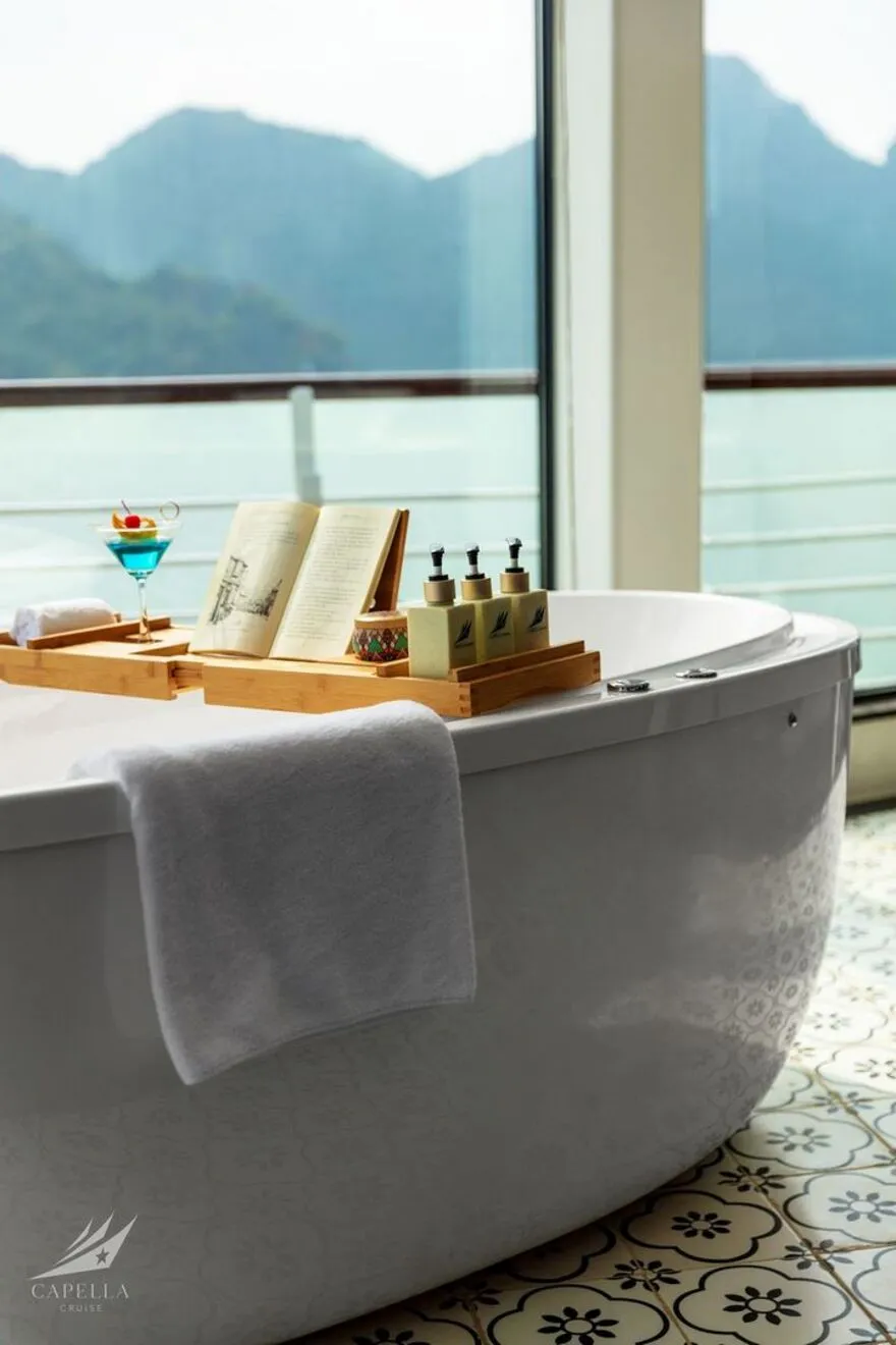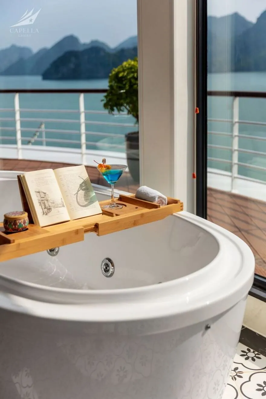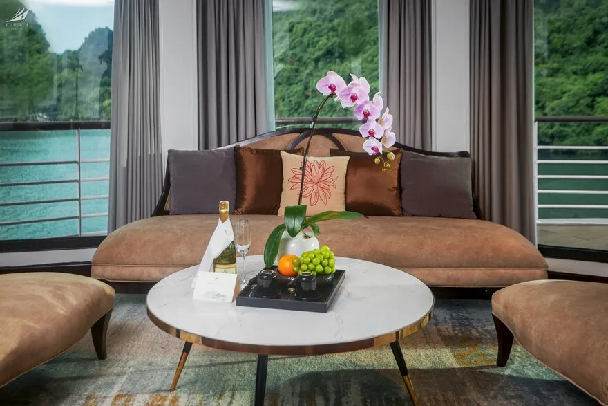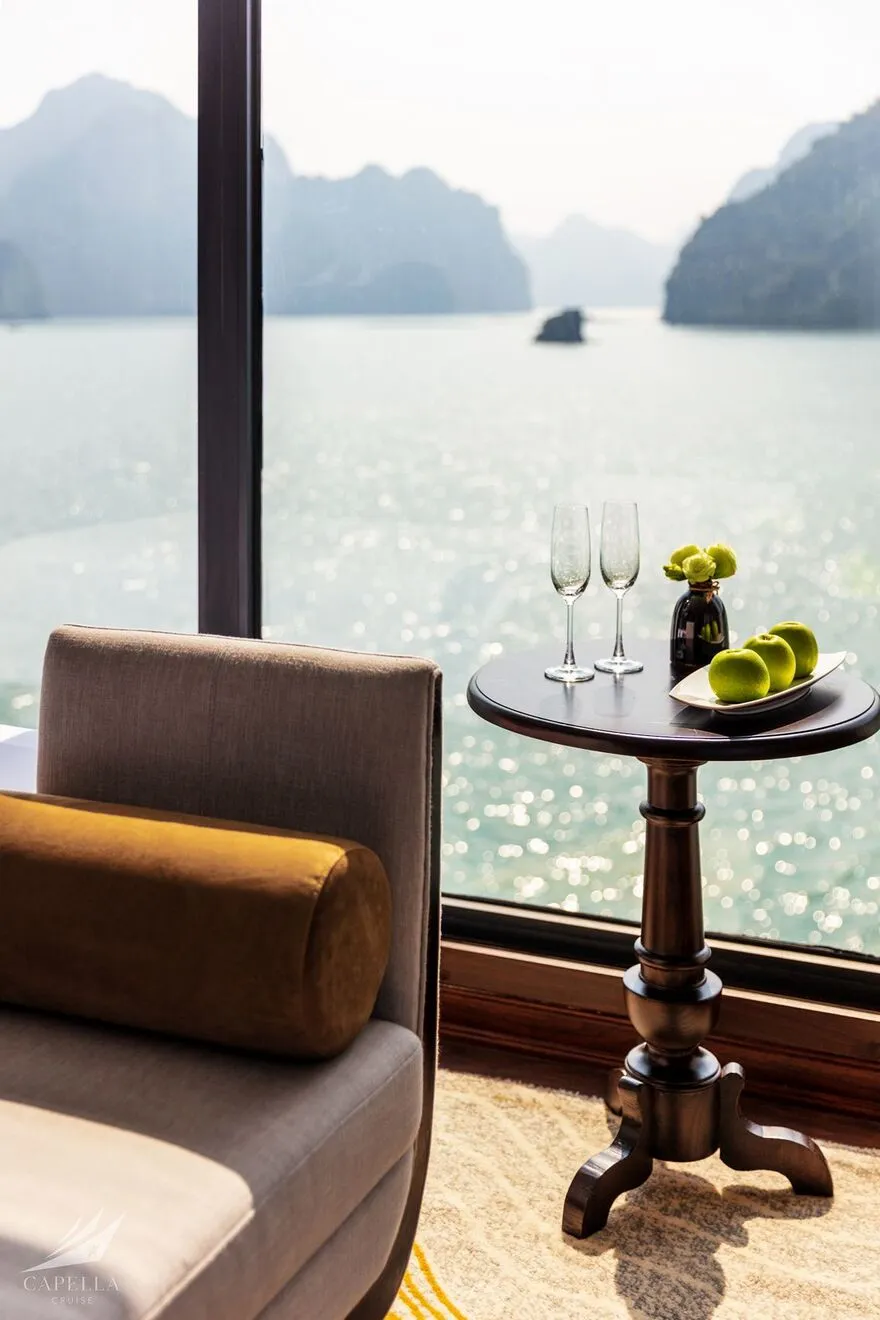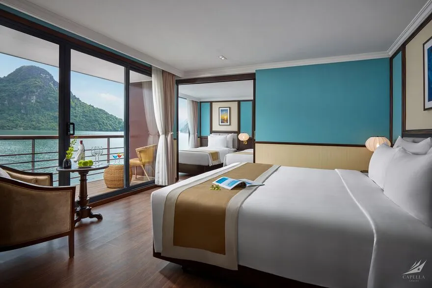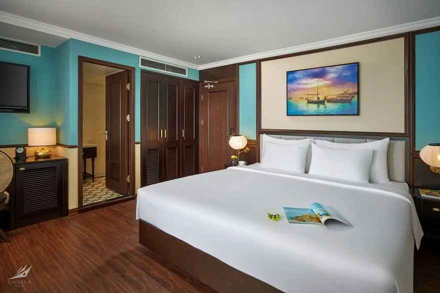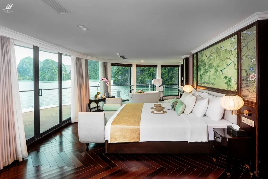 Hệ thống phòng nghỉ trên Capella được xây dựng dựa trên khái niệm căn hộ cao cấp giữa biển khơi, nơi phong cách Indochine hoài cổ len lỏi vào từng chi tiết nội thất gỗ và họa tiết retro. Điểm đắt giá nhất chính là thiết kế 100% các phòng đều sở hữu ban công riêng và bồn tắm nằm sát cửa kính hướng vịnh. Nếu bạn yêu thích sự tĩnh lặng và gần gũi với mặt nước, các căn Oasis Suite (tầng 1) và Harmony Suite (tầng 2) với diện tích 32 mét vuông là lựa chọn hoàn hảo. Tiến lên tầng cao hơn, Sky Suite mang lại tầm nhìn bao quát, trong khi Sky Terrace Suite sở hữu sân hiên riêng biệt rộng rãi để bạn tự do tắm nắng. Đối với các gia đình đa thế hệ, các căn Harmony Family hay Sky Family với không gian kết nối giúp duy trì sự gắn kết mà vẫn đảm bảo tính riêng tư. Đỉnh cao của sự xa hoa chính là Owner Suite tại mũi tàu tầng 3; với diện tích 92 mét vuông, căn phòng này là một căn penthouse thực thụ với phòng khách biệt lập, Jacuzzi riêng và tầm nhìn 180 độ thu trọn kỳ quan vào trong tầm mắt.