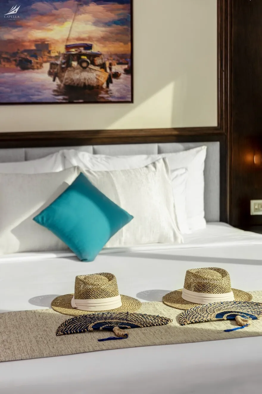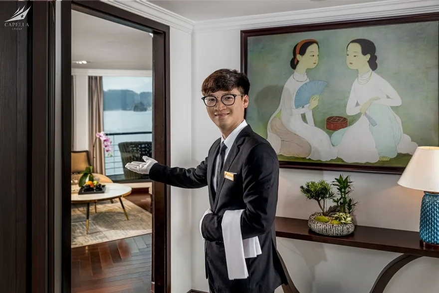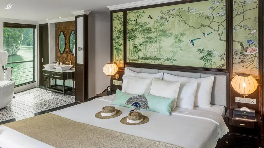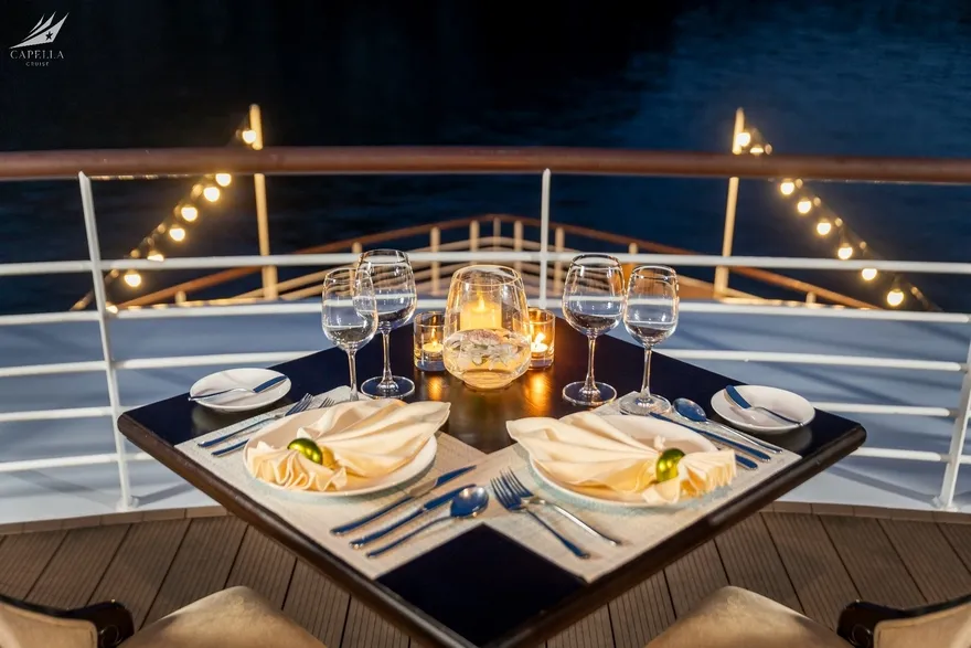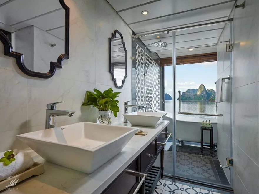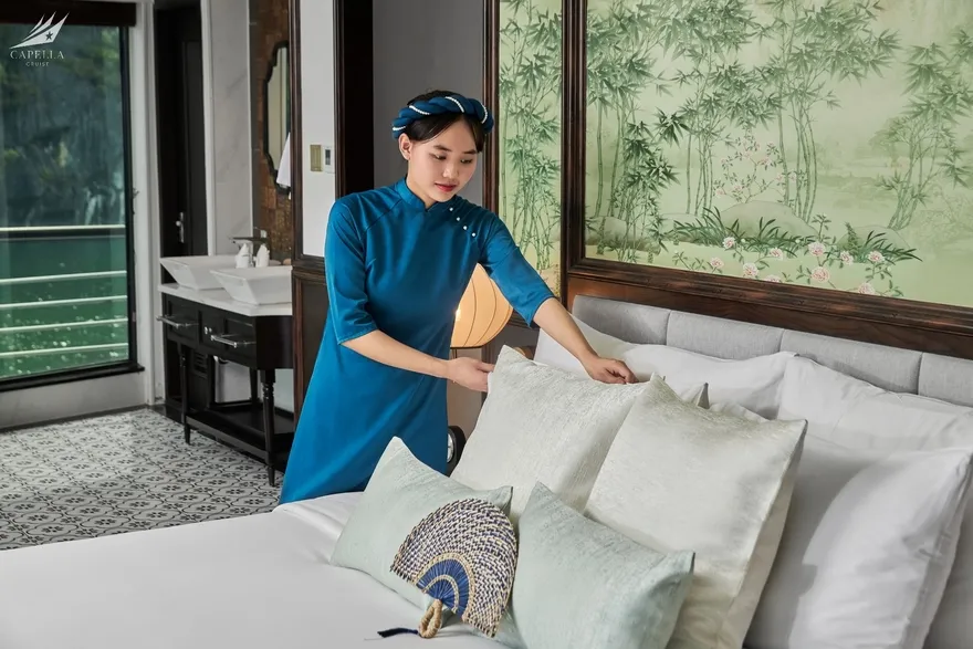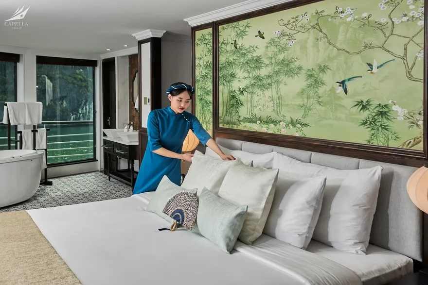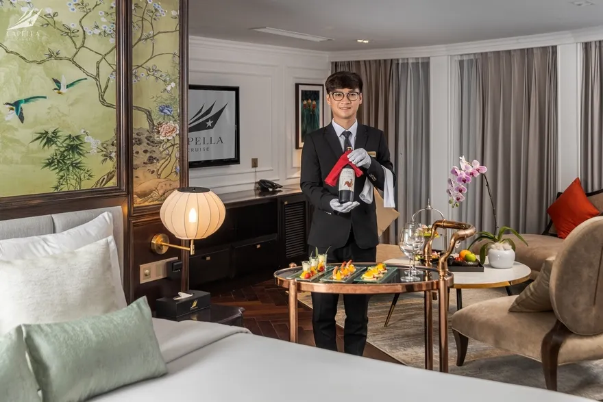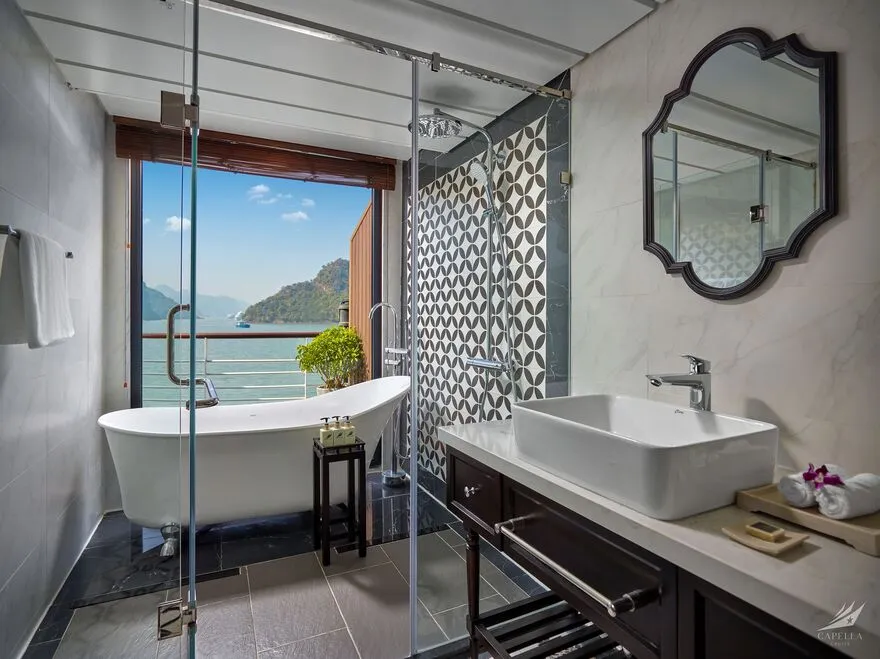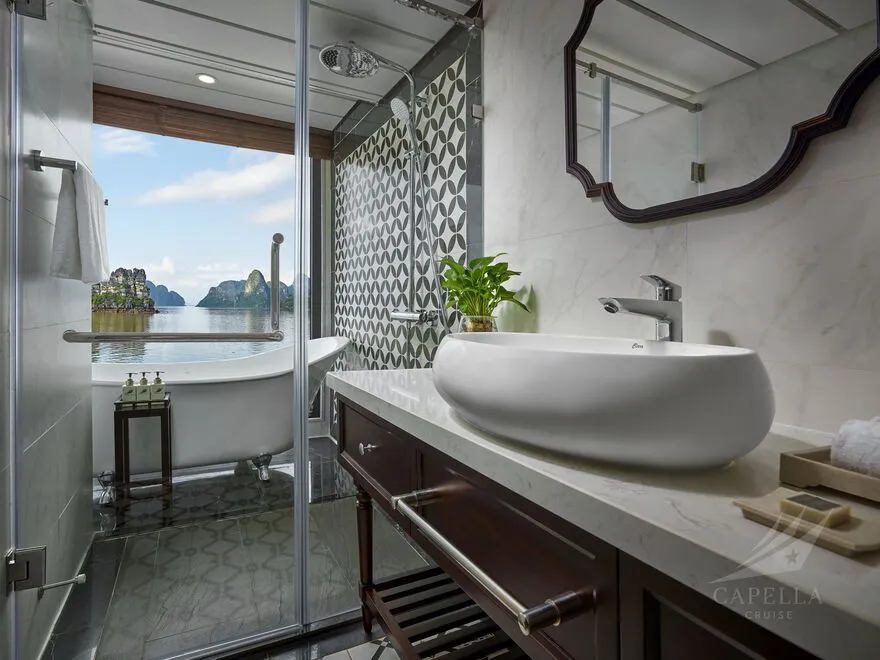 Hệ thống phòng nghỉ trên Capella được xây dựng dựa trên khái niệm căn hộ cao cấp giữa biển khơi, nơi phong cách Indochine hoài cổ len lỏi vào từng chi tiết nội thất gỗ và họa tiết retro. Điểm đắt giá nhất chính là thiết kế 100% các phòng đều sở hữu ban công riêng và bồn tắm nằm sát cửa kính hướng vịnh. Nếu bạn yêu thích sự tĩnh lặng và gần gũi với mặt nước, các căn Oasis Suite (tầng 1) và Harmony Suite (tầng 2) với diện tích 32 mét vuông là lựa chọn hoàn hảo. Tiến lên tầng cao hơn, Sky Suite mang lại tầm nhìn bao quát, trong khi Sky Terrace Suite sở hữu sân hiên riêng biệt rộng rãi để bạn tự do tắm nắng. Đối với các gia đình đa thế hệ, các căn Harmony Family hay Sky Family với không gian kết nối giúp duy trì sự gắn kết mà vẫn đảm bảo tính riêng tư. Đỉnh cao của sự xa hoa chính là Owner Suite tại mũi tàu tầng 3; với diện tích 92 mét vuông, căn phòng này là một căn penthouse thực thụ với phòng khách biệt lập, Jacuzzi riêng và tầm nhìn 180 độ thu trọn kỳ quan vào trong tầm mắt.