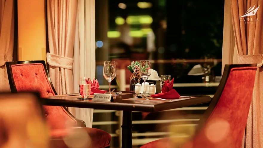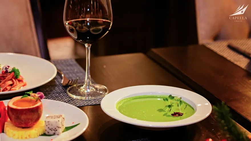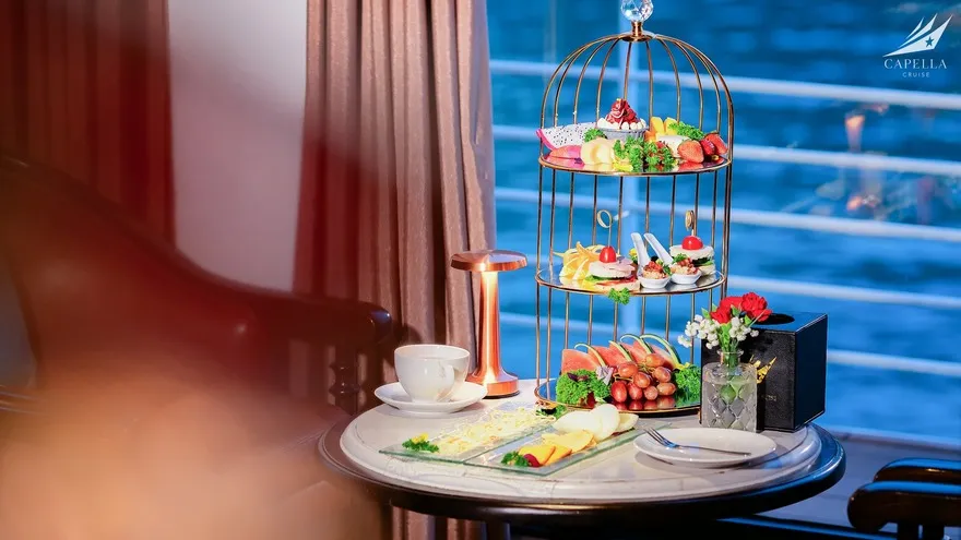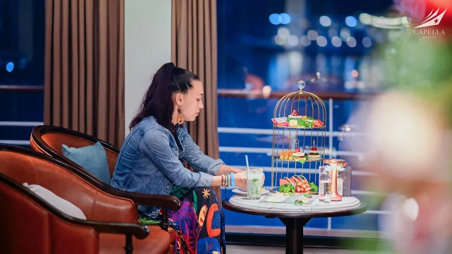 Nghệ thuật ẩm thực tại nhà hàng Harmony of the Sea (tầng 2) cũng là một điểm nhấn không thể bỏ qua. Với sức chứa gần 100 khách và thiết kế mở, đây là nơi diễn ra các bữa tiệc Fusion tinh tế, kết hợp hải sản địa phương tươi ngon với phong cách chế biến quốc tế. Capella còn thể hiện sự thấu cảm tuyệt vời khi phục vụ các thực đơn Halal và thực đơn Chay được thiết kế riêng biệt, đảm bảo sự trân trọng đối với mọi bản sắc văn hóa. Buổi chiều, buổi tiệc trà hoàng hôn trên Sundeck sẽ là khoảng nghỉ bình yên để bạn thưởng thức hương vị trà đạo Việt Nam khi vạn vật dần chuyển mình sang màu đỏ tía.