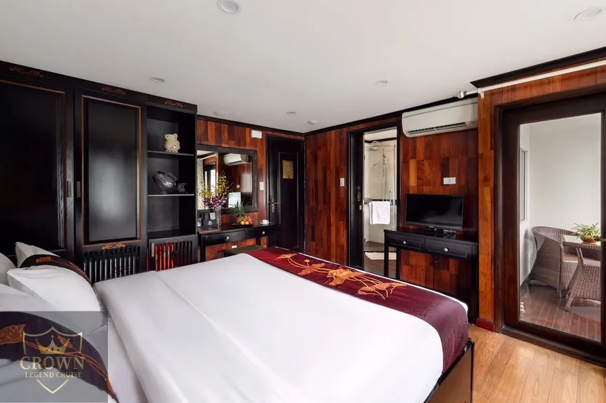 Hệ thống 26 cabin nghỉ dưỡng là niềm tự hào của Crown Legend với cam kết 100% phòng sở hữu ban công riêng biệt và cửa kính kịch trần đón ánh sáng tự nhiên. Du khách có thể lựa chọn hạng phòng Junior Ocean View tại tầng 2 hoặc Senior Ocean View tại tầng 3 với không gian nghỉ ngơi yên tĩnh, được trang bị đầy đủ Smart TV, mini bar và nội thất gỗ trầm ấm. Đặc biệt, hạng phòng VIP Suite mang đến sự xa hoa tối thượng với bồn sục Jacuzzi riêng ngay trong phòng, cho phép du khách vừa thư giãn trong làn nước ấm vừa ngắm nhìn những rặng núi đá vôi hùng vĩ qua khung cửa sổ kính lớn.