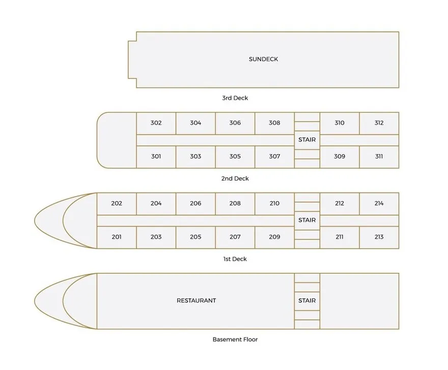 Về mặt cấu trúc, du thuyền gồm 4 tầng chức năng chính và một tầng hầm được bố trí khoa học để tối ưu hóa không gian và sự riêng tư cho tối đa 70 khách. Tầng hầm và tầng 1 là nơi đặt khu vực kỹ thuật, bếp và hệ thống nhà hàng sang trọng chuyên phục vụ các bữa tiệc ẩm thực đẳng cấp. Khu vực lưu trú tập trung tại tầng 2 và tầng 3, trong khi tầng 4 được thiết kế làm boong tắm nắng (Sundeck) lộ thiên hoàn toàn với tầm nhìn 360 độ bao quát toàn vịnh, tích hợp quầy bar ngoài trời và không gian tập Tai Chi mỗi sớm mai.