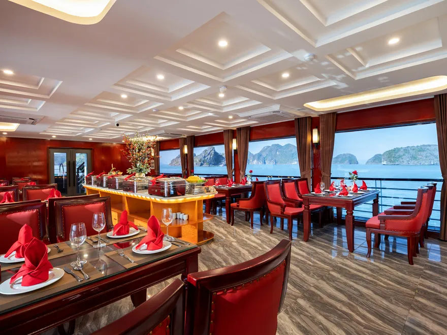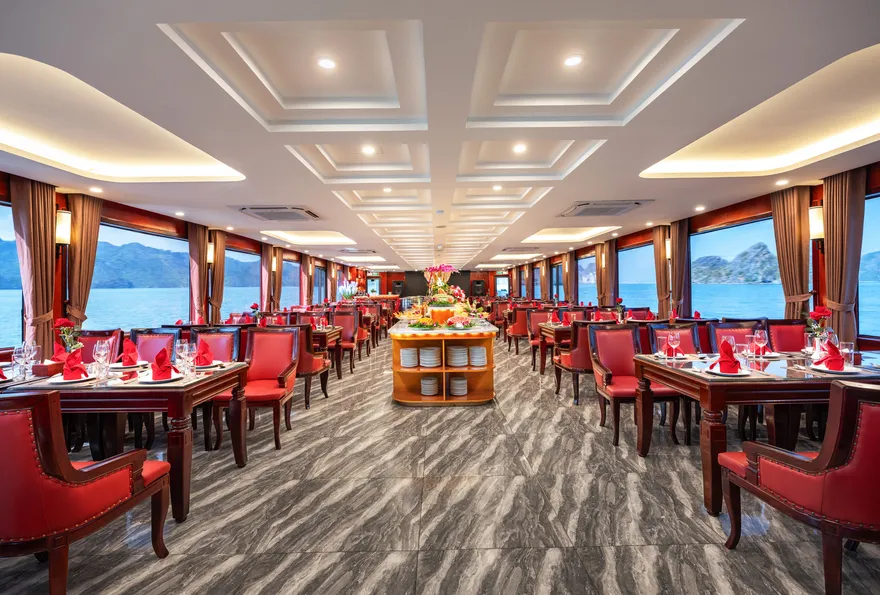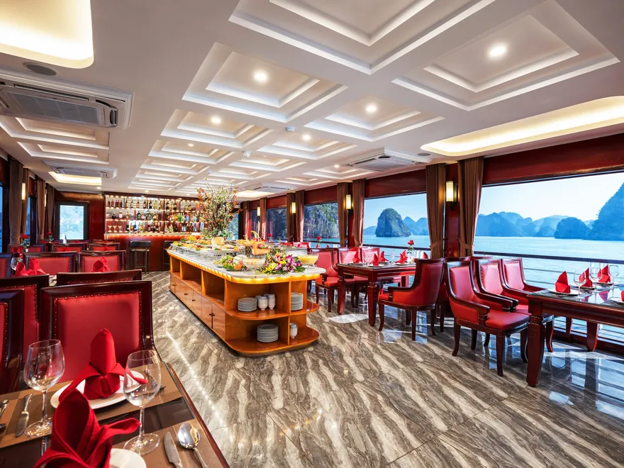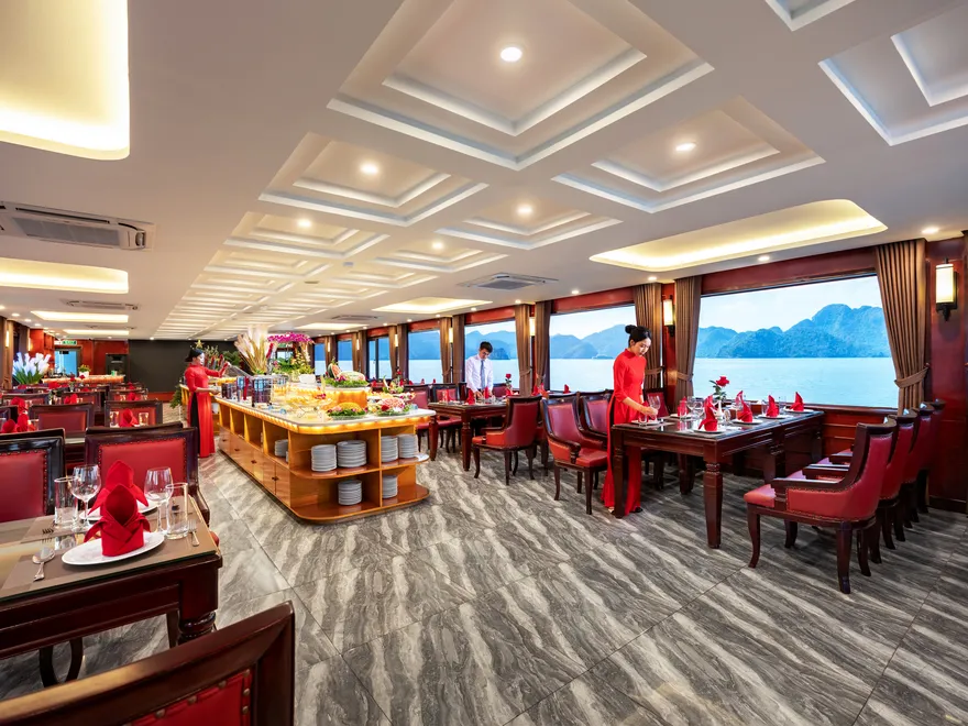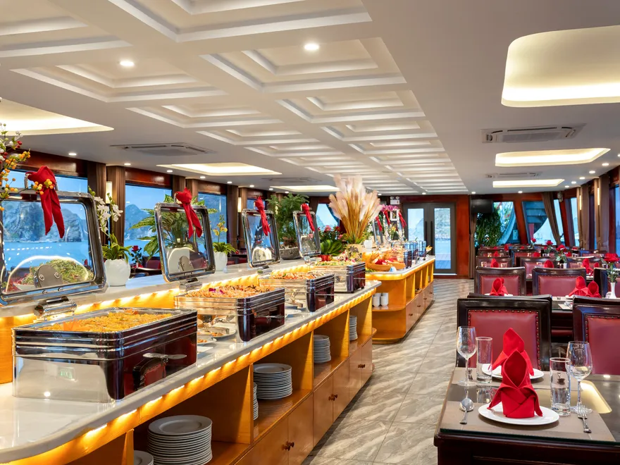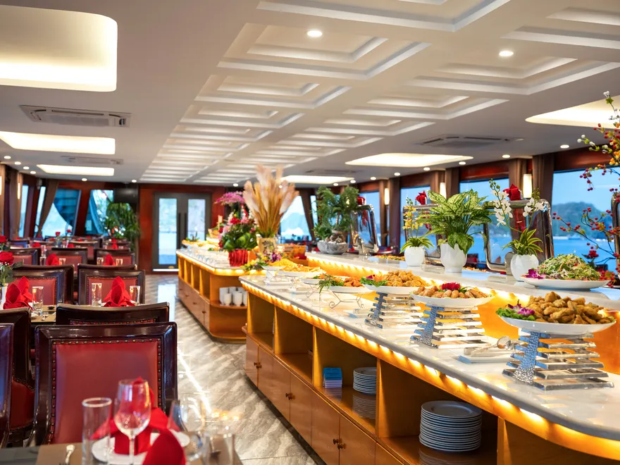 Trọng tâm của trải nghiệm ẩm thực đêm là bữa tối buffet đa dạng, nơi thực khách được chiều chuộng vị giác bởi những loại hải sản tươi ngon đặc trưng của vùng biển Quảng Ninh kết hợp cùng tinh hoa ẩm thực truyền thống Việt Nam trong không gian âm nhạc du dương. Khi dạ tiệc bắt đầu, sự yên bình nhường chỗ cho sự sôi động với chương trình giải trí đỉnh cao gồm nhạc DJ thời thượng và những màn trình diễn vũ đạo đầy cuốn hút trên khu vực sundeck. Đây là lúc du khách có thể hòa mình vào giai điệu hiện đại, tận hưởng bầu không khí lễ hội giữa không gian ngắm vịnh về đêm tuyệt mỹ.