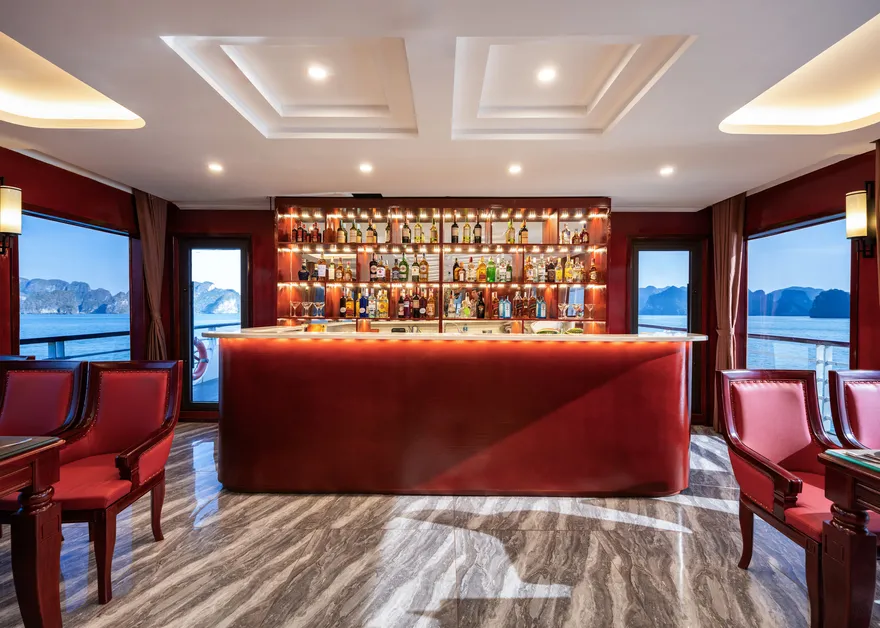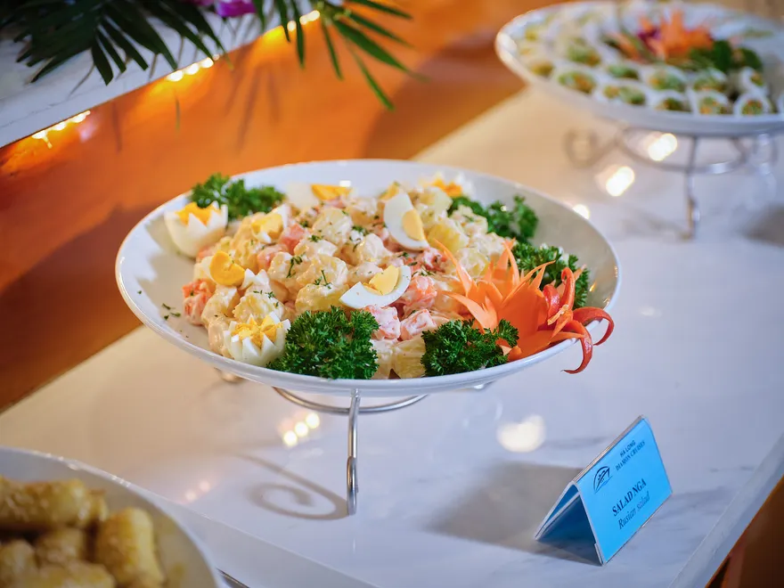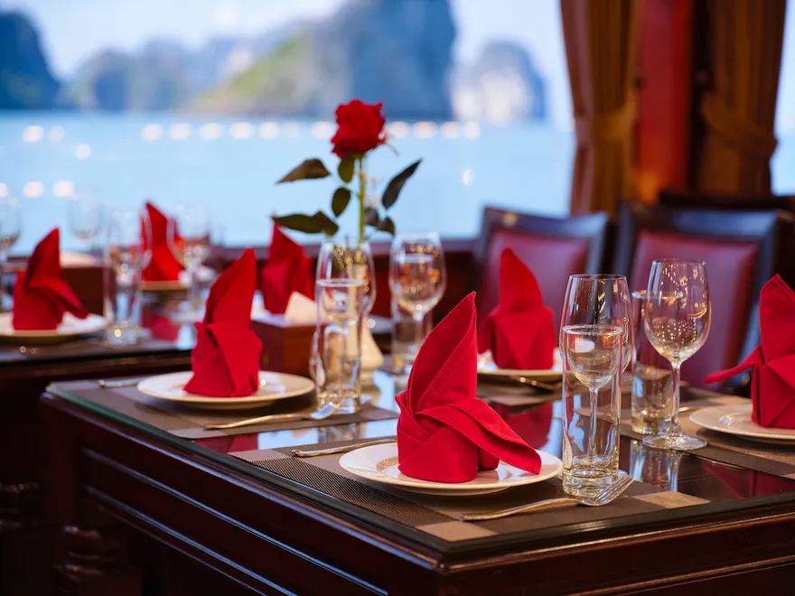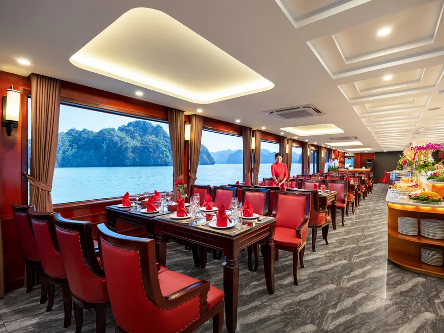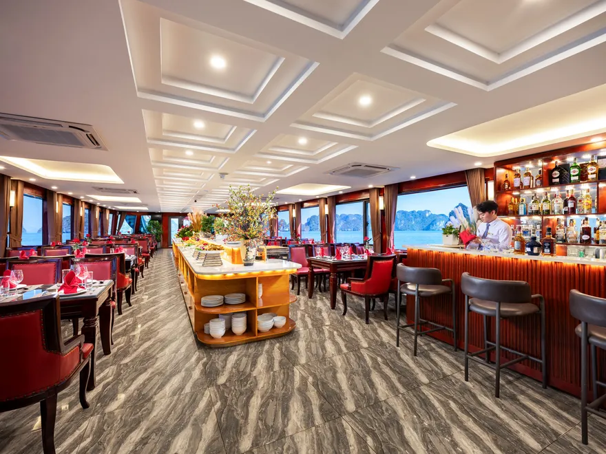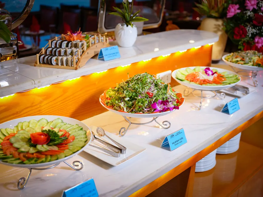 Trọng tâm của trải nghiệm ẩm thực đêm là bữa tối buffet đa dạng, nơi thực khách được chiều chuộng vị giác bởi những loại hải sản tươi ngon đặc trưng của vùng biển Quảng Ninh kết hợp cùng tinh hoa ẩm thực truyền thống Việt Nam trong không gian âm nhạc du dương. Khi dạ tiệc bắt đầu, sự yên bình nhường chỗ cho sự sôi động với chương trình giải trí đỉnh cao gồm nhạc DJ thời thượng và những màn trình diễn vũ đạo đầy cuốn hút trên khu vực sundeck. Đây là lúc du khách có thể hòa mình vào giai điệu hiện đại, tận hưởng bầu không khí lễ hội giữa không gian ngắm vịnh về đêm tuyệt mỹ.