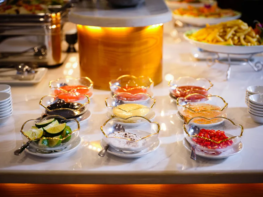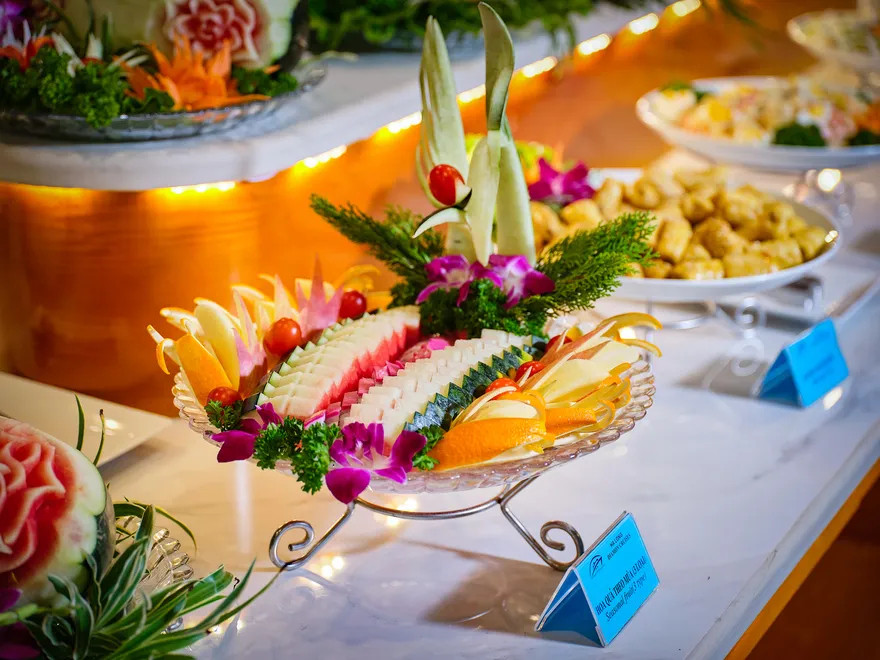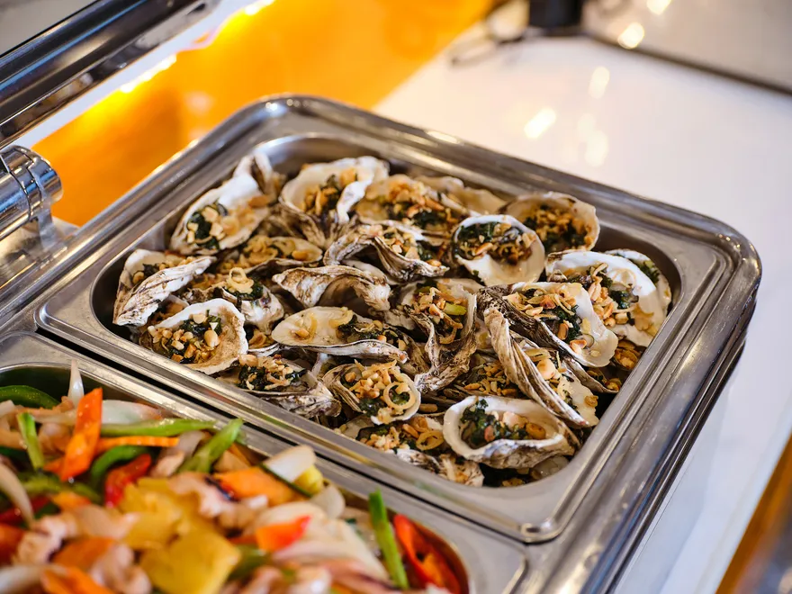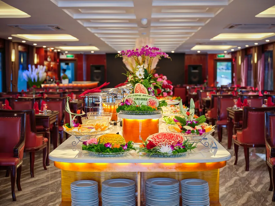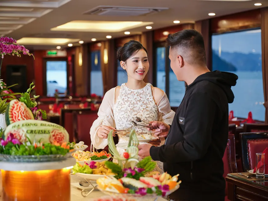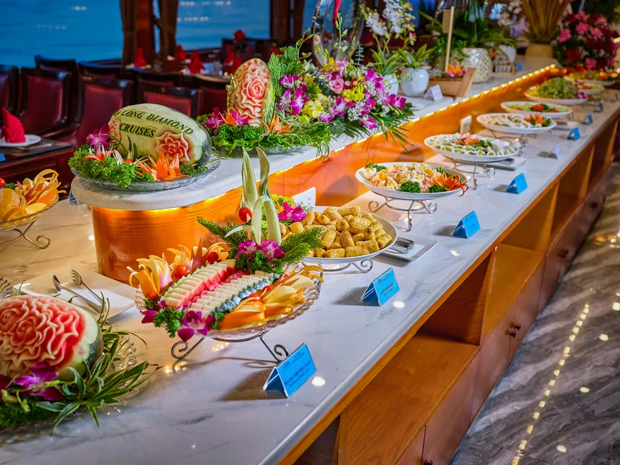 Ẩm thực trên Ha Long Diamond Cruises không chỉ là một bữa ăn, mà là một hành trình khám phá phong vị biển cả đầy tinh tế. Điểm nhấn rực rỡ nhất chính là bữa tiệc buffet hải sản thượng hạng với thực đơn phong phú, nơi du khách được thưởng thức trọn vẹn tinh túy của vùng biển Quảng Ninh. Những món ăn đặc sắc như hàu nướng mỡ hành béo ngậy , tôm hấp nước dừa thanh ngọt , hay mực xào ngũ sắc giòn dai sần sật luôn là tâm điểm của bàn tiệc. Từng nguyên liệu tươi rói được chế biến tỉ mỉ bởi các đầu bếp tài hoa, mang đến một trải nghiệm thịnh soạn giữa khung cảnh hùng vĩ của vịnh di sản.