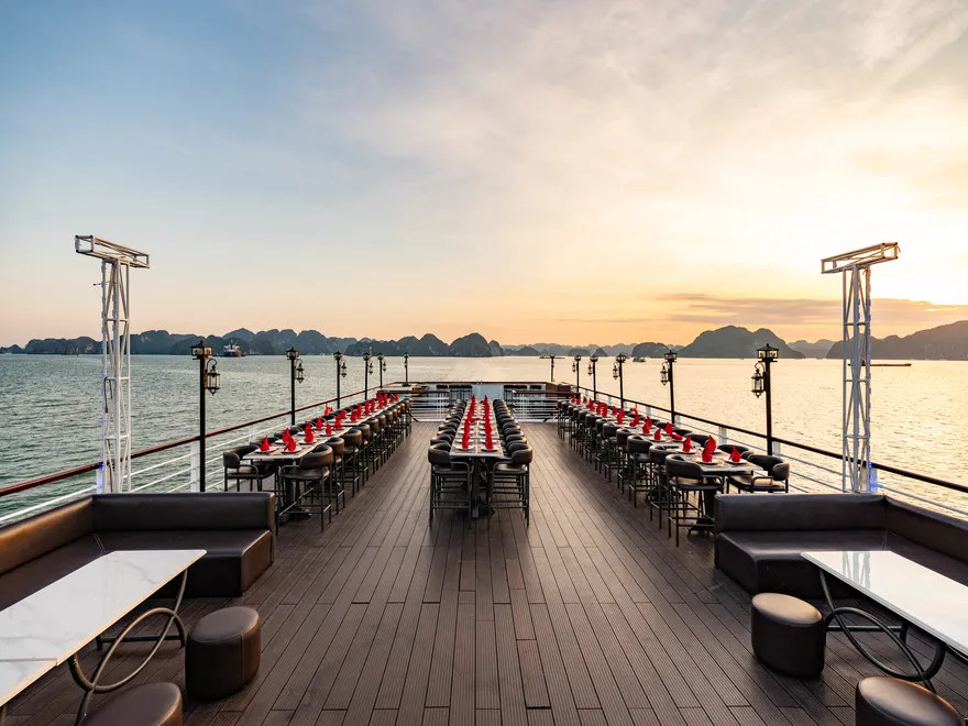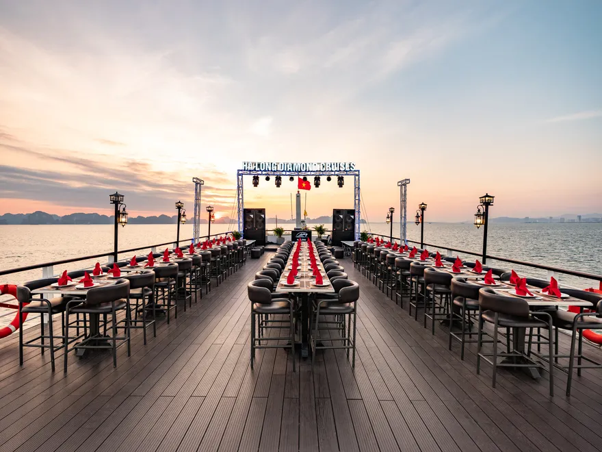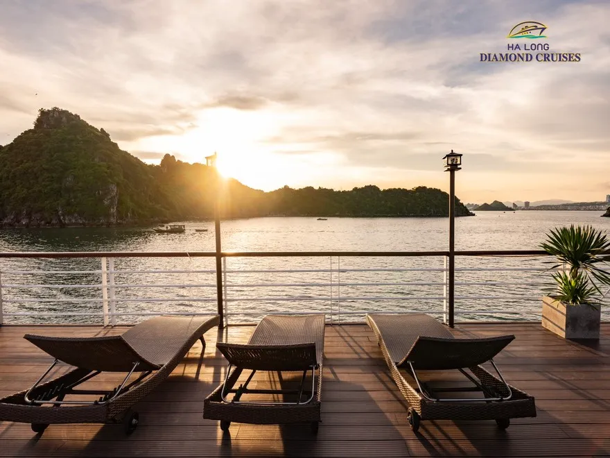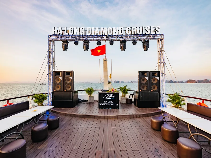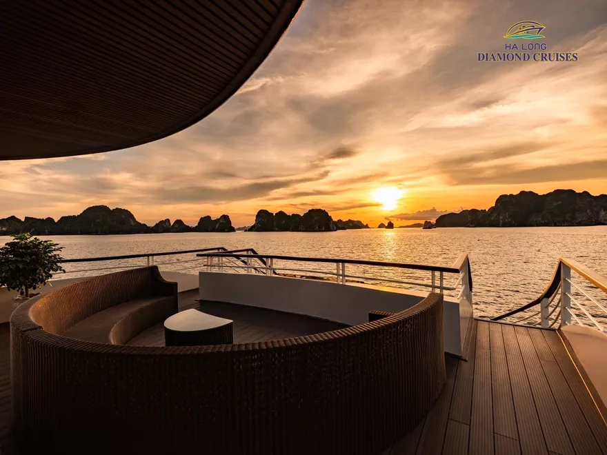 Tầng ba, hay còn gọi là Sundeck, được thiết kế như một không gian mở hoàn toàn, mang lại tầm nhìn 360 độ bao quát toàn bộ Vịnh Hạ Long. Đây là điểm cao nhất của du thuyền, nơi lý tưởng để đón nhận làn gió biển trong lành và quan sát các đảo đá vôi từ trên cao. Sundeck cũng là địa điểm chiến lược diễn ra bữa tiệc hoàng hôn (Sunset Party) với trà, trái cây và nhạc DJ sôi động, tạo nên những khoảnh khắc kết thúc hành trình đầy cảm xúc dưới ánh sáng vàng rực rỡ của vịnh khi chiều buông . Sự kết hợp giữa hạ tầng kỹ thuật tân tiến và cách bố trí không gian thông minh đã biến Diamond Cruise thành một thực thể kiến trúc hoàn mỹ, nâng tầm trải nghiệm du lịch di sản lên một đẳng cấp mới.