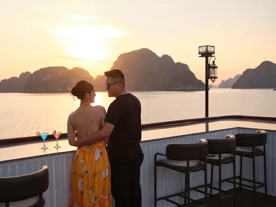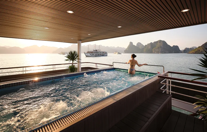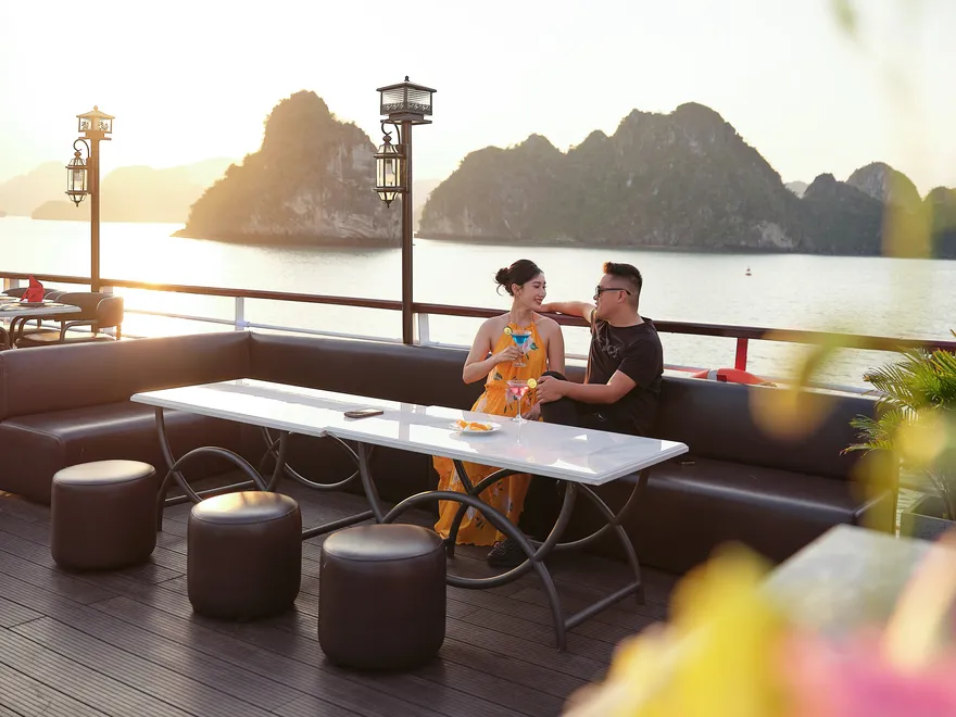 Khi hành trình dần khép lại và tàu quay trở về bến cảng, không gian Sundeck trở nên sôi động hơn bao giờ hết với bữa tiệc hoàng hôn (Sunset Party) đầy cảm xúc. Trong ánh sáng vàng rực rỡ buổi chiều tà, du khách có thể nhâm nhi tách trà, thưởng thức trái cây và đồ nhẹ trong giai điệu âm nhạc DJ sống động. Đây cũng là lúc lý tưởng nhất để bạn ngâm mình trong bể sục Jacuzzi bốn mùa, vừa thư giãn cơ thể vừa tận hưởng không khí lãng mạn của kỳ quan biển trời khi hoàng hôn buông xuống trước khi kết thúc một ngày hành trình trọn vẹn.