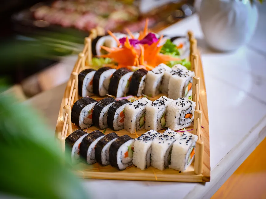 1.2 Các món cuốn & bánh: Cơm cuộn sushi (thập cẩm và chay), nem hải sản Hạ Long, phở cuốn (thập cẩm và chay) và bánh Pizza chay .