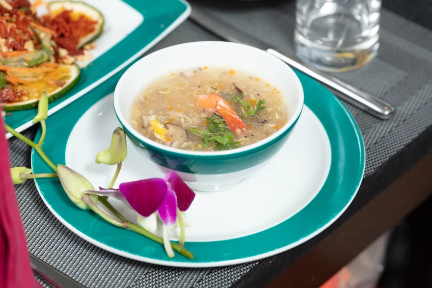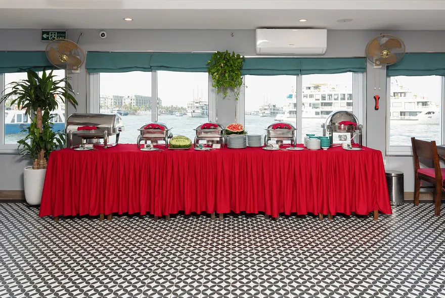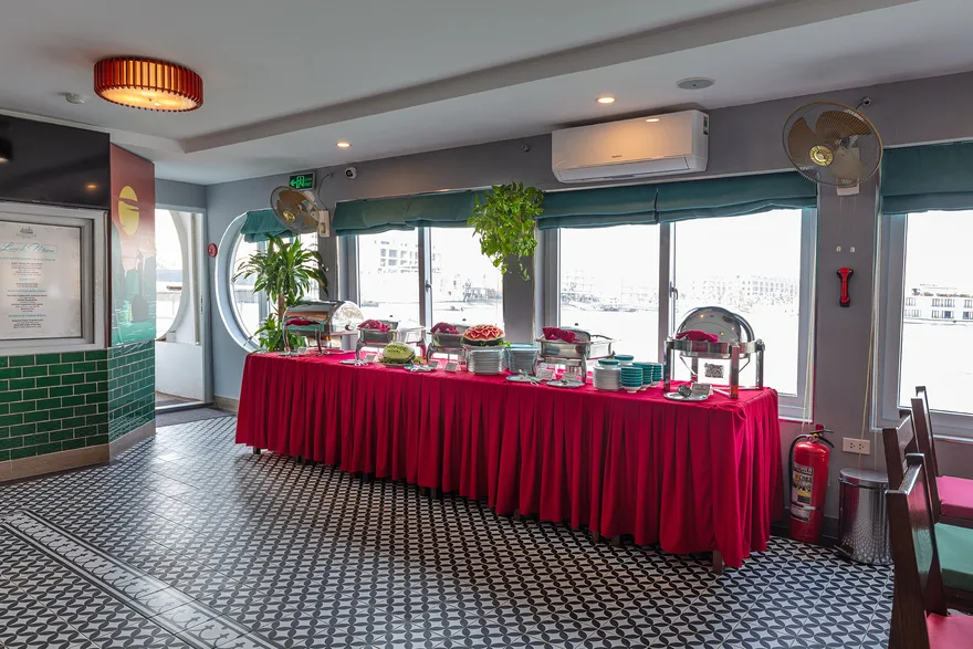 Trải nghiệm trên Emeraude Sayuri được thiết kế để mang lại sự hài lòng tối đa thông qua hệ thống dịch vụ và tiện ích đẳng cấp, mang đến cho du khách một chuyến tham quan Vịnh Hạ Long vô cùng phong cách. Điểm nhấn ẩm thực nằm tại không gian nhà hàng sang trọng, nơi du khách có thể thưởng thức bữa trưa tinh tế được chuẩn bị chu đáo theo hình thức Set menu hoặc Buffet đa dạng. Để nâng tầm trải nghiệm, quầy bar chuyên nghiệp trên tàu luôn sẵn sàng phục vụ danh mục đồ uống phong phú, bao gồm các loại rượu vang tuyển chọn, các món cocktails, mocktails đầy cảm hứng cùng nhiều loại nước giải khát khác.
