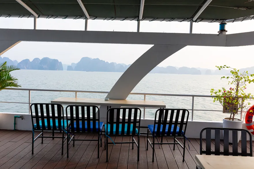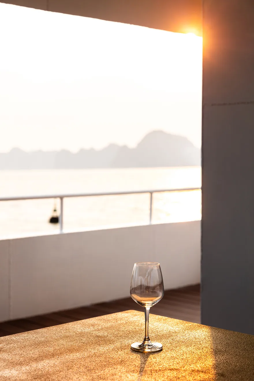 Thiết kế của Emeraude Sayuri là sự tôn vinh tuyệt đối dành cho triết lý tối giản Minimalism, nơi mỗi đường nét đều được tinh lọc để tạo nên một vẻ đẹp thanh lịch và tinh tế. Bằng cách loại bỏ những chi tiết trang trí rườm rà, con tàu tập trung vào việc làm nổi bật giá trị cốt lõi: sự giao hòa giữa không gian nhân tạo và kỳ quan thiên nhiên vùng vịnh. Điểm nhấn ấn tượng trong không gian nội thất chính là hệ thống cửa sổ kính lớn được bố trí thông minh, giúp tối ưu hóa tầm nhìn của du khách ở mọi góc độ. Sự kết hợp hài hòa giữa bảng màu trang nhã và các vật liệu cao cấp không chỉ mang lại cảm giác sang trọng mà còn tạo ra một môi trường nghỉ dưỡng thư thái, nhẹ nhàng, đậm chất thẩm mỹ Nhật Bản. Cấu trúc tổng thể của tàu được phân bổ hợp lý trên 2 tầng (2 floors), một thiết kế nhằm tối ưu hóa diện tích sinh hoạt và trải nghiệm ngắm cảnh. Với bố cục này, hành khách có thể dễ dàng di chuyển giữa các khu vực để tìm cho mình một góc riêng tư lý tưởng, nơi có thể thu trọn vào tầm mắt vẻ đẹp hùng vĩ của Vịnh Hạ Long một cách trọn vẹn nhất.