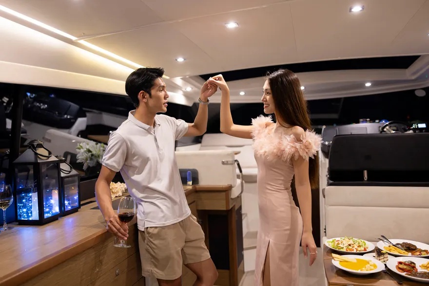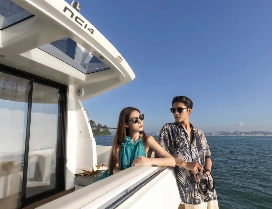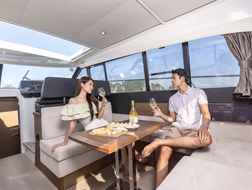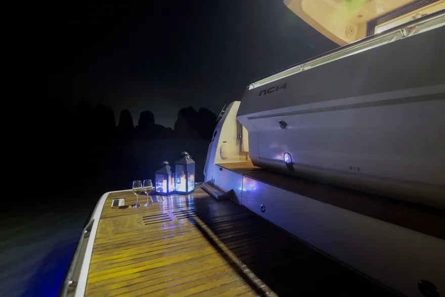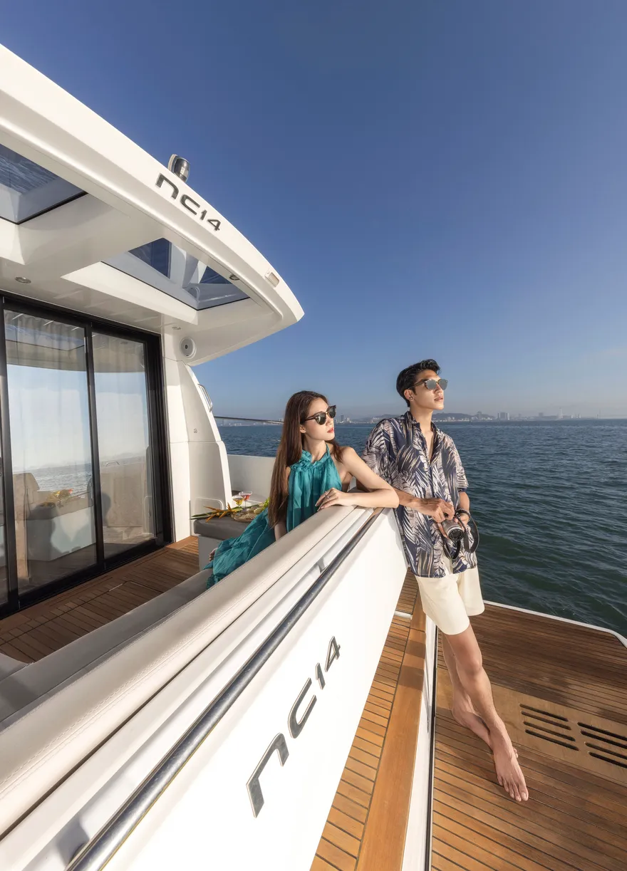 Với thiết kế boong đơn mức và hệ thống cửa kính ba lớp mở rộng hoàn toàn, NC 14 biến toàn bộ khu vực salon và khoang lái thành một đài quan sát 360 độ lý tưởng để thưởng ngoạn khoảnh khắc mặt trời lặn. Bạn có thể thư giãn trên những dãy ghế sofa êm ái, nhâm nhi ly vang nổ cùng set trái cây nhiệt đới trong khi lắng nghe những bản nhạc nhẹ nhàng hòa cùng tiếng sóng. Sự tĩnh lặng của không gian lúc này chính là liệu pháp tinh thần vô giá cho những tâm hồn đang tìm kiếm sự bình yên.