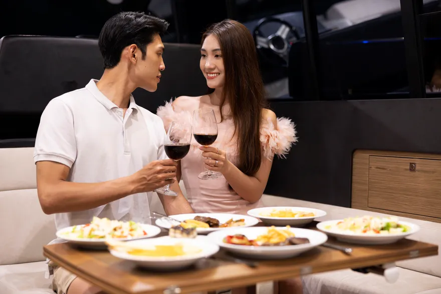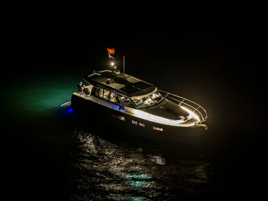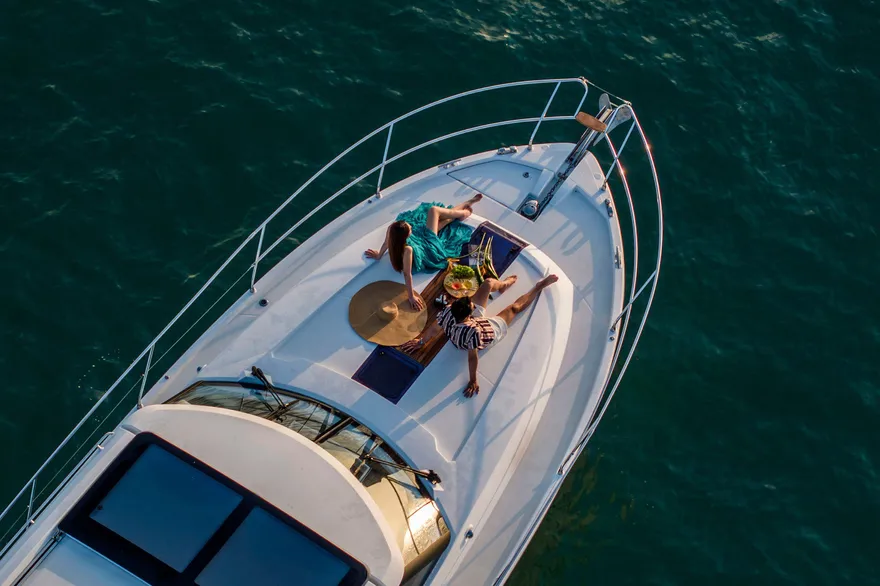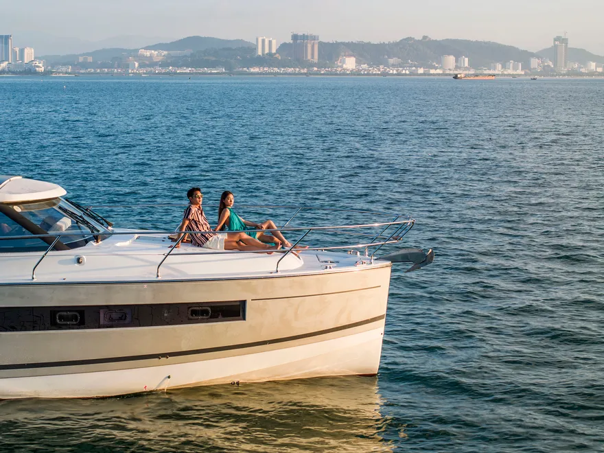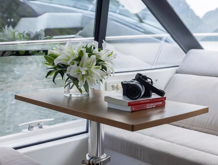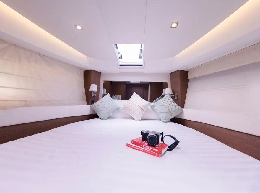Với thiết kế boong đơn mức và hệ thống cửa kính ba lớp mở rộng hoàn toàn, NC 14 biến toàn bộ khu vực salon và khoang lái thành một đài quan sát 360 độ lý tưởng để thưởng ngoạn khoảnh khắc mặt trời lặn. Bạn có thể thư giãn trên những dãy ghế sofa êm ái, nhâm nhi ly vang nổ cùng set trái cây nhiệt đới trong khi lắng nghe những bản nhạc nhẹ nhàng hòa cùng tiếng sóng. Sự tĩnh lặng của không gian lúc này chính là liệu pháp tinh thần vô giá cho những tâm hồn đang tìm kiếm sự bình yên.