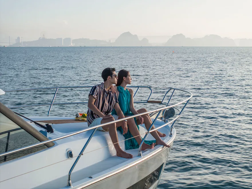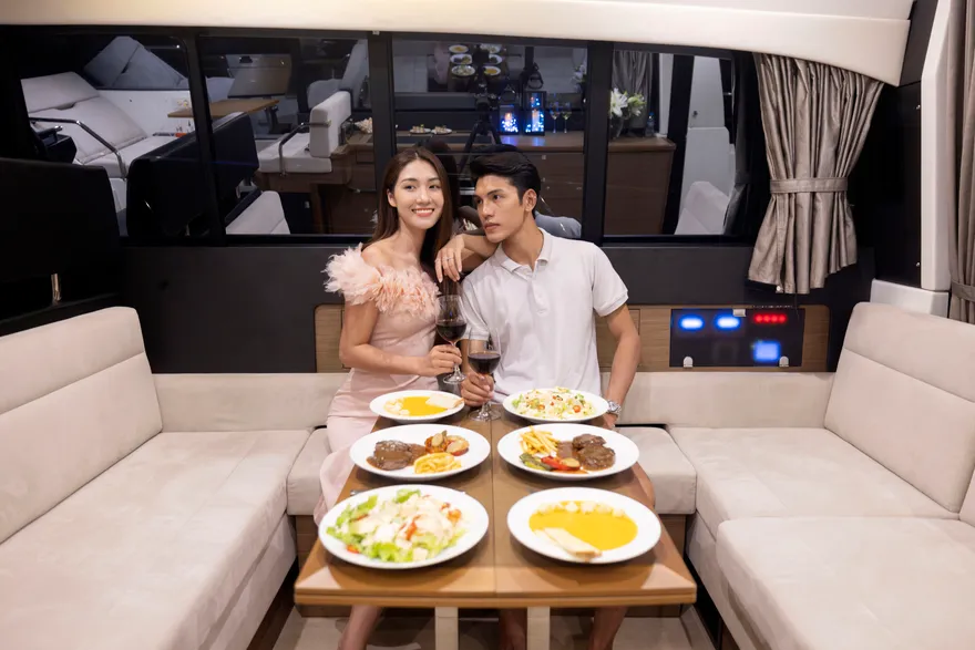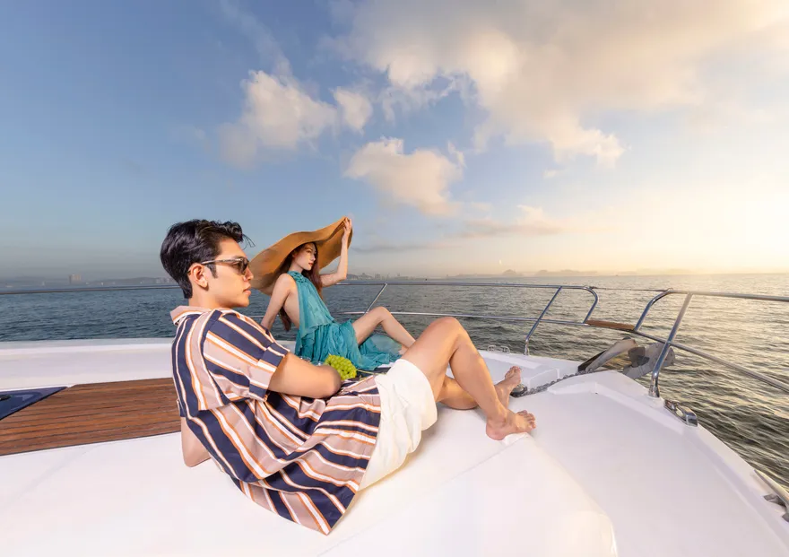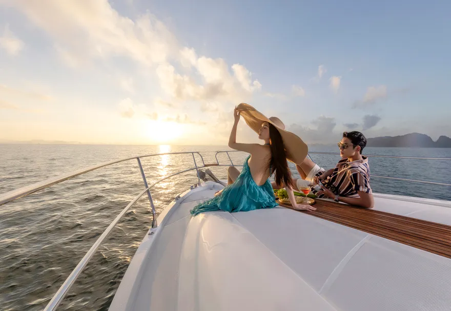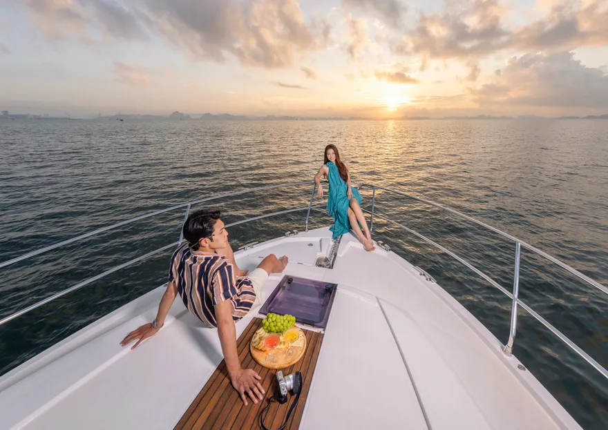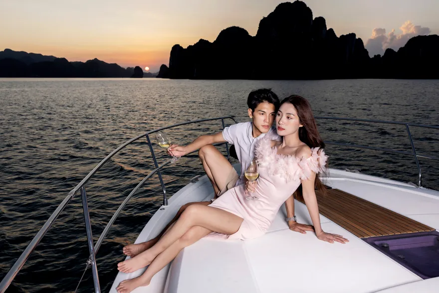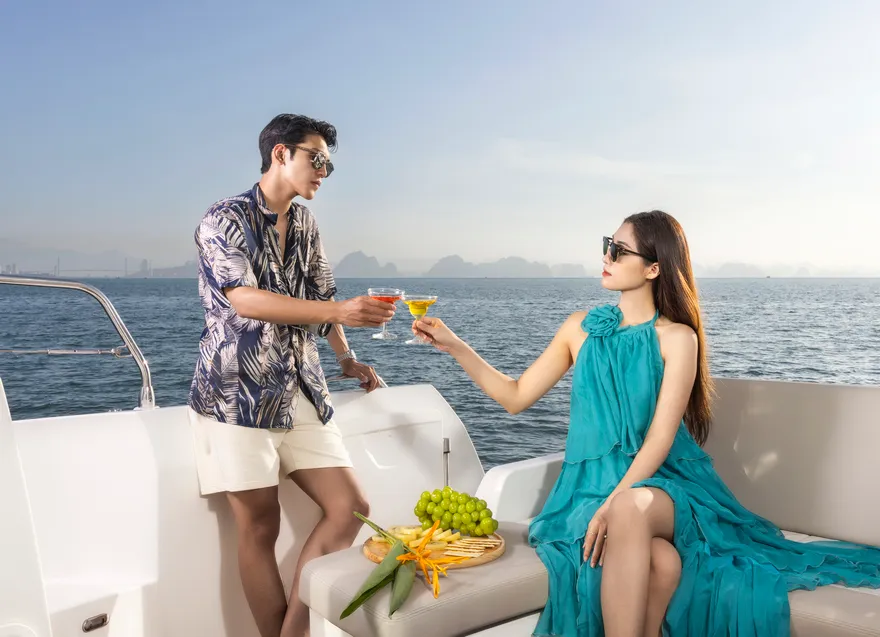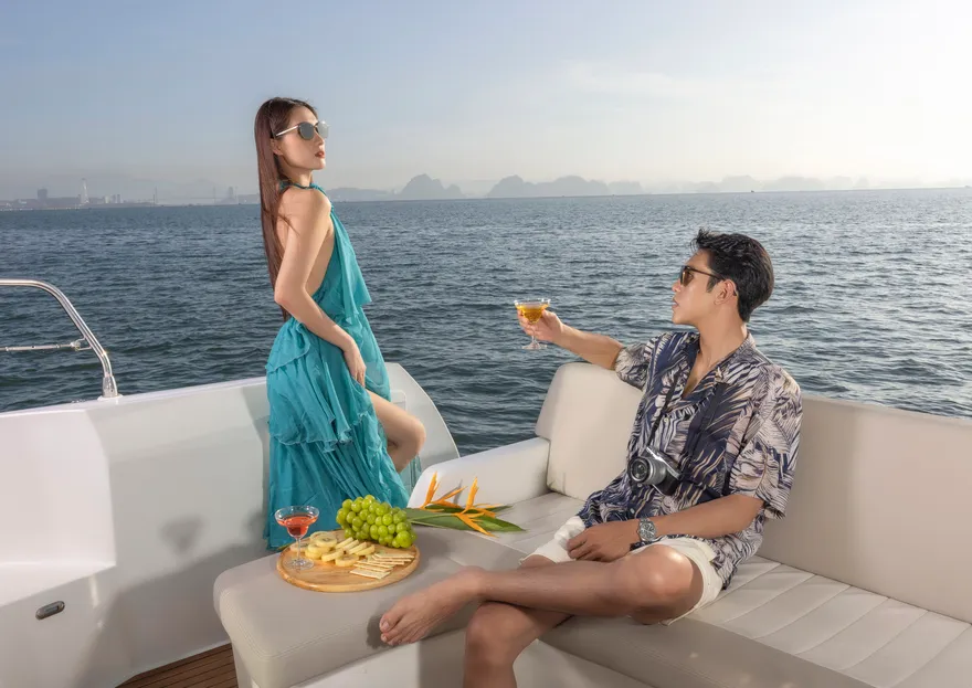 Để hành trình thêm phần thăng hoa, một chai vang nổ (Sparkling wine) cùng set quà tặng “Hương vị nhiệt đới” sẽ được phục vụ ngay trên boong tàu để bạn nhâm nhi trong tiếng nhạc yêu thích . Trên đường quay trở về, du thuyền sẽ đưa bạn đi qua hòn Ngón Tay và hòn Con Sâu đúng vào khoảnh khắc hoàng hôn buông xuống rực rỡ trên mặt vịnh. Một ngày trọn vẹn kết thúc bằng sự chăm sóc tận tâm của đội ngũ thuyền viên, để lại những dấu ấn khó phai về một kỳ nghỉ đẳng cấp và đầy cảm xúc