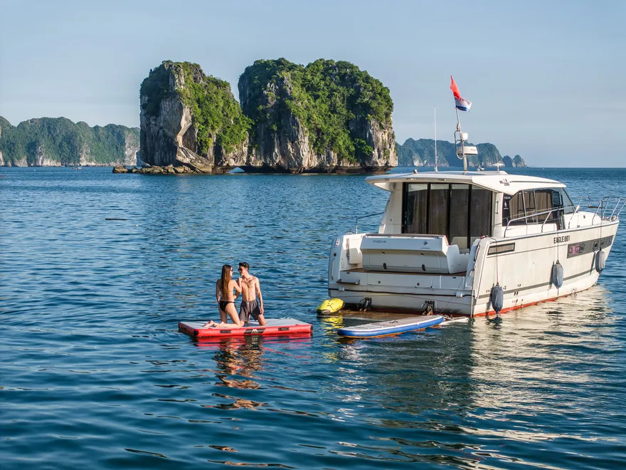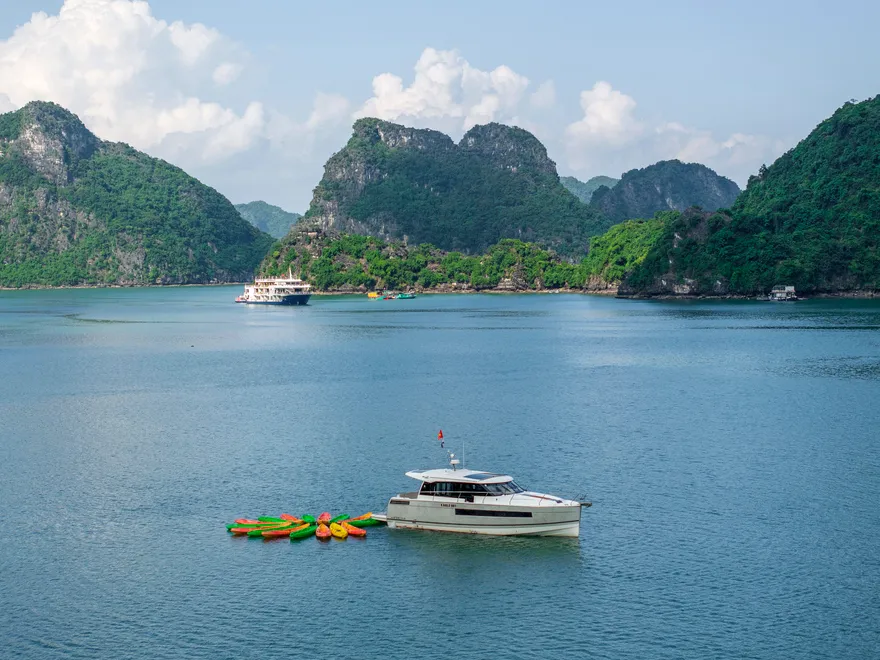Du thuyền dừng tại khu vực yên tĩnh. Quý khách tự do trải nghiệm bơi lội hoặc chèo Kayak khám phá vẻ đẹp nguyên sơ của vịnh