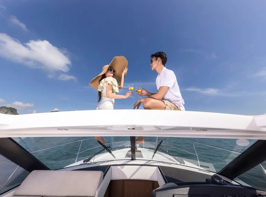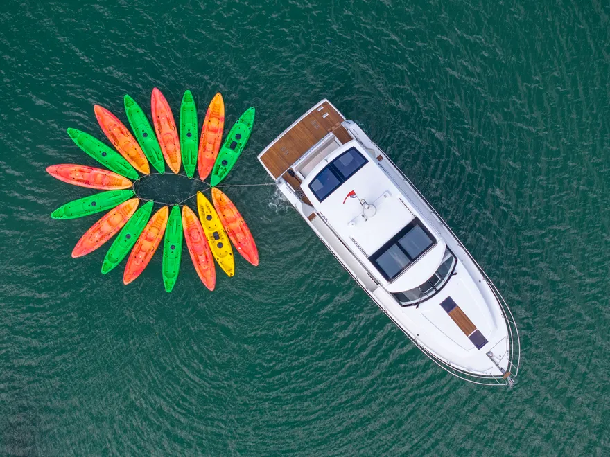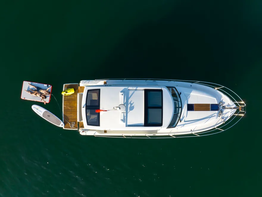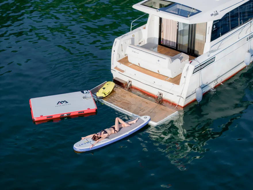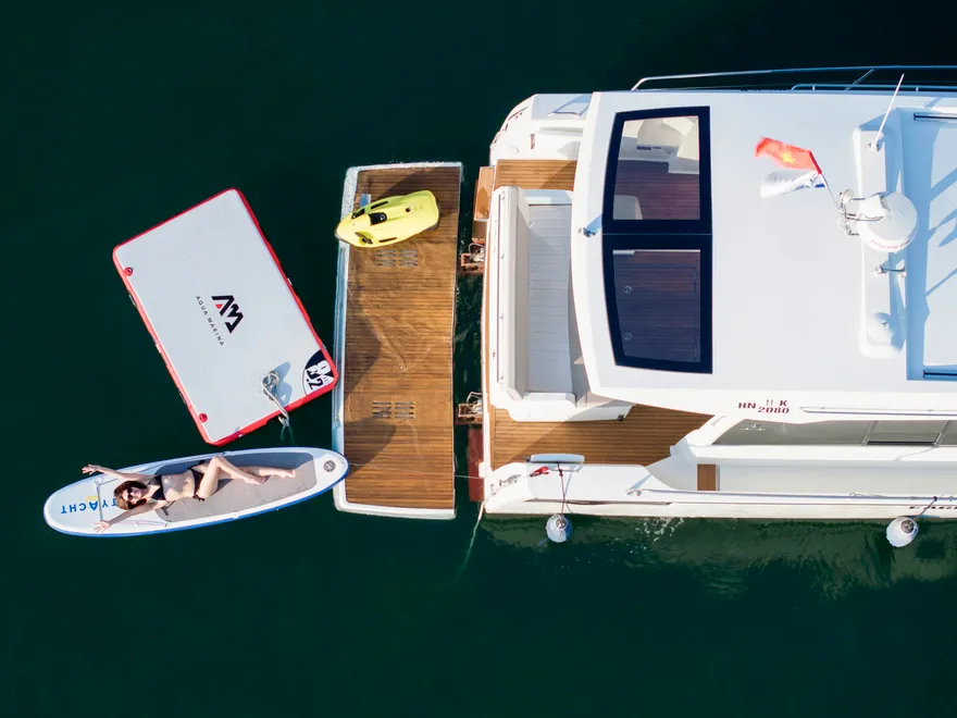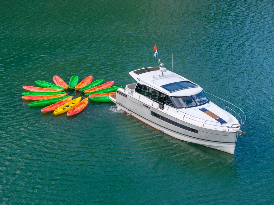 Hành trình còn trở nên thú vị hơn khi du thuyền dừng chân tại một khu vực vụng biển tĩnh lặng để bạn tự do trải nghiệm các hoạt động dưới nước. Tại đây, bạn có thể thả mình vào làn nước mát rượi để bơi lội hoặc chèo thuyền kayak len lỏi qua các chân núi đá, tận hưởng cảm giác tự do tuyệt đối giữa thiên nhiên hùng vĩ. Đây là lúc mọi ranh giới giữa con người và biển cả dường như được xóa nhòa, đúng như triết lý “New Concept” mà Jeanneau đã gửi gắm vào dòng du thuyền này.