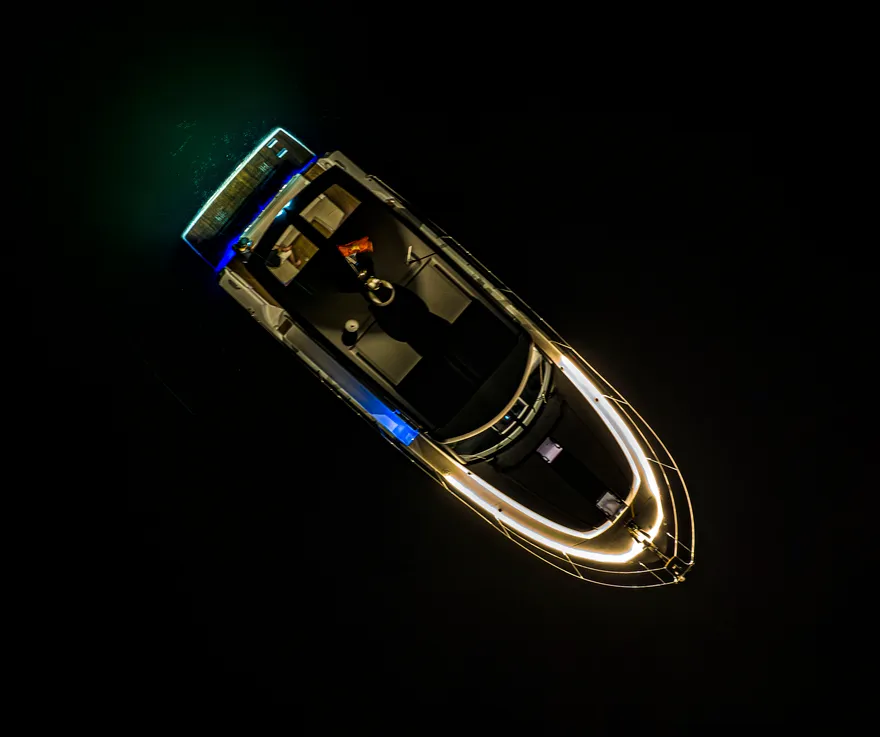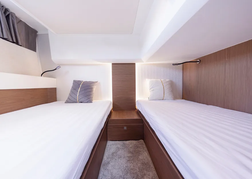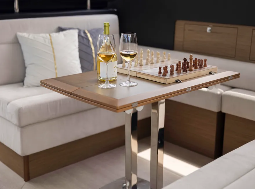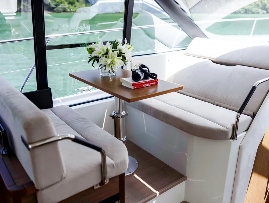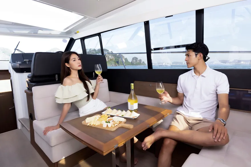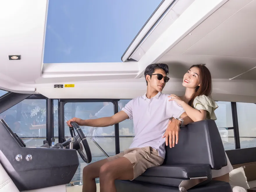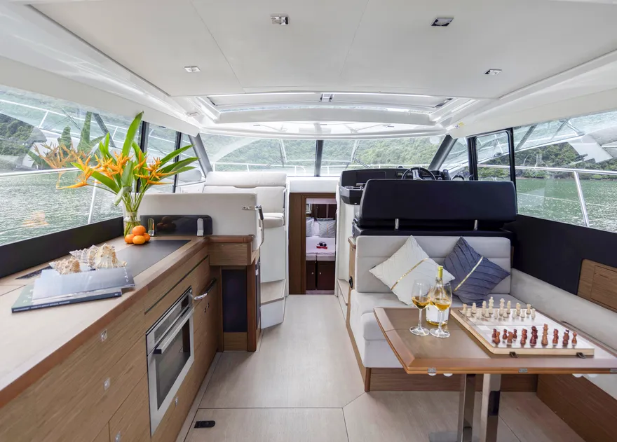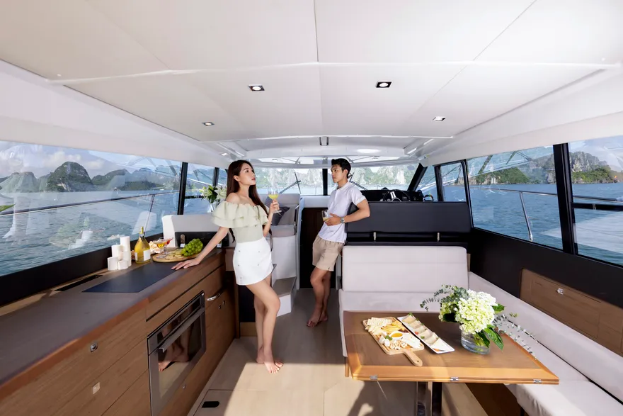 Sự tối ưu hóa không gian sống được thể hiện rõ nét qua cấu trúc boong đơn mức (single-level deck), một cuộc cách mạng trong việc xóa bỏ hoàn toàn các bậc tam cấp giữa khoang lái và salon. Thiết kế này tạo ra một dòng chảy không gian liền mạch, giúp người sử dụng di chuyển dễ dàng và cảm nhận được sự rộng rãi tối đa bên trong con tàu. Khi kết hợp với hệ thống cửa trượt bằng kính ba lớp, vách ngăn phía sau có thể được mở rộng hoàn toàn để biến khu vực salon và sàn sau thành một không gian sinh hoạt chung khổng lồ, mang lại trải nghiệm thực thụ của một “căn hộ trên mặt biển”.
