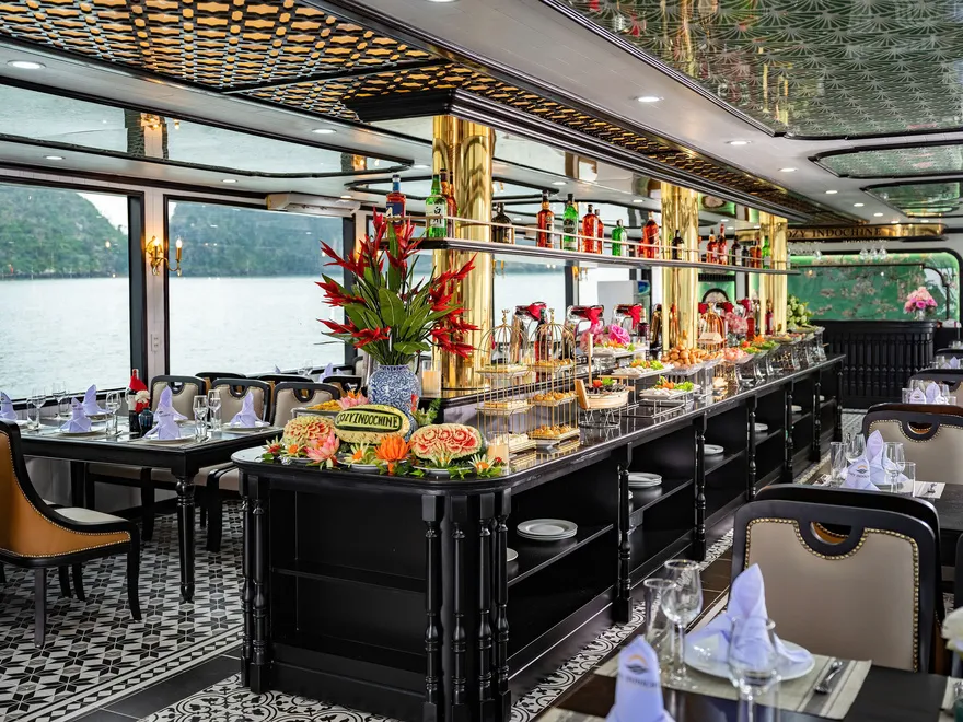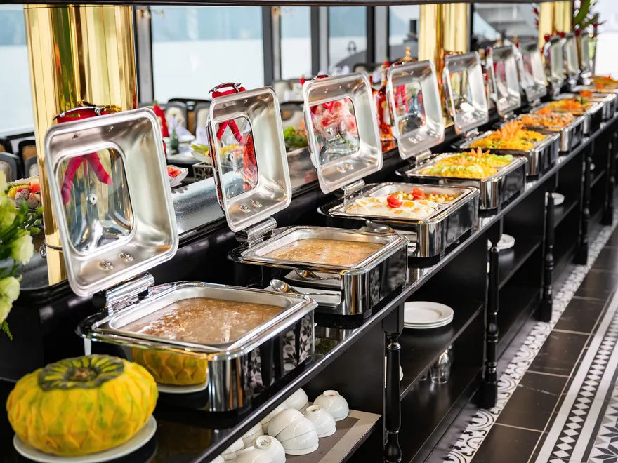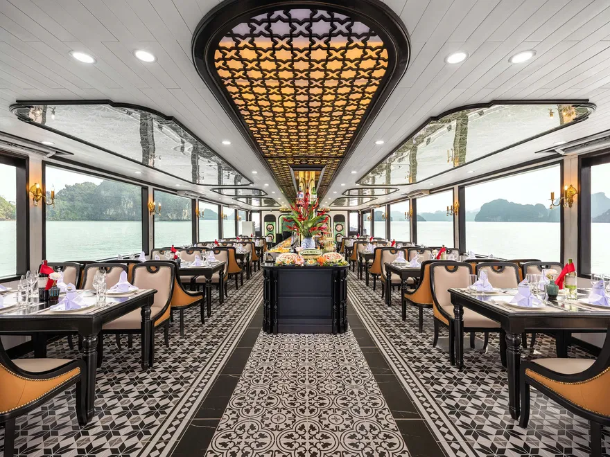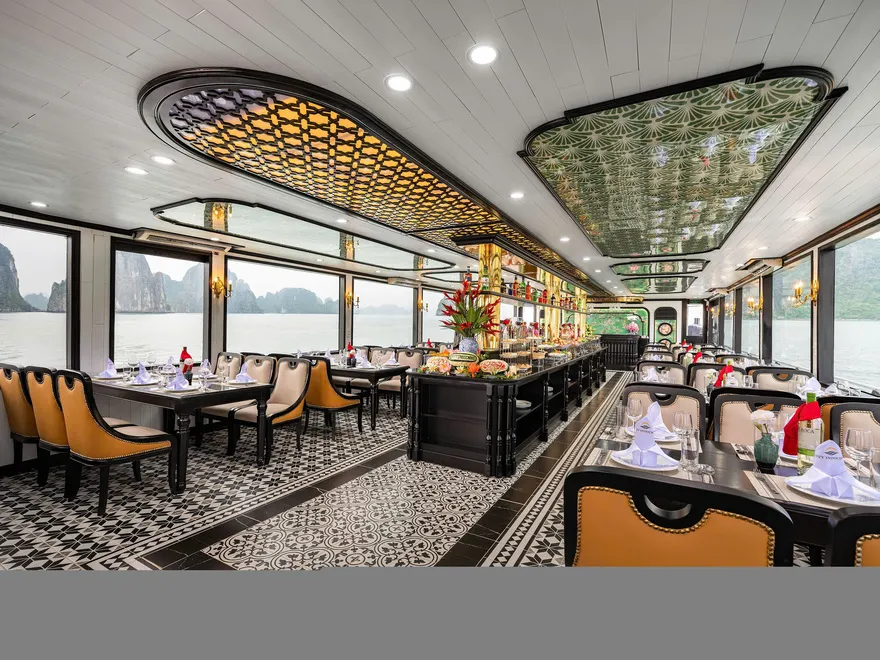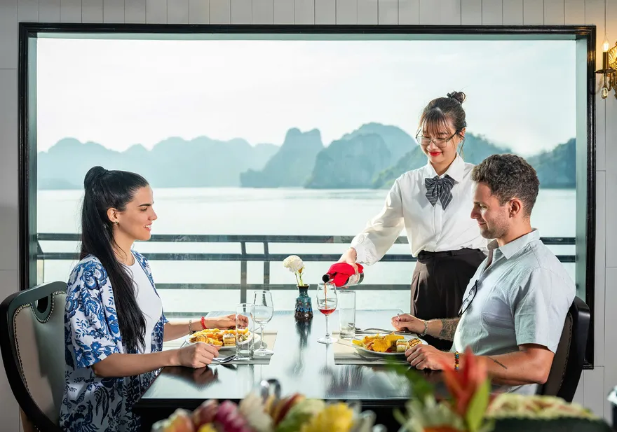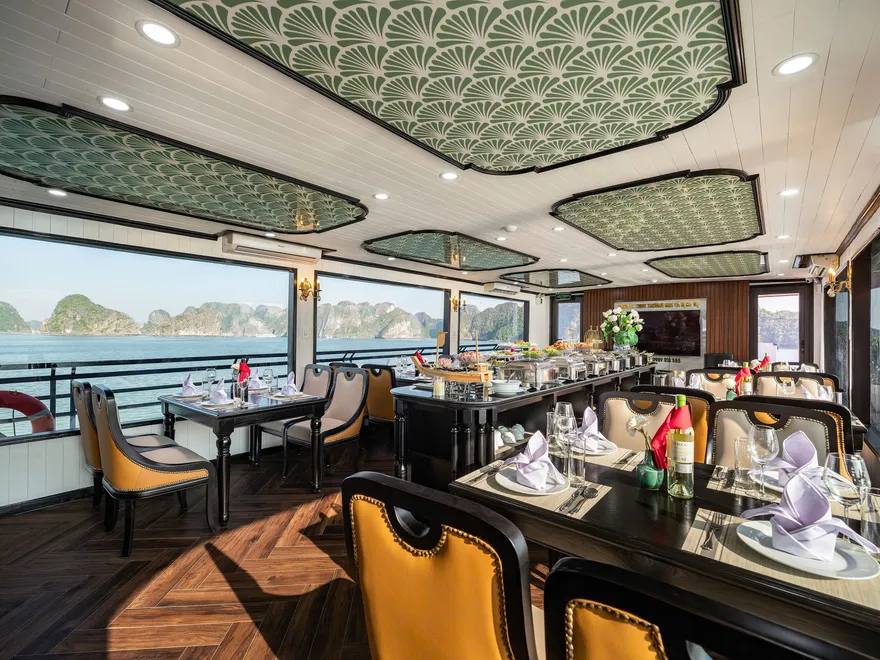 Nếu bạn là người yêu chuộng những mảng màu rực rỡ của hoàng hôn và muốn tận hưởng trọn vẹn sự chuyển mình đầy mê hoặc của thiên nhiên, hành trình chiều Tuyến II chính là một “bản giao hưởng” được viết riêng cho tâm hồn bạn. Thay vì khởi đầu vội vã vào sáng sớm, chuyến đi này cho phép bạn bắt nhịp với di sản một cách thư thái nhất. Ngay khi bước lên boong, hương vị trà welcome mát lạnh sẽ nhẹ nhàng gột rửa những bụi bặm của chặng đường dài, nhường chỗ cho một bữa trưa hải sản thịnh soạn. Đây là lúc vị giác được đánh thức, chuẩn bị năng lượng cho chuỗi hoạt động khám phá đầy cảm hứng phía trước.