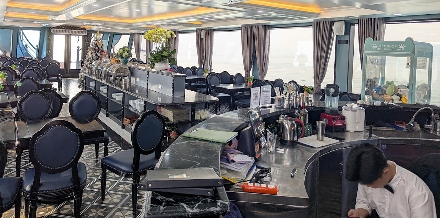 Sự thông minh trong vận hành của Pamela còn nằm ở cách phân tầng công năng cực kỳ khoa học, đáp ứng trọn vẹn mọi nhu cầu của du khách. Tầng 1 (Main Deck) đóng vai trò là “trái tim” với nhà hàng Ocean Heart và hệ thống bếp trung tâm, nơi phục vụ những bữa tiệc hải sản thịnh soạn. Tiến lên tầng 2 (Upper Deck), không gian trở nên khoáng đạt và riêng tư hơn với nhà hàng Sky Panorama cùng quầy bar cao cấp—địa điểm lý tưởng cho những cuộc trò chuyện sâu sắc bên ly vang trắng.